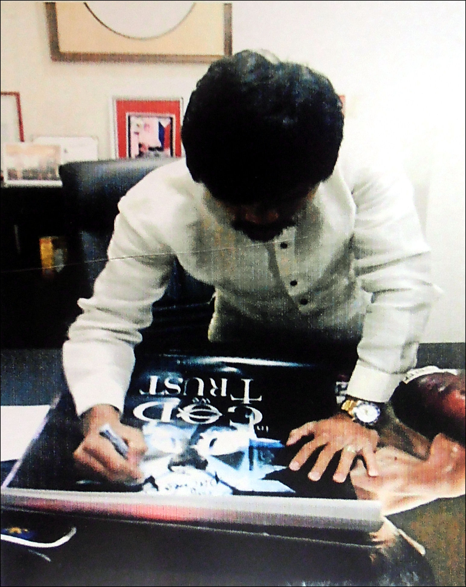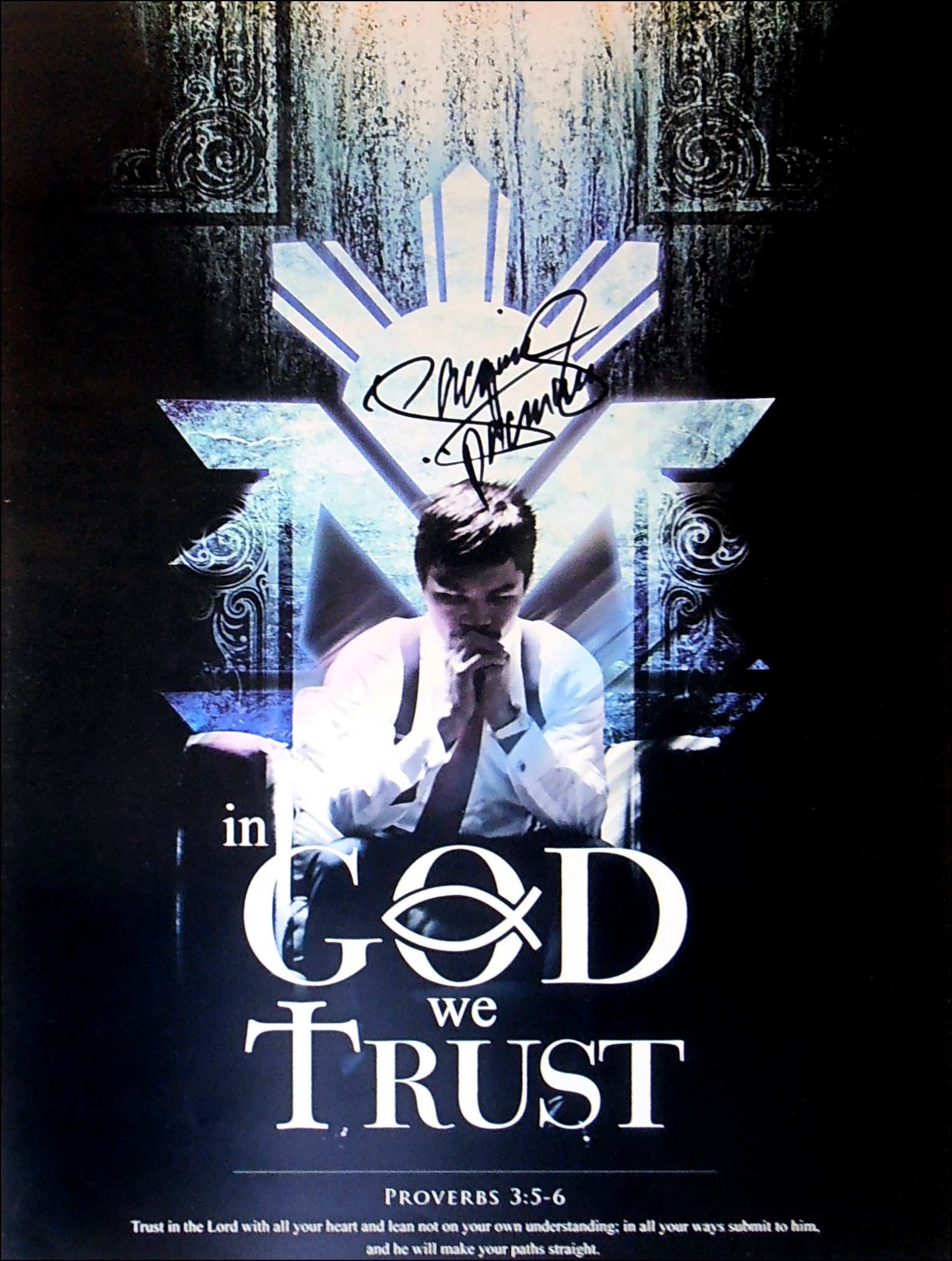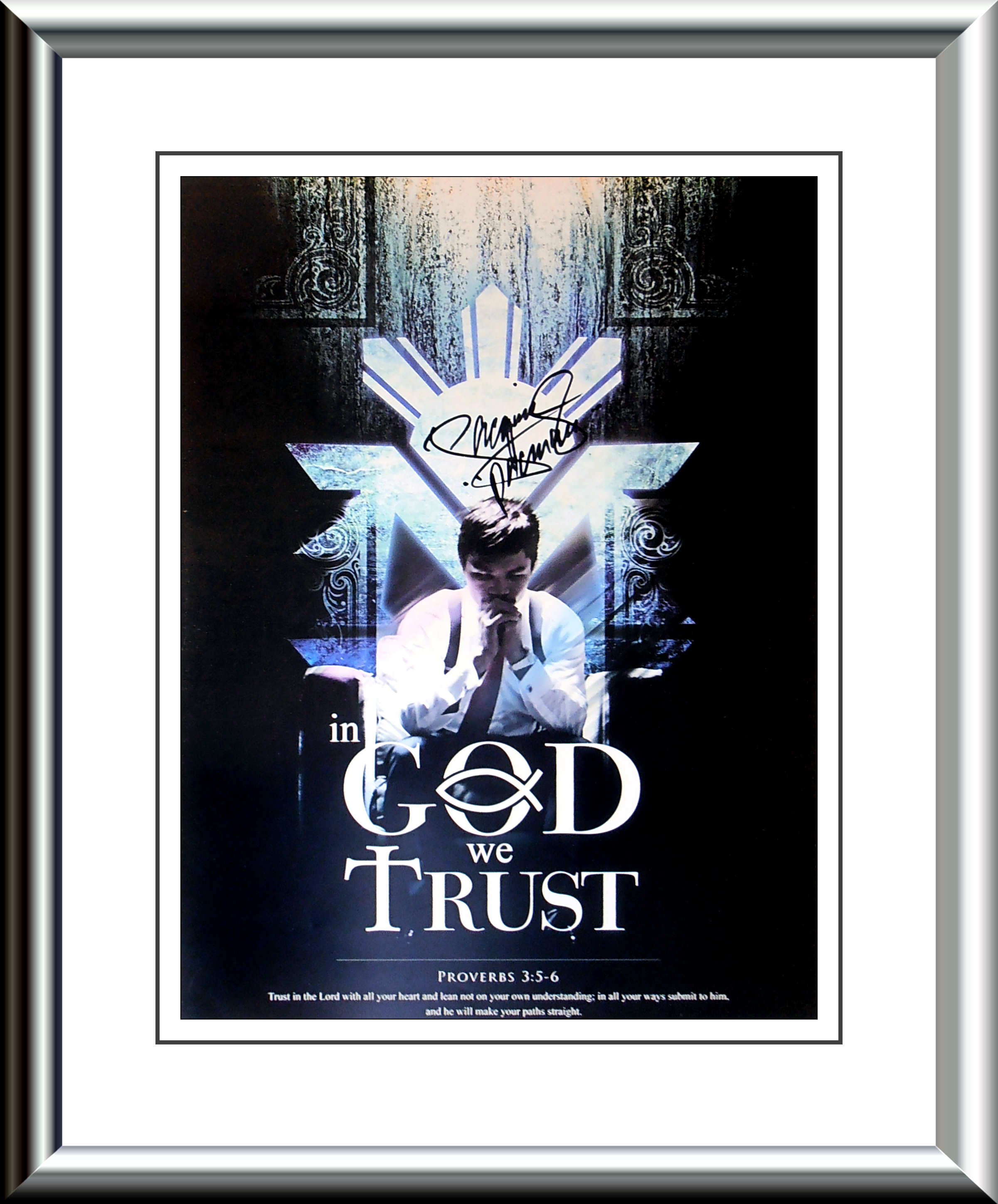 Description : Here we have a fabulous 24in x 18in Team Pacquiao supplied artwork poster of Manny Pacquiao (In God we Trust). This unique poster has been signed by Manny Pacquiao in black sharpie at one of his many sports concessions in Manilla, Philippines. This Manny Pacquiao autographed item was signed in the presence of one of his 'Team Pacquiao' store employees. This autographed Manny Pacquiao item will come with a covering letter of guarantee of authenticty from KOfightposters along with the 'Team Pacquiao' cert.