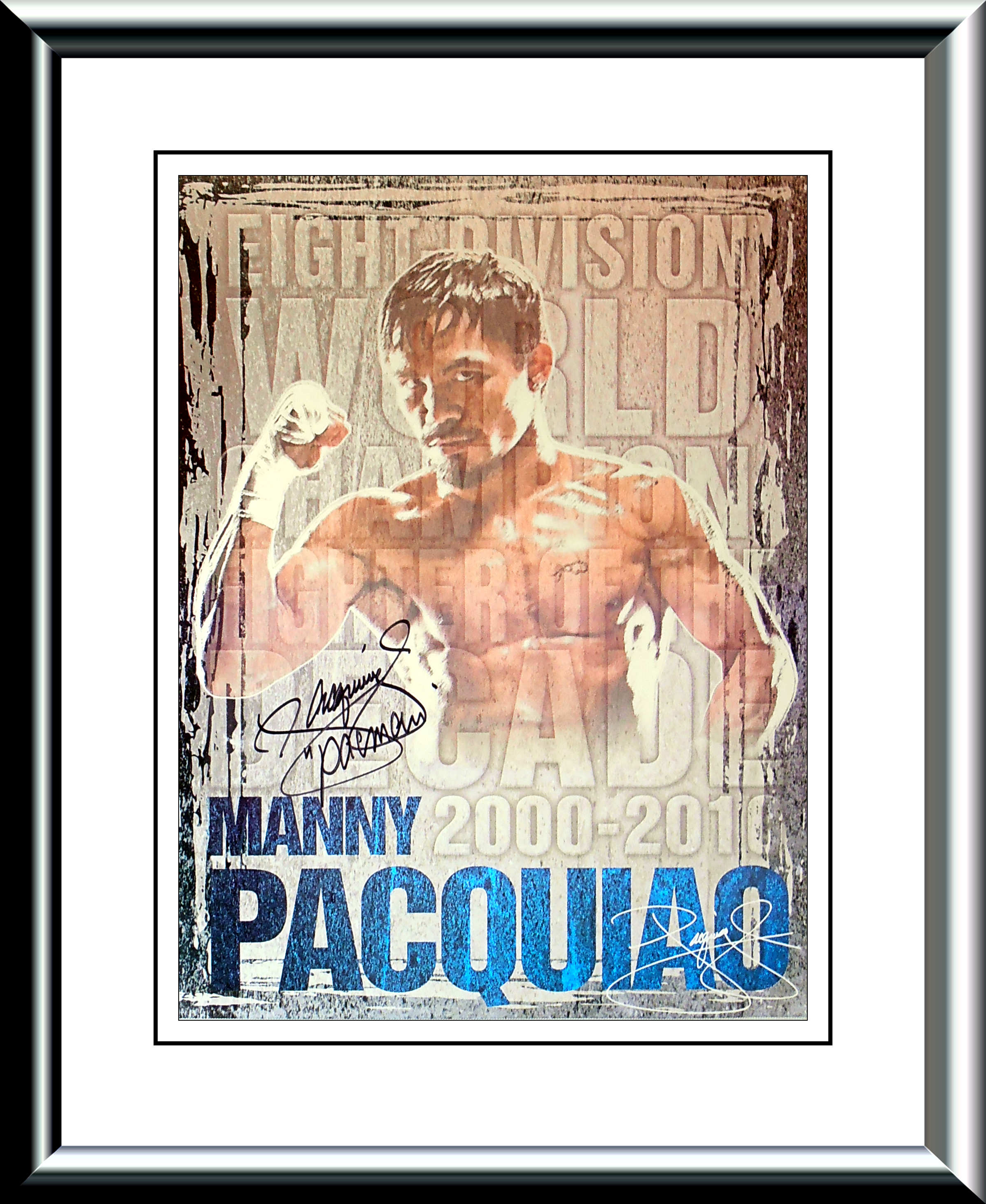 Description : Here we have a fabulous 24in x 18in Team Pacquiao supplied artwork poster of Manny Pacquiao (Fighter of the Decade). This unique poster has been signed by Manny Pacquiao in black sharpie at one of his many sports concessions in Manilla, Philippines. This Manny Pacquiao autographed item was signed in the presence of one of his 'Team Pacquiao' store employees. This autographed Manny Pacquiao item will come with a covering letter of guarantee of authenticty from KOfightposters along with the 'Team Pacquiao' cert.