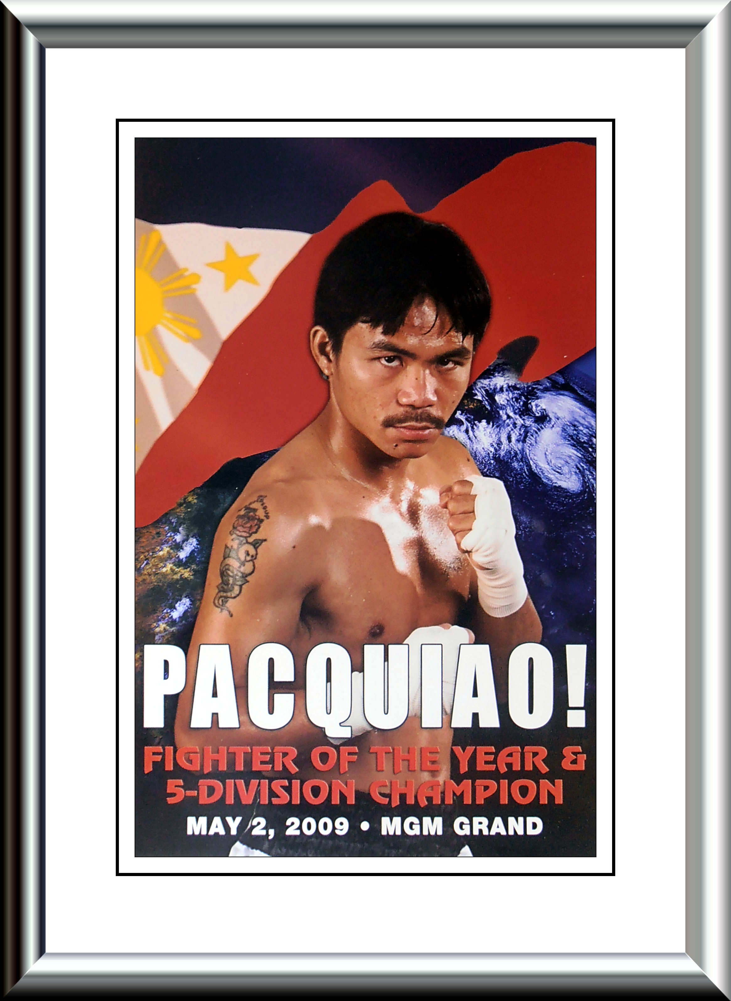 Description : Here we have an official MGM Grand fight night program 'Double-sided' cheercard (Pacquiao on reverse) for the showdown at the MGM Grand Las Vegas.