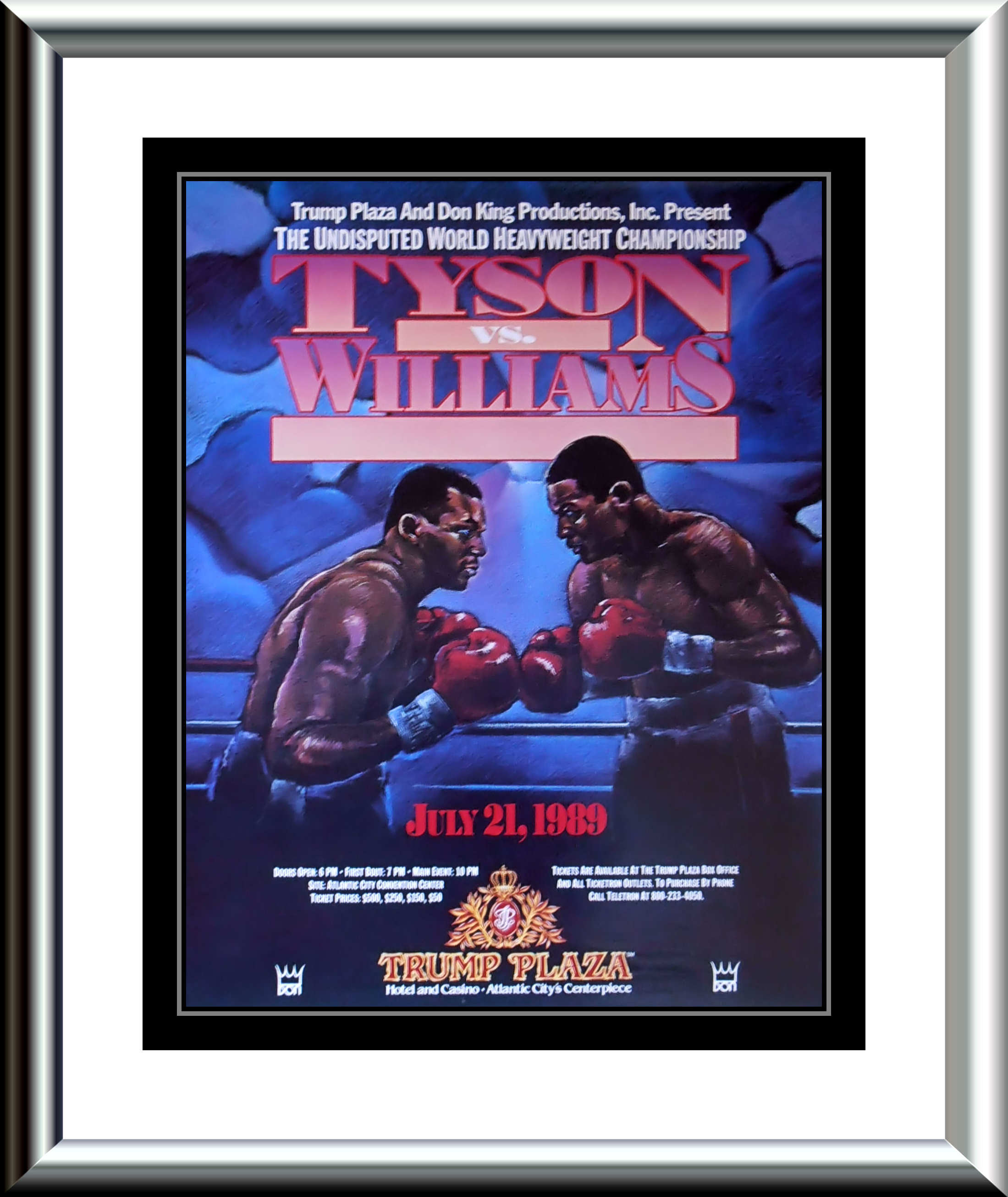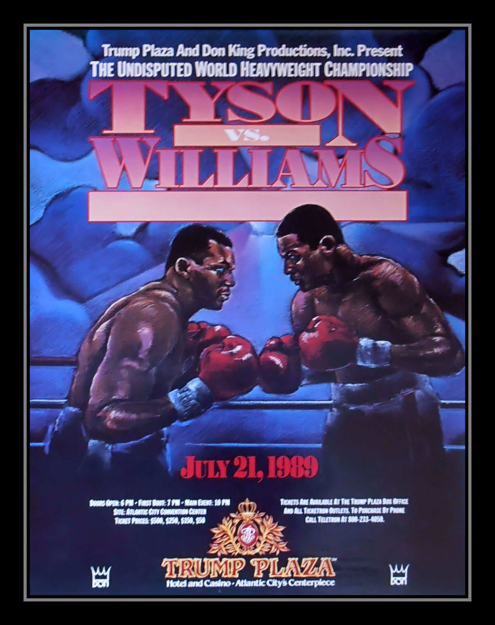 Description : Here we have a super rare vintage onsite poster from the Trump Plaza for the Undisputed Heavyweight Title. This poster is one of the most classy of the old school style posters.....The fight would only last 93 seconds, becoming Tyson's second quickest title fight after his 91 second victory over Michael Spinks the previous year. Tyson and Williams began the fight trading punches with each other, though Tyson's aggressiveness caused Williams to hold several times. About 76 seconds into the round, Williams attempted to hit Tyson with a left jab. Tyson countered and hit Williams with a left hook that sent Williams to the canvas. Though Williams was able to get back on his feet and was seemingly ready to continue the fight, referee Randy Neumann controversially stopped the fight and awarded Tyson the victory by technical knockout.....Tyson's victory over Williams would mark the last successful defense of his Undisputed Heavyweight Championship. His next fight would be against little-known James "Buster" Douglas on February 11, 1990 in Tokyo, Japan. Despite being a 42-1 underdog, Douglas was able to knock out Tyson in the 10th round to pull off what has to be considered as the 'Upset of the Century' to become the new Undisputed Champion.