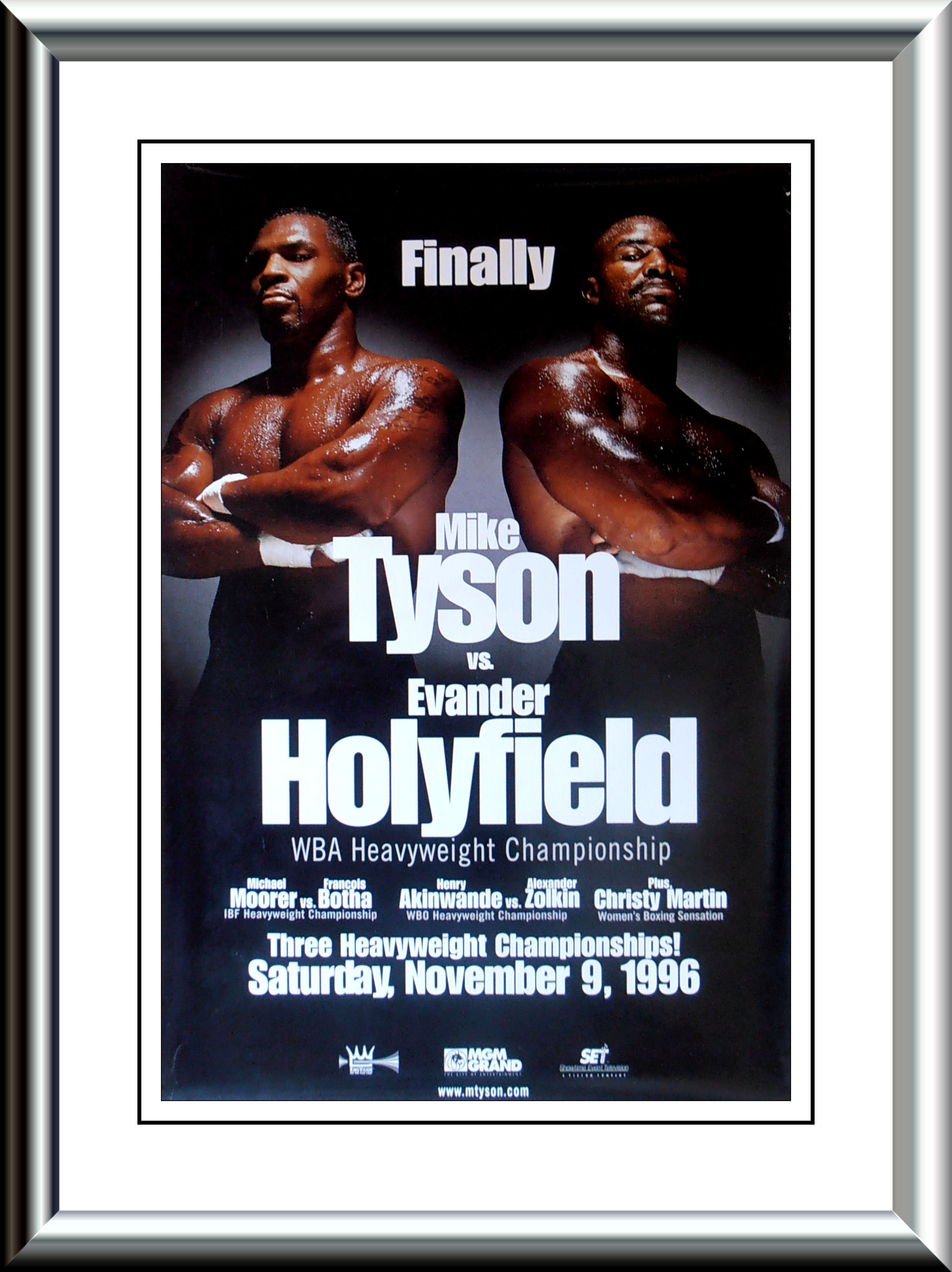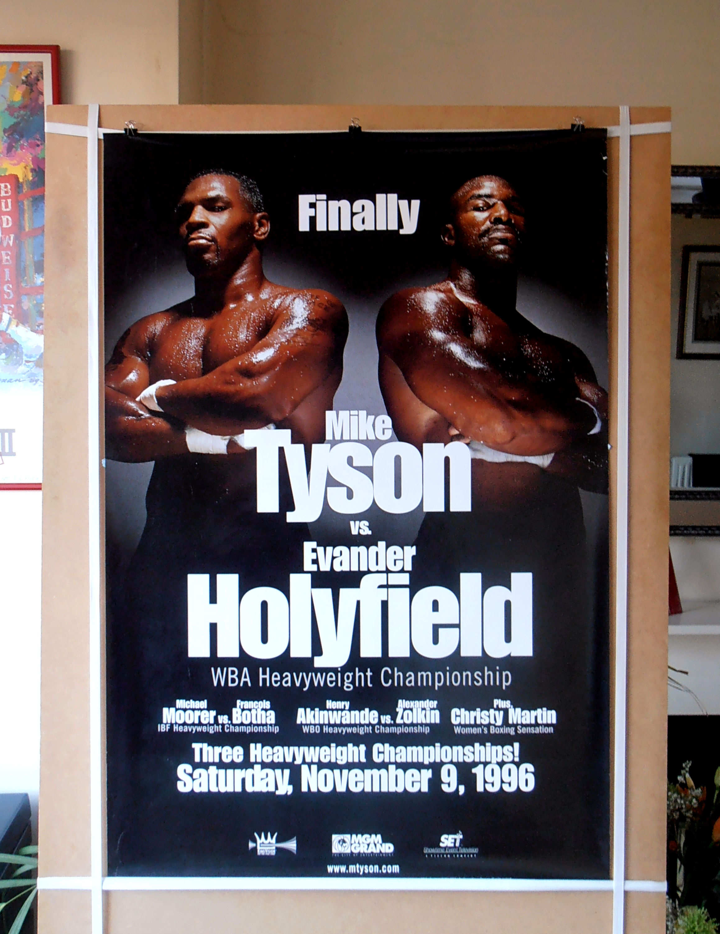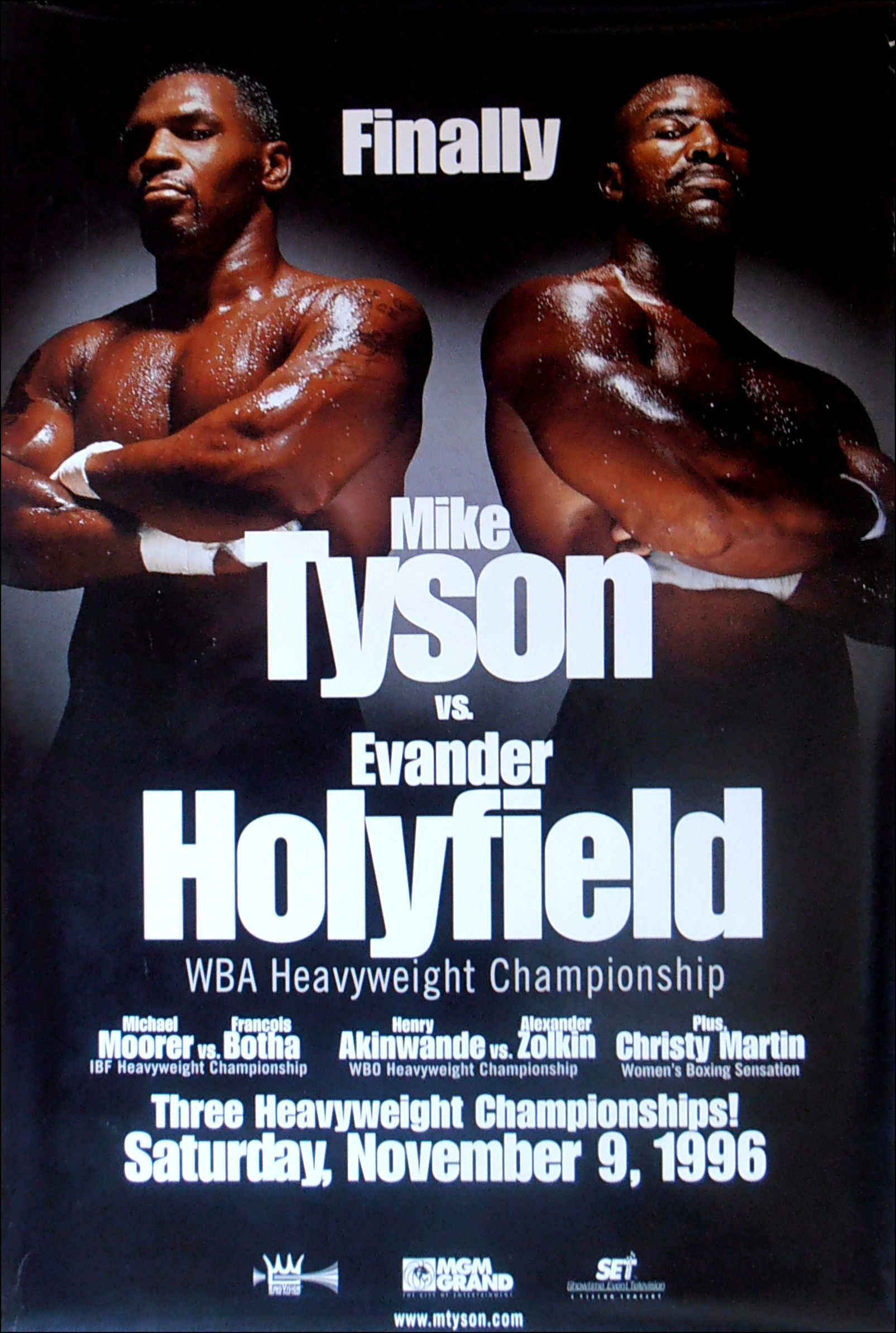 Description : Here we have a super rare onsite poster from the long awaited battle between Tyson & Holyfield for the WBA Heavyweight Title which Don King gave the handle of 'FINALLY' as this fight should have taken place in Nov 91. I was so blessed to have a ticket to this mega fight, I could not believe my eyes as the 28/1 opening odds underdog Holyfield out battled Tyson & the referee Mitch Halpern stopped the fight with Tyson defenseless on the ropes in the 11th round, the noise was incredible, no one gave Evander a cats chance, Don King viewed Holyfield as a washed up pug, what a shock for one & all.