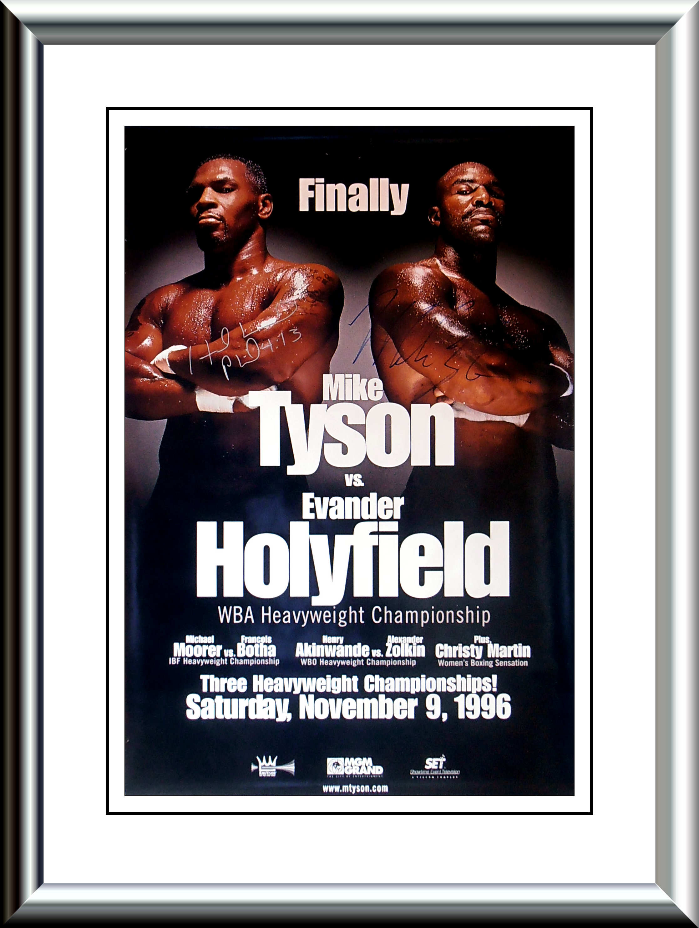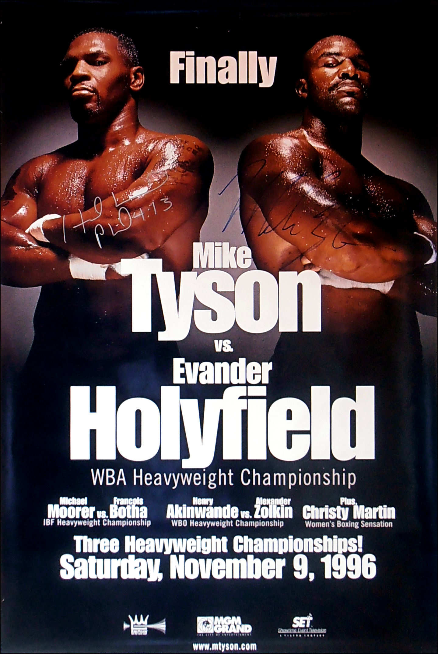 Description : Here we have a super rare original authentic dual signed onsite poster from the long awaited battle between Tyson & Holyfield for the WBA Heavyweight Title which Don King gave the handle of 'FINALLY' as this fight should have taken place in Nov 91.