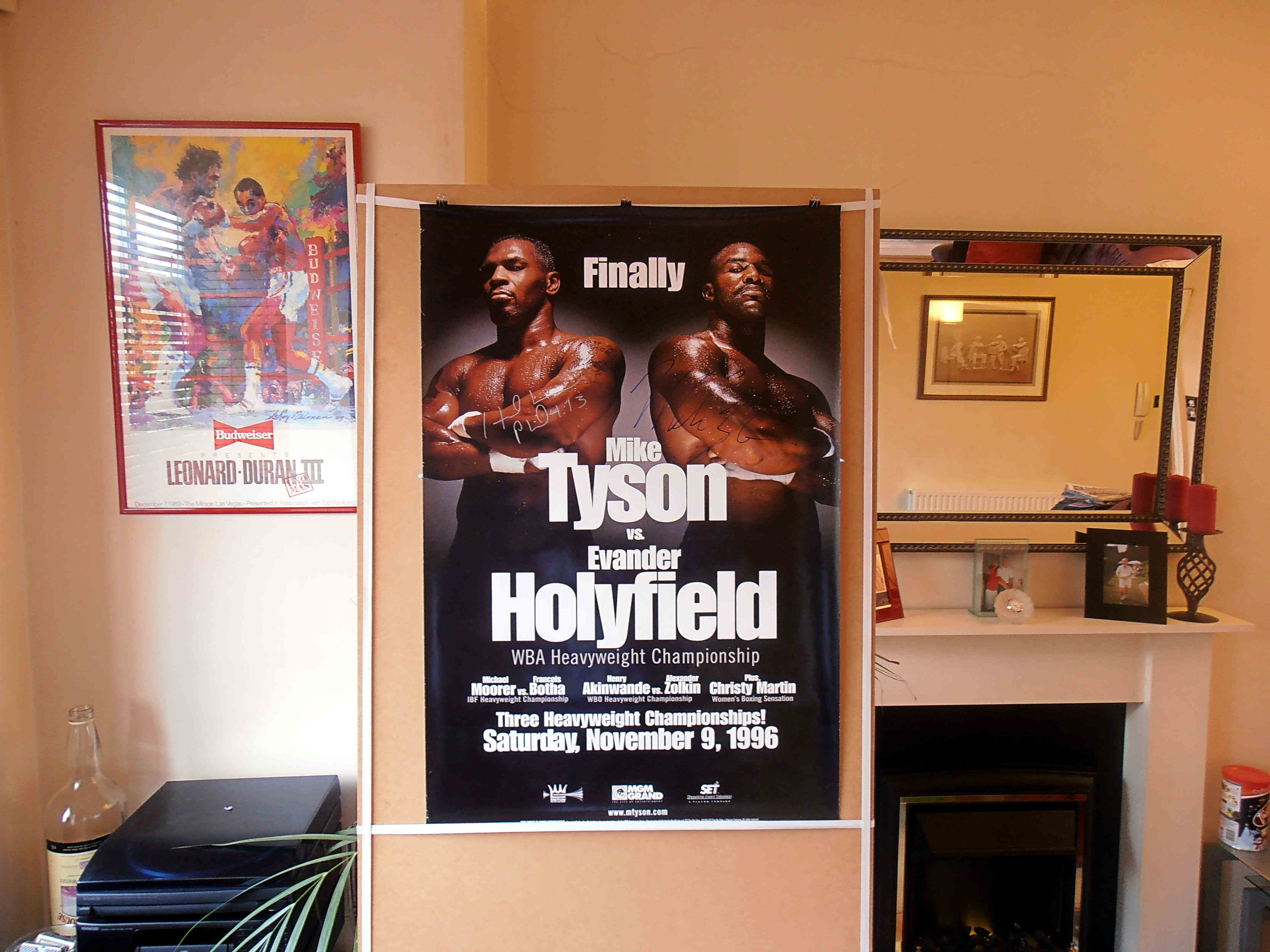 This poster was signed for me by Mike Tyson the day before the fight in the MGM car park, he did'nt say much as I jumped him & his crew, I held the poster out to him whilst dribbling platitudes of fawning adulation & pointing to where I wanted Mike to sign it & he just went and signed all over Holyfield!.......I got Evander to sign this poster here in England in 2012 when he was over for a private signing session & photo-shoot. I was so blessed to have a ticket to this mega fight, I could not believe my eyes as the 28/1 opening odds underdog Holyfield out battled Tyson & the referee Mitch Halpern stopped the fight with Tyson defenseless on the ropes in the 11th round, the noise was incredible, no one gave Evander a cats chance, Don King viewed Holyfield as a washed up pug, what a shock for one & all.
