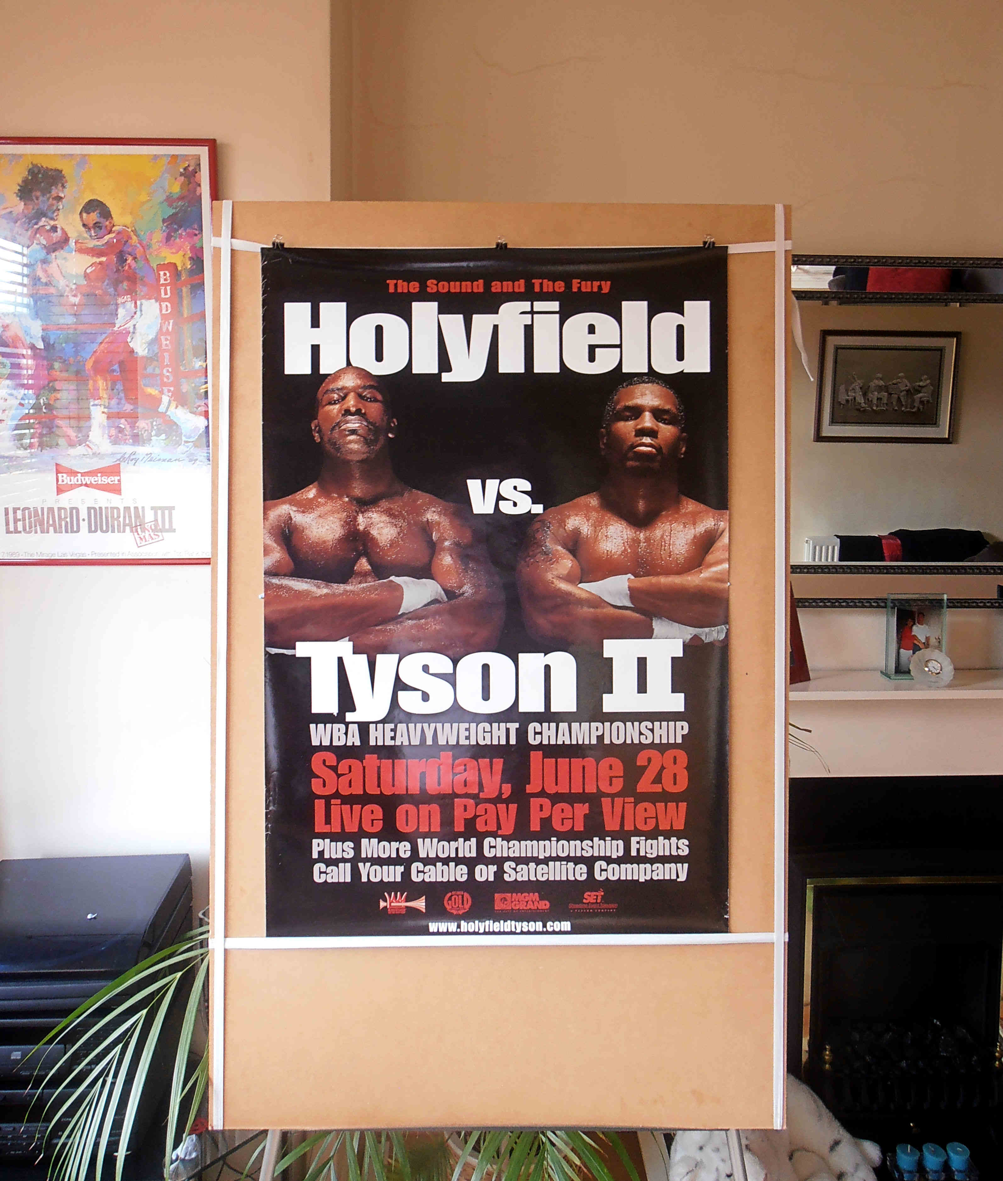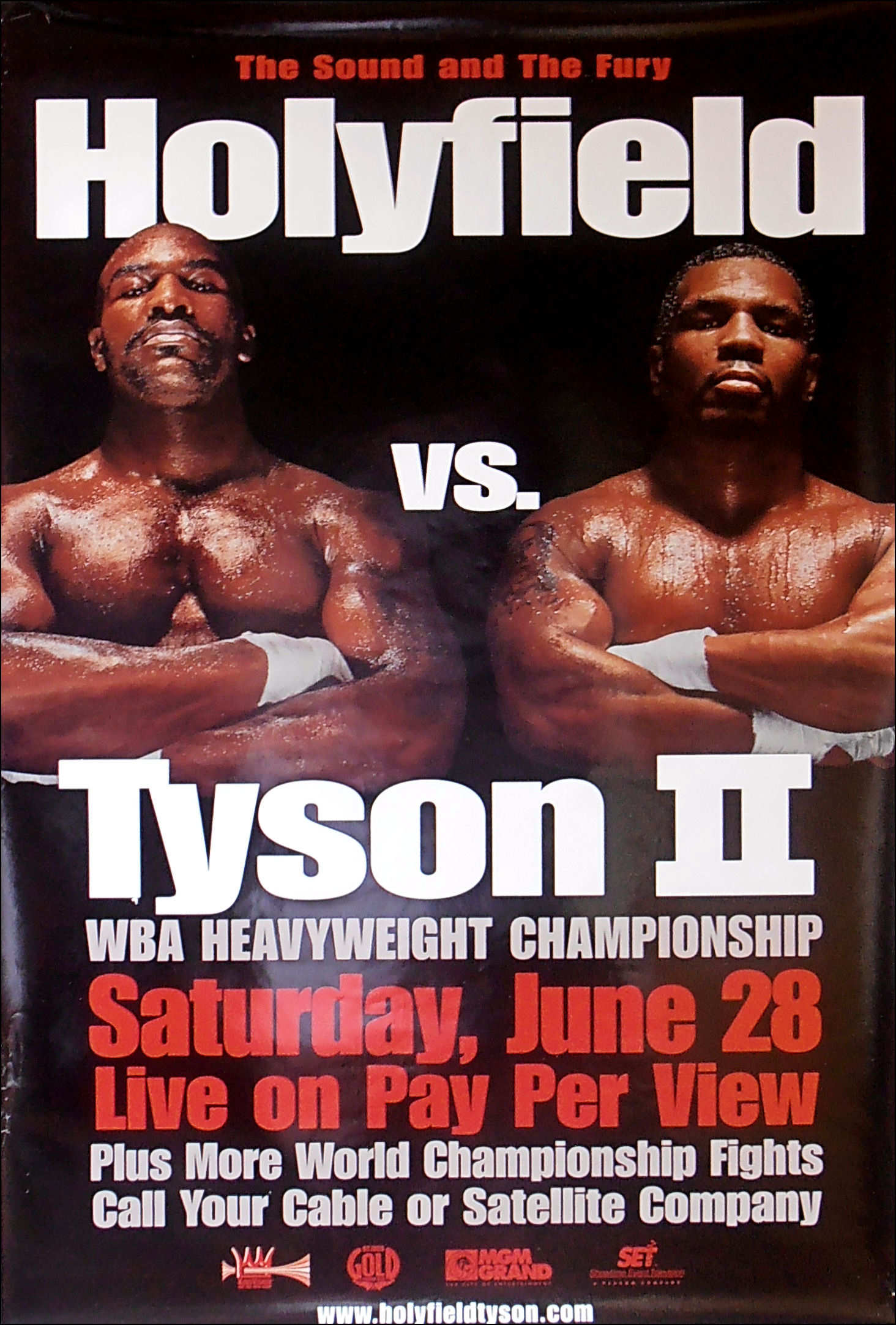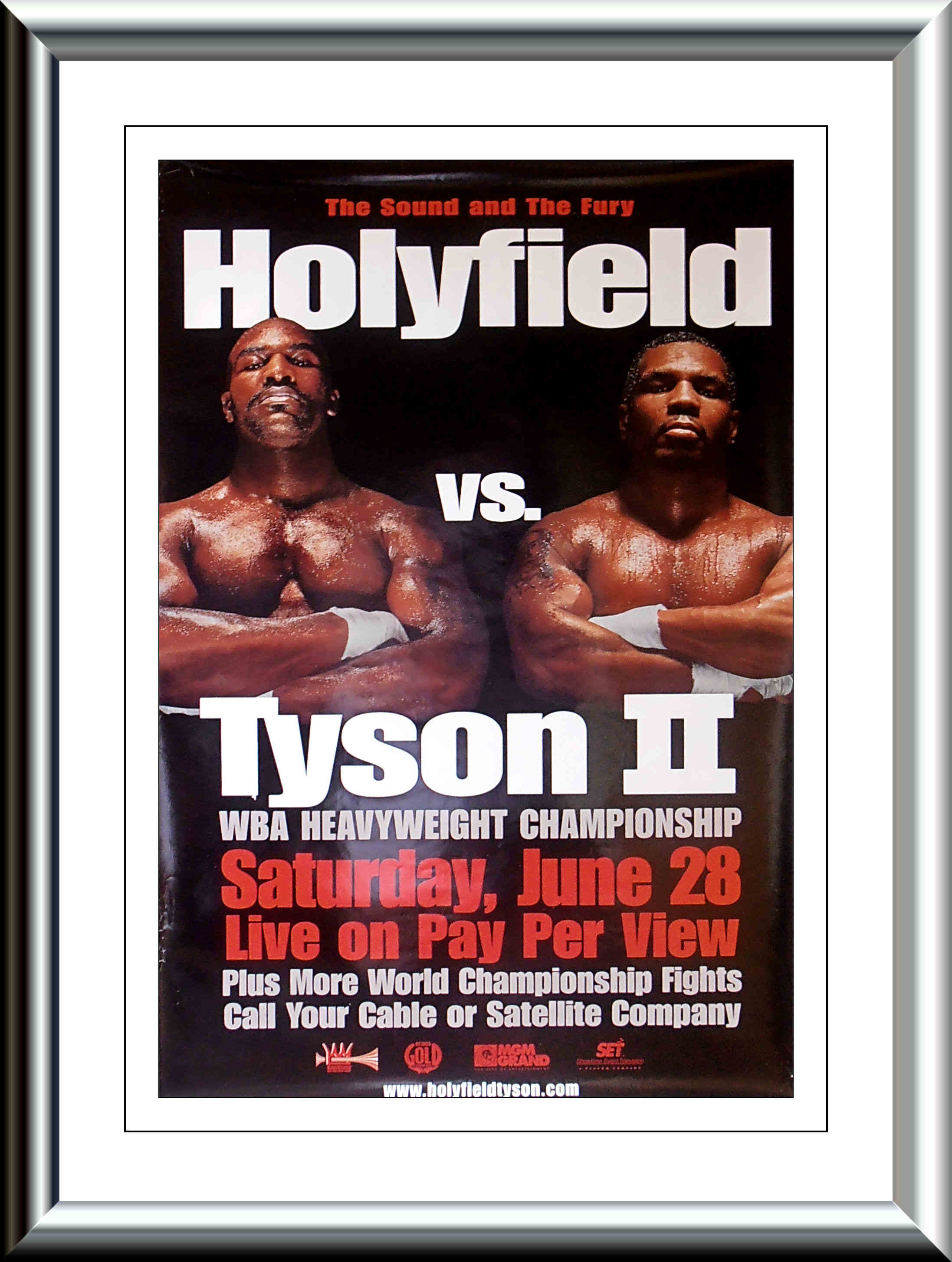 Description : Here we have an original MGM Grand boxing PPV/Cable poster from that infamous night at the MGM Grand Las Vegas where Mike Tyson got himself thrown out of the ring by referee Mills Lane for biting a chunk out of Evanders ear in the 3rd round. I was one of the very fortunate few who had a ticket for this mega event shocker! It's a night I'll never forget, inside the ring & out of it, the MGM went into lockdown for 1 hour to try & contain the chaos that spilled out of the arena & into the main casino. A lunatic night all round.....Evander Holyfield vs. Mike Tyson II was billed as "The Sound and the Fury" that took place on June 28, 1997 for the WBA Heavyweight Championship. It achieved notoriety as one of the most bizarre fights in boxing history..... The fight began with Holyfield dominating Tyson. Holyfield won the first two rounds. At 2:19 of the first round, an overhand right from Holyfield stunned Tyson, but Tyson fought back immediately pushing Holyfield backwards. 32 seconds into Round Two, Holyfield ducked under a right from Tyson, in doing so, head butting Tyson and opening a large cut over his right eye. Tyson had repeatedly complained about head-butting in the first bout between the two.....As the third round was about to begin, Tyson came out of his corner without his mouthpiece, which Mills Lane spotted & made him put it back in, it seems Mike had decided to take matters into his own hands about the headbutts, Tyson began the third round with a furious attack & was starting to look like the Tyson of old! With forty seconds remaining in the round Holyfield got Tyson in a clinch, and Tyson rolled his head above Holyfield's shoulder and bit Holyfield on his right ear, Tyson chomped off a one-inch piece of cartilage from the top of Evanders ear & spat out the piece of ear onto the ring canvas & that was the Que for LET THE MAYHEM BEGIN!