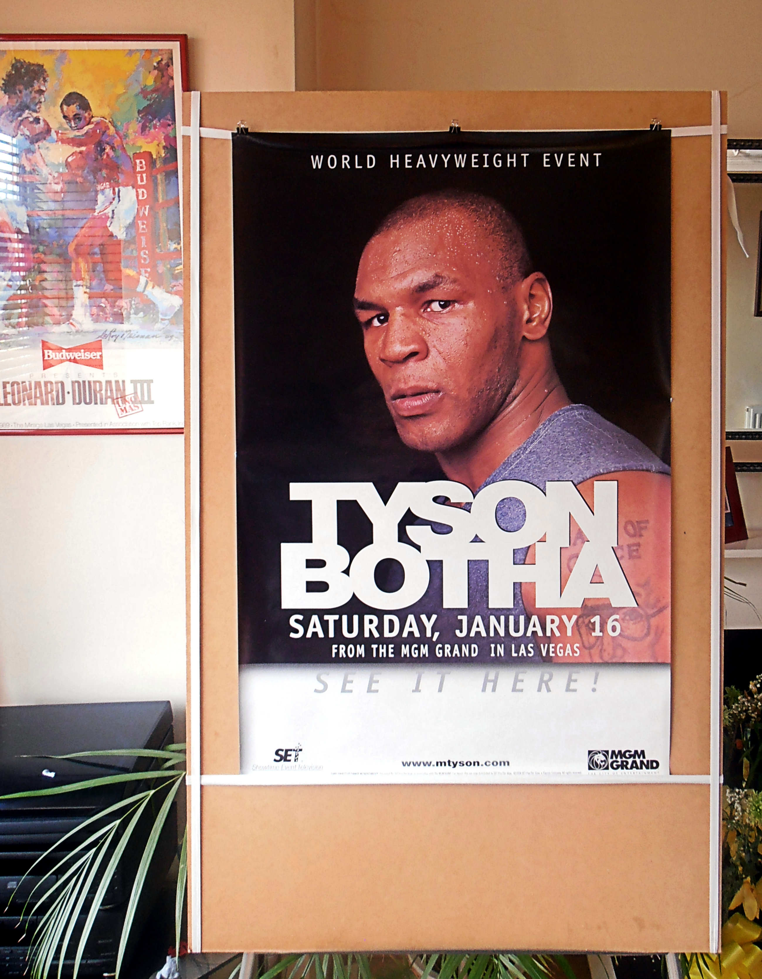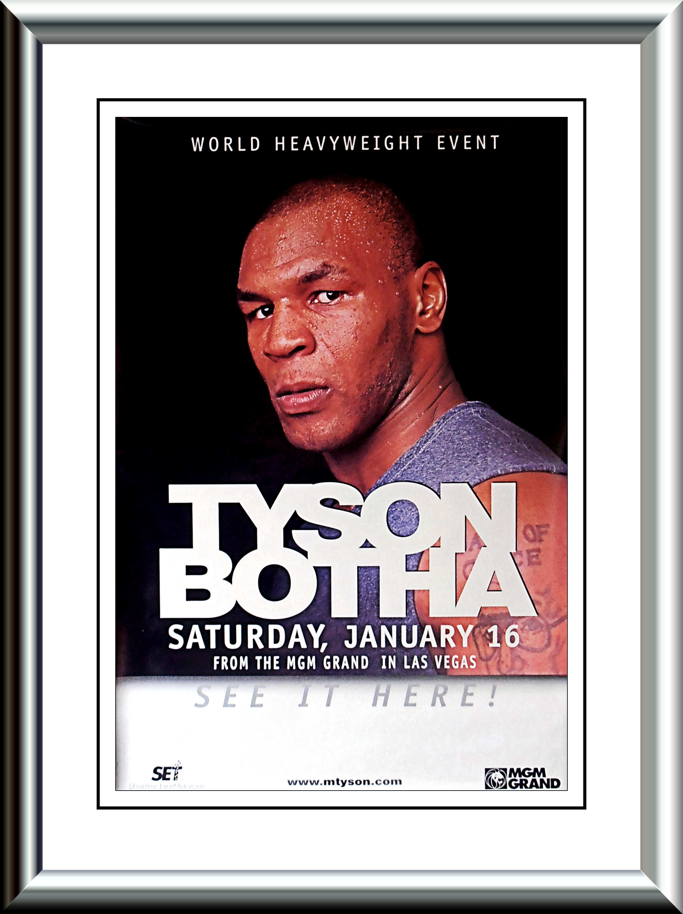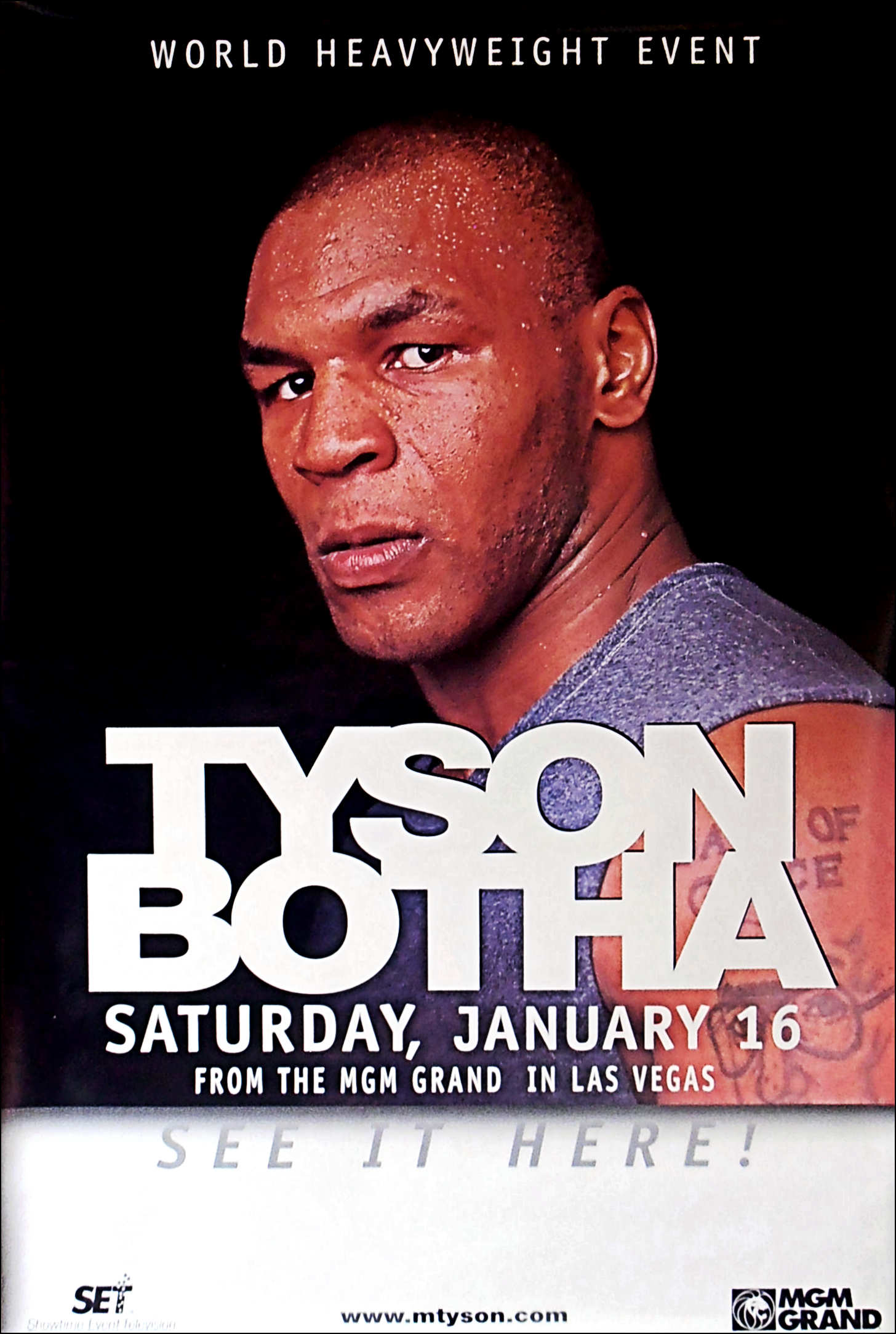 Description : Here we have an original MGM Grand Las Vegas PPV boxing poster for the foul filled street fight of a boxing match in Tysons comeback fight after his 15 month suspension for biting a chunk from Evander Holyfields ear in their rematch.....After much speculation over who Tyson would face in his return bout, it was officially announced that Tyson would face former IBF Heavyweight champion Francois Botha on January 16, 1999. Despite his long layoff, Tyson was forthright about his chances of collecting a victory over Botha by way of knockout. Tyson said "I am going right at him and I expect him to go down cold. I expect him to die." Botha also was confident that he could defeat Tyson, claiming that he would earn the victory by way of "seventh round knockout".......