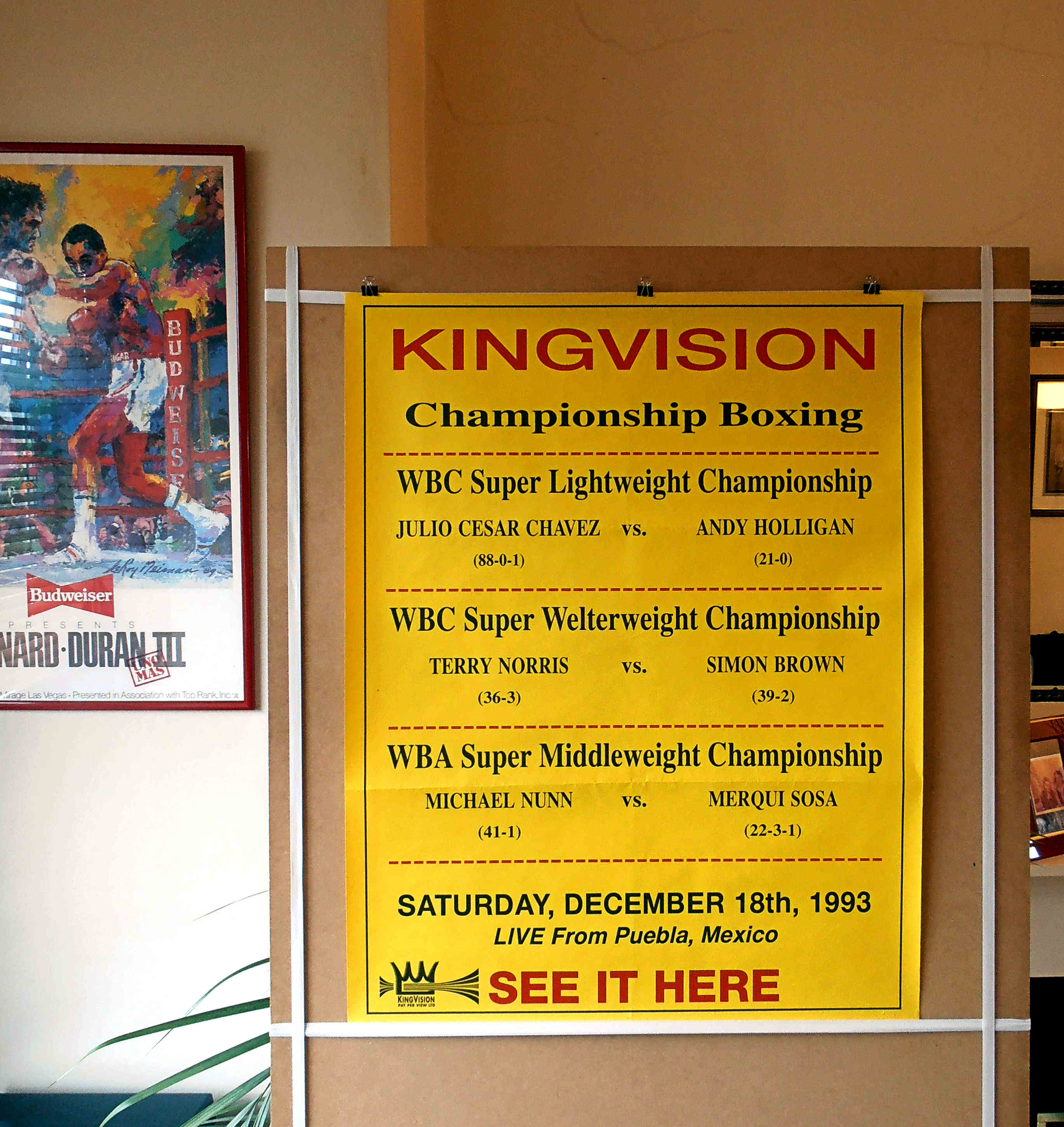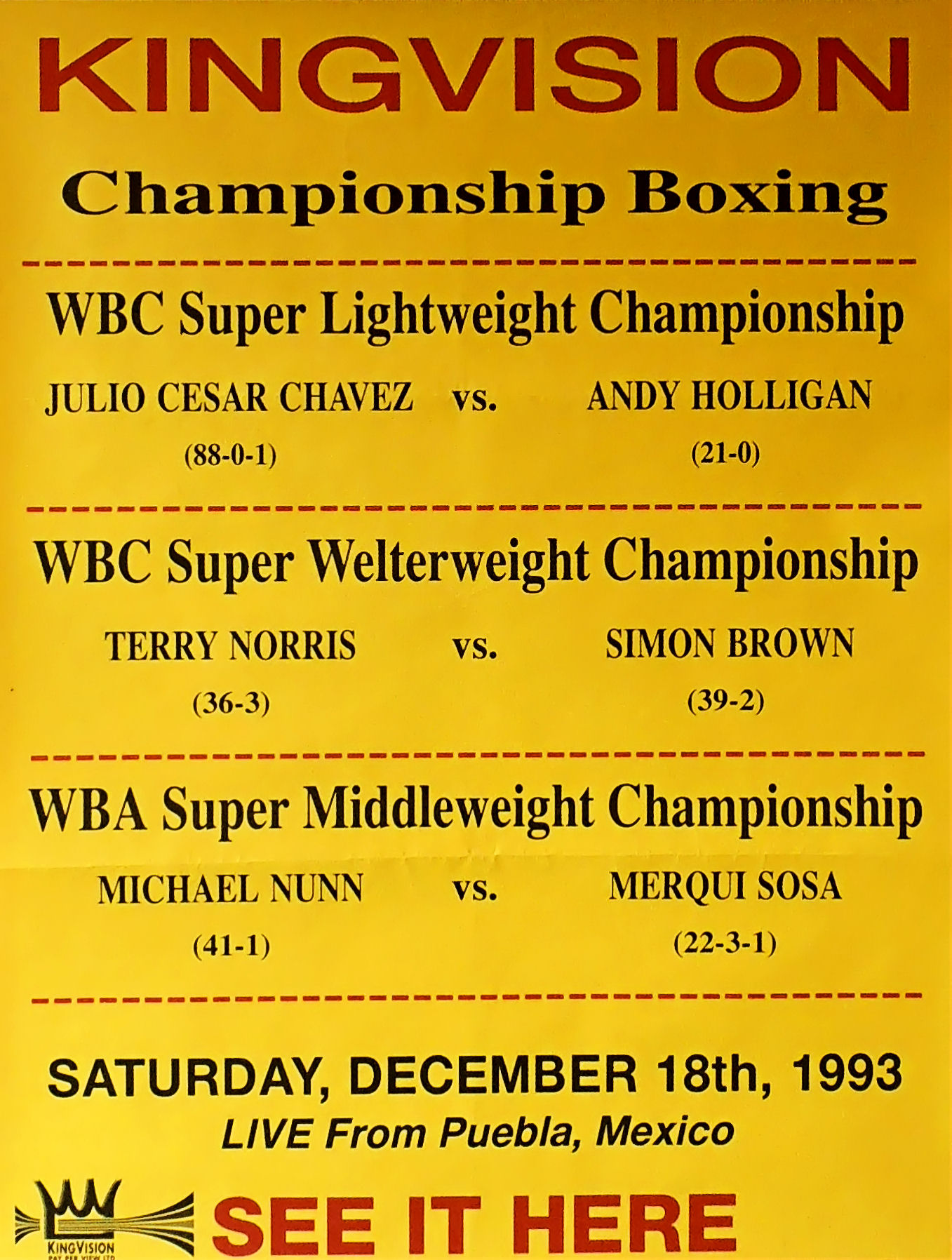 Description : Her we have an original Don King Production closed circuit poster for the mega bill from Mexico City where Chavez defended his WBC Light Welterweight title on December 18, 1993. He defeated brave British Commonwealth Light Welterweight Champion Andy Holligan (21-0-0) by fifth round TKO.