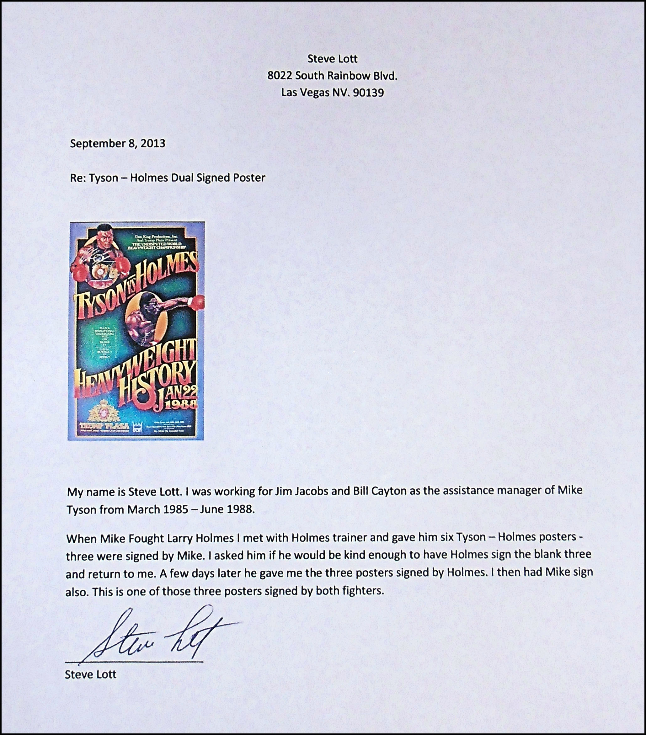 This fabulous poster has been signed by both Mike Tyson & Larry Holmes the week before the fight, classic careful vintage signatures from both Tyson & Holmes........This poster was obtained from Mike Tyson's former co-manager & friend Mr Steve Lott, you can see Steve in the corner with trainer Kevin Rooney at all Mikes early fights before Don King appeared on the scene.....