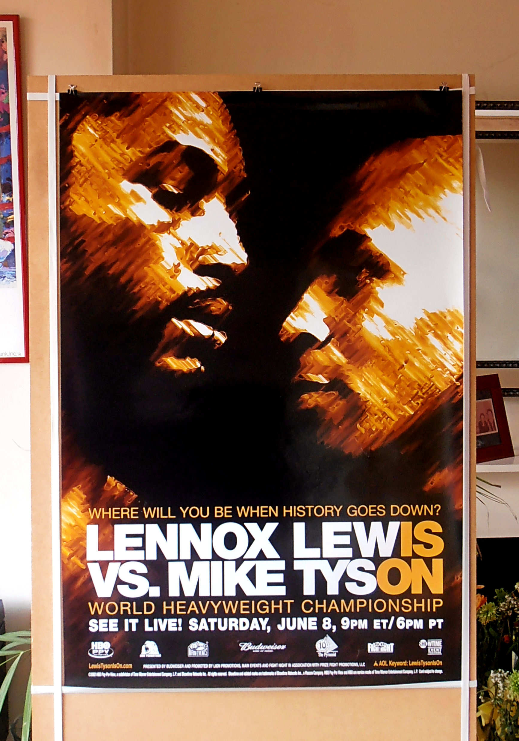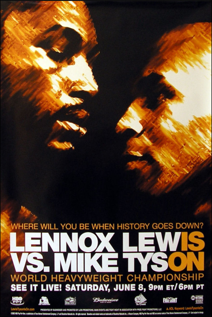 Description : Here we have an original full size official HBO Boxing PPV poster for the fight billed as "Lewis v Tyson: Is On". This took place on June 8, 2002 at the Pyramid Arena in Memphis, Tennessee, United States, between IBF, IBO and WBC heavyweight champion Lennox Lewis and former IBF, WBA and WBC heavyweight champion Mike Tyson. The fight was for Lewis' heavyweight championship titles. This fight should have taken place years earlier & Tyson was now just fighting to pay off the IRS & stave off Bankruptcy....