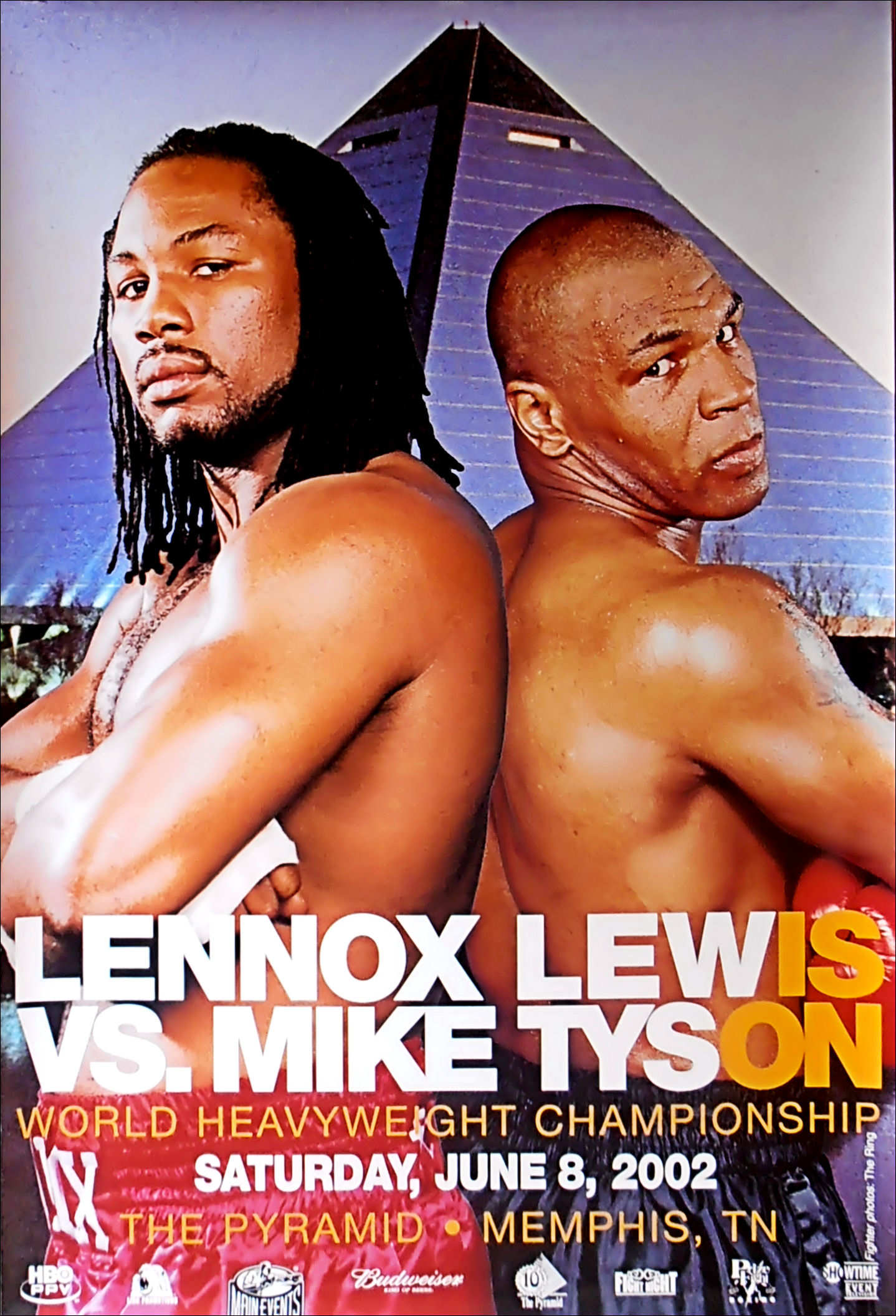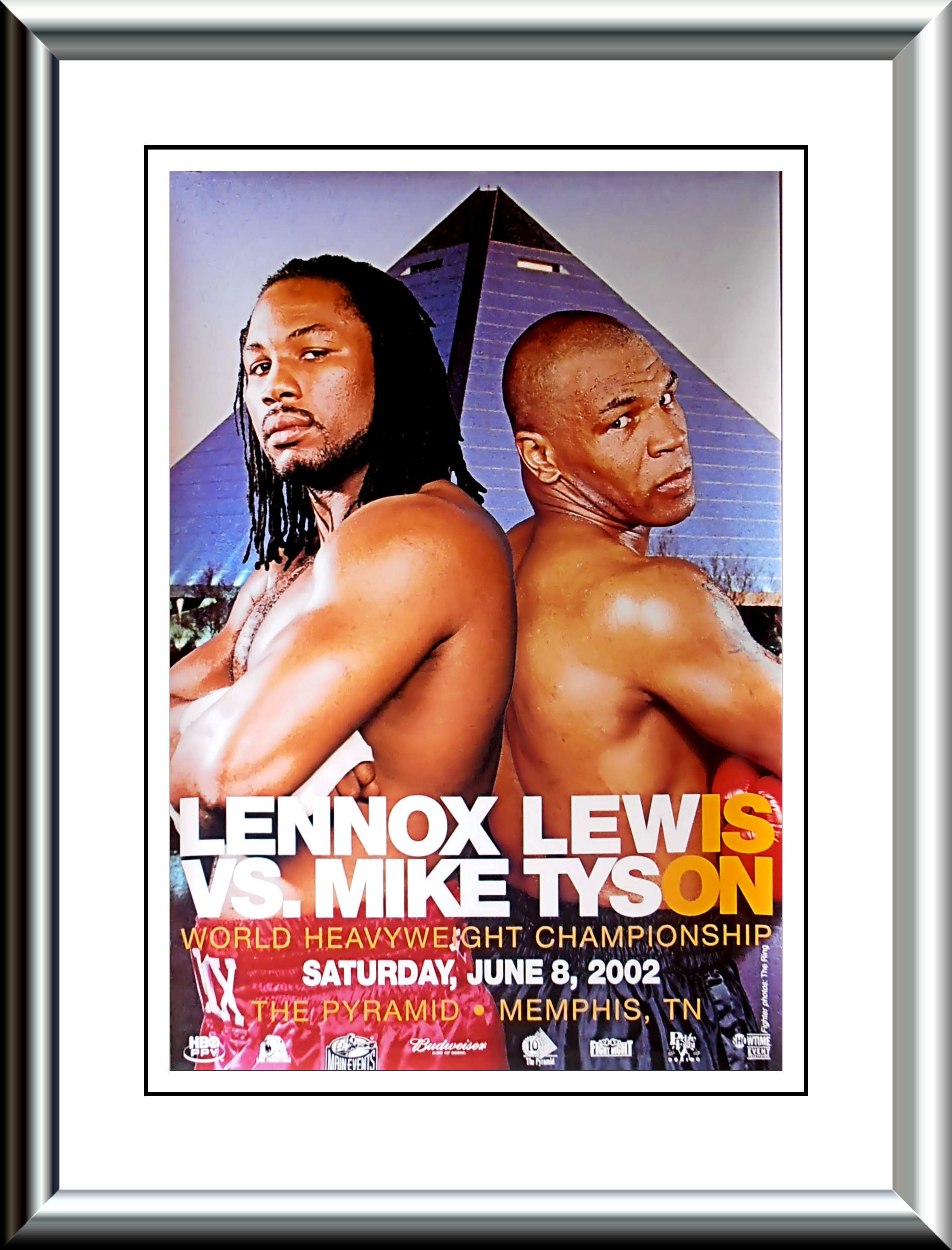 Description : Here we have an original onsite poster for the fight billed as "Lewis v Tyson: Is On", that took place on June 8, 2002 at the Pyramid Arena in Memphis, Tennessee, United States, between IBF, IBO and WBC heavyweight champion Lennox Lewis and former IBF, WBA and WBC heavyweight champion Mike Tyson. The fight was for Lewis' heavyweight championship titles. This fight should have taken place years earlier & Tyson was now just fighting to pay off the IRS & stave off Bankruptcy....