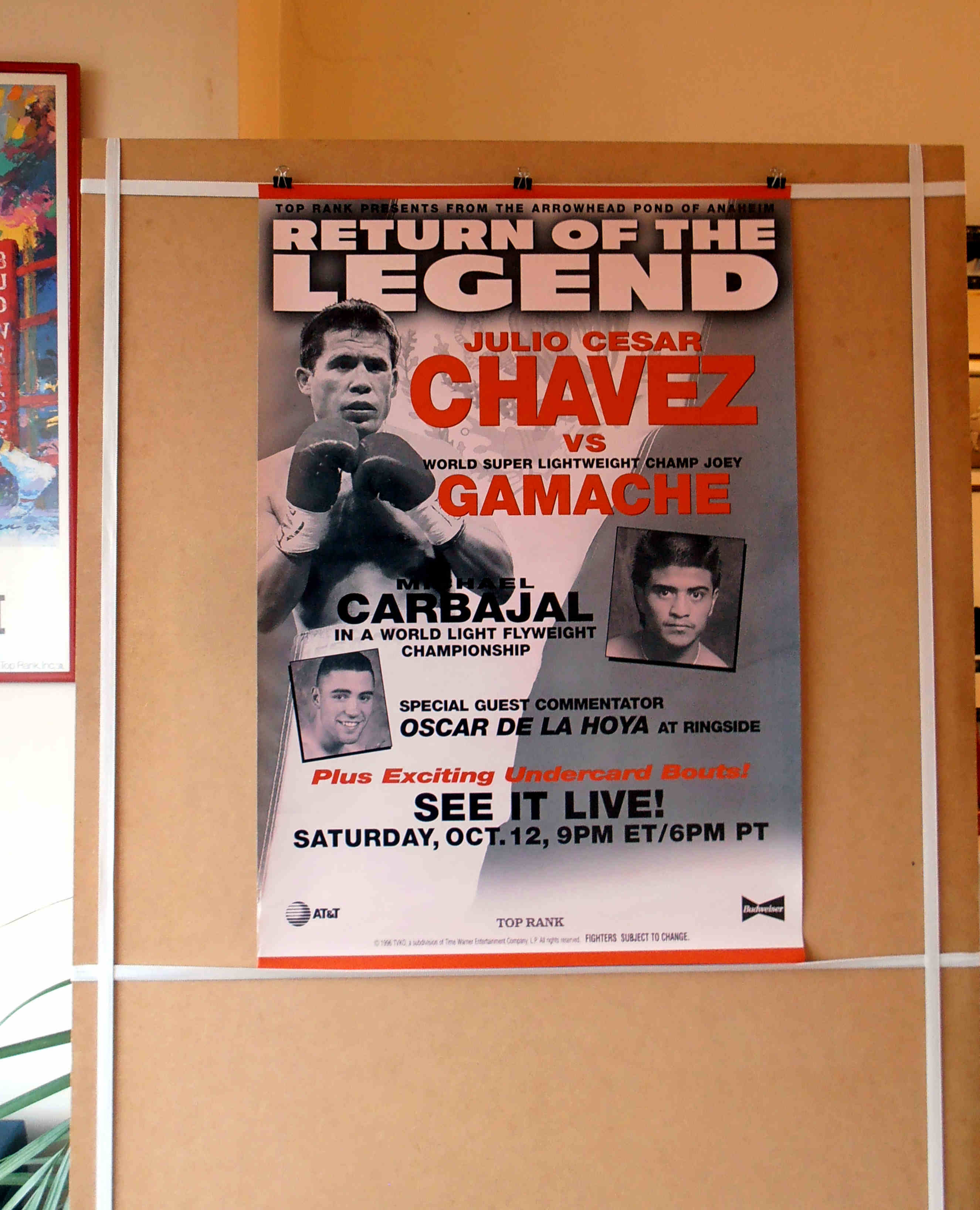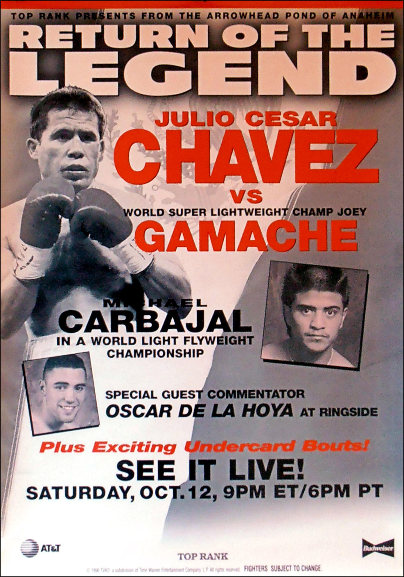 Description : Here we have an official Top Rank Boxing closed circuit poster from the 12th October 1996 at the Arrowhead Pond, Anaheim, California, USA for the return of Julio Cesar Chavez return after his loss to Oscar De La Hoya for his WBC Light/Welterweight Title. This fight would be the incredible 100th bout of the Mexican legends career when he fought former NABF lightweight champion Joey Gamache over 10 x 3 min rounds. Chvez defeated Joey Gamache by 8th round TKO.