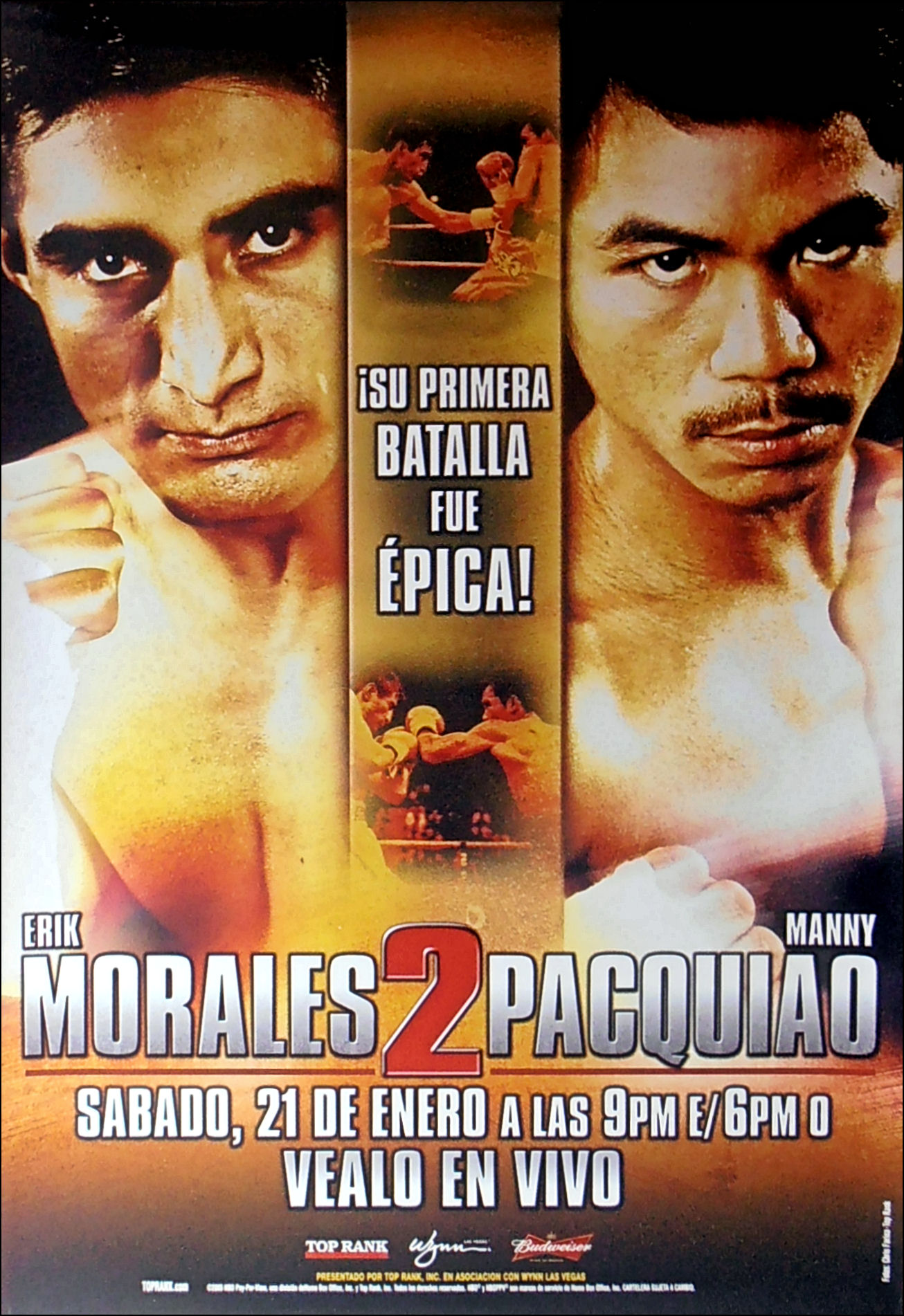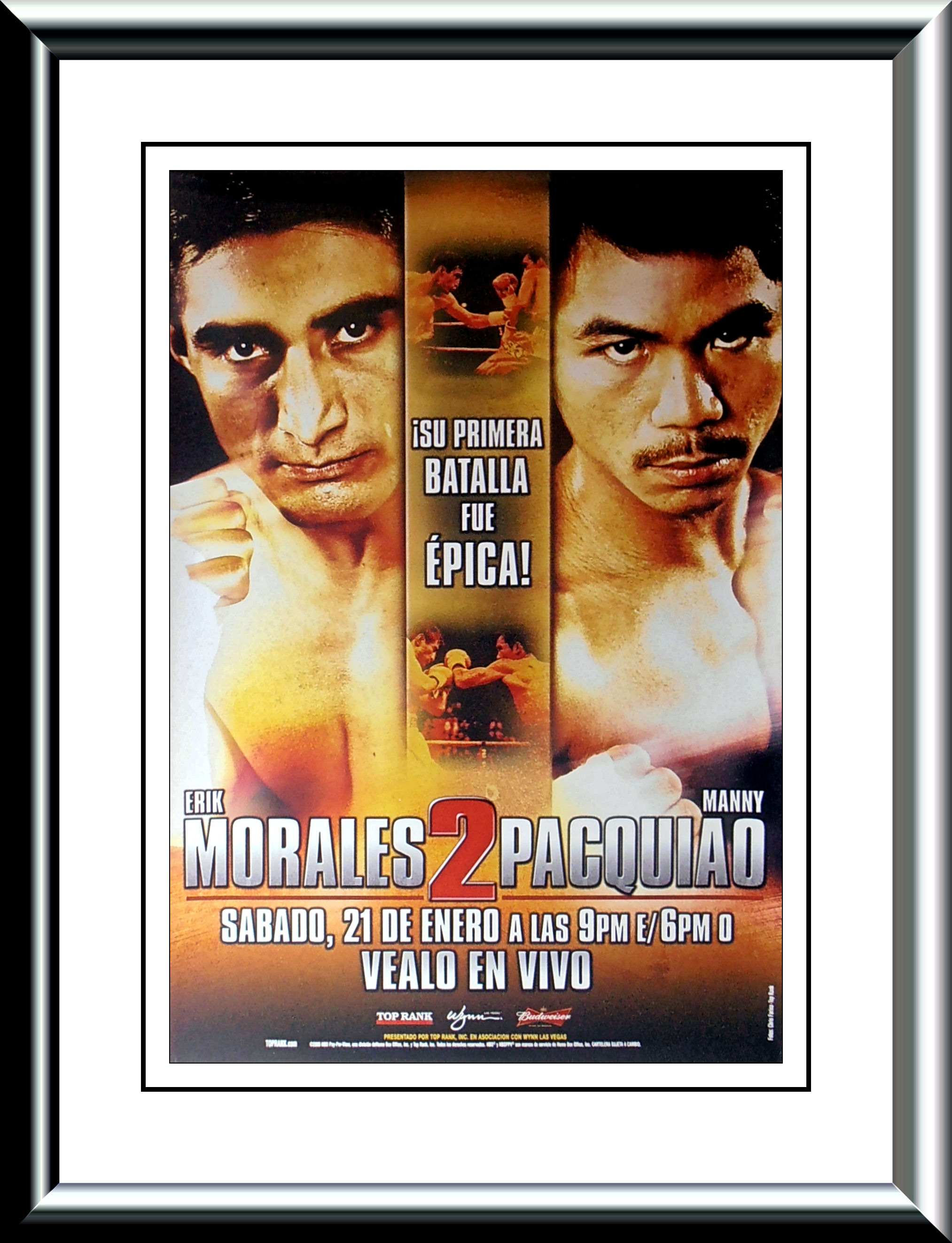 Description : Here we have the official Top Rank closed circuit/PPV poster (Spanish) for the 2nd meeting in an incredible trilogy between the great Mexican 3 division champion Eric Morales & 3 division champion Manny Pacquiao.