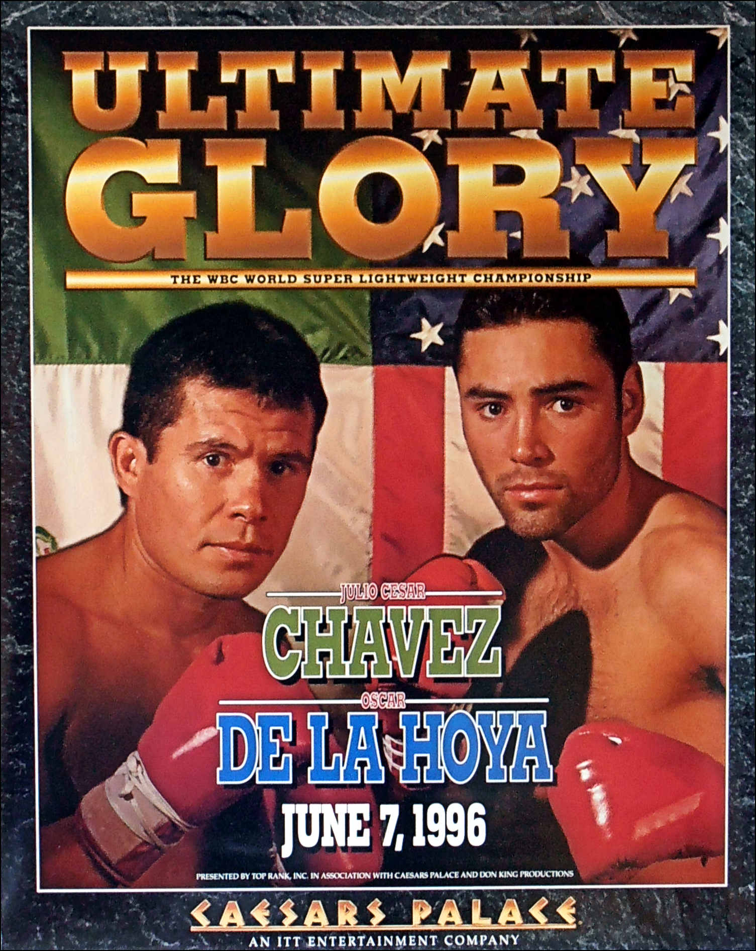 Description : Here we have the Official On-Site fight poster for the WBC light-welterweight championship bout from Caesars Palace, Las Vegas for the clash of Mexican superstars, 7th June, 1996.