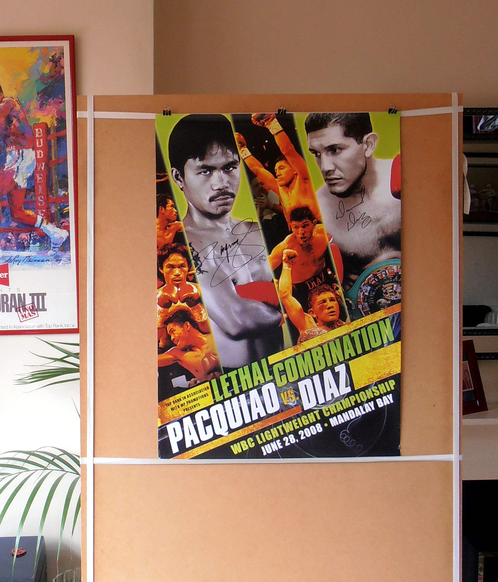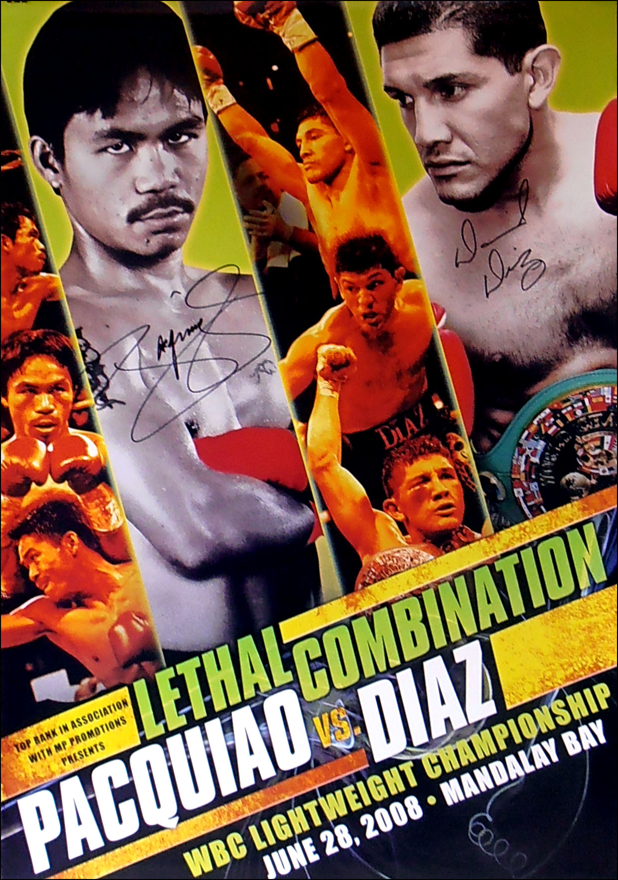 Description : Here we have a fantastic super scarce official onsite Top Rank Productions fight poster from the Mandalay Bay Las Vegas for the battle between defending WBC Lightweight Champion David Diaz & Manny "Pacman" Pacquiao. This fabulous poster has been signed by Manny Pacquiao & David Diaz at the final pre-fight presser!
