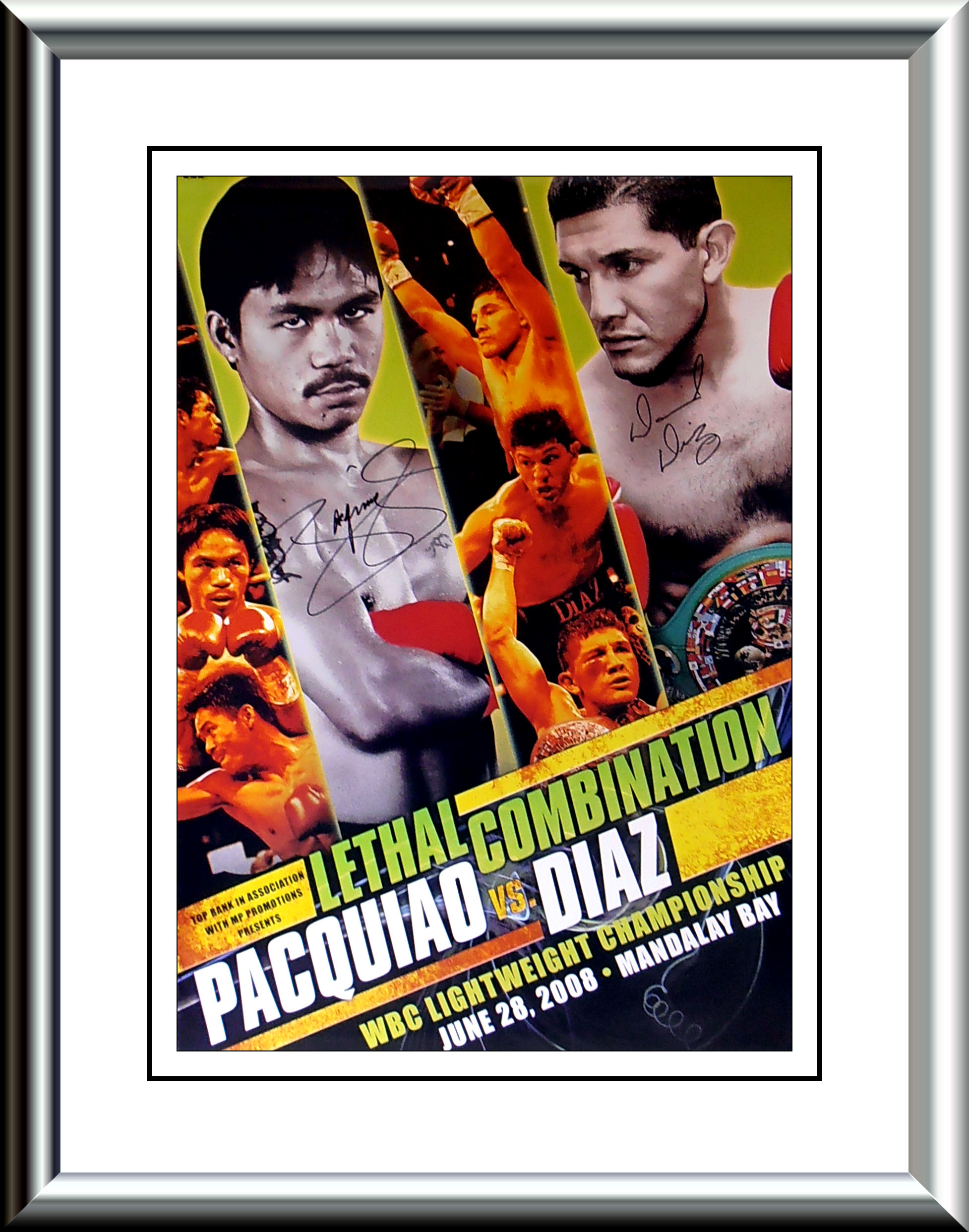 This authentic Manny Pacquiao & David Diaz autographed onsite poster from the Mandalay Bay Las Vegas is accompanied with a lifetime guarantee of authenticity from KOfightposters.