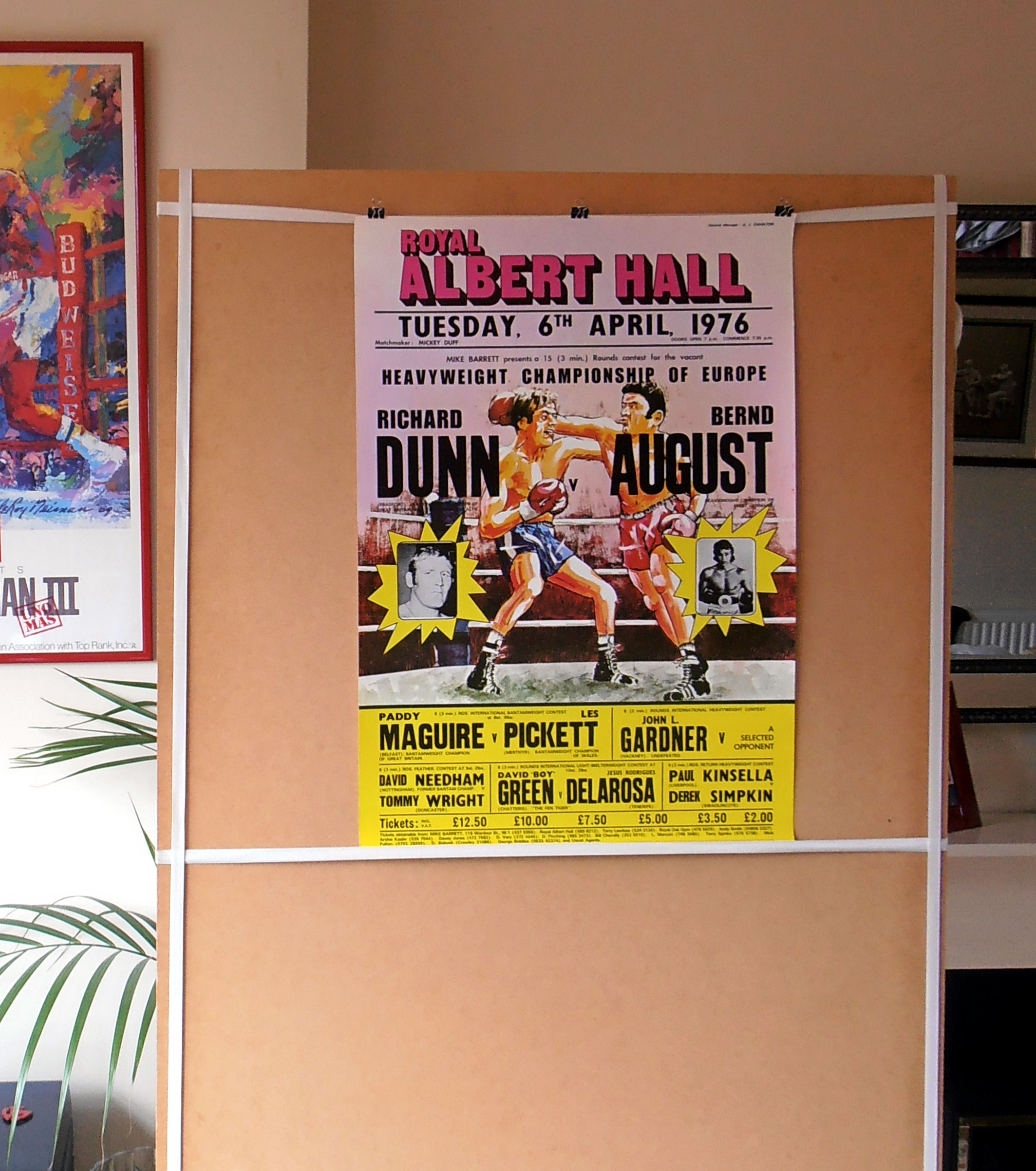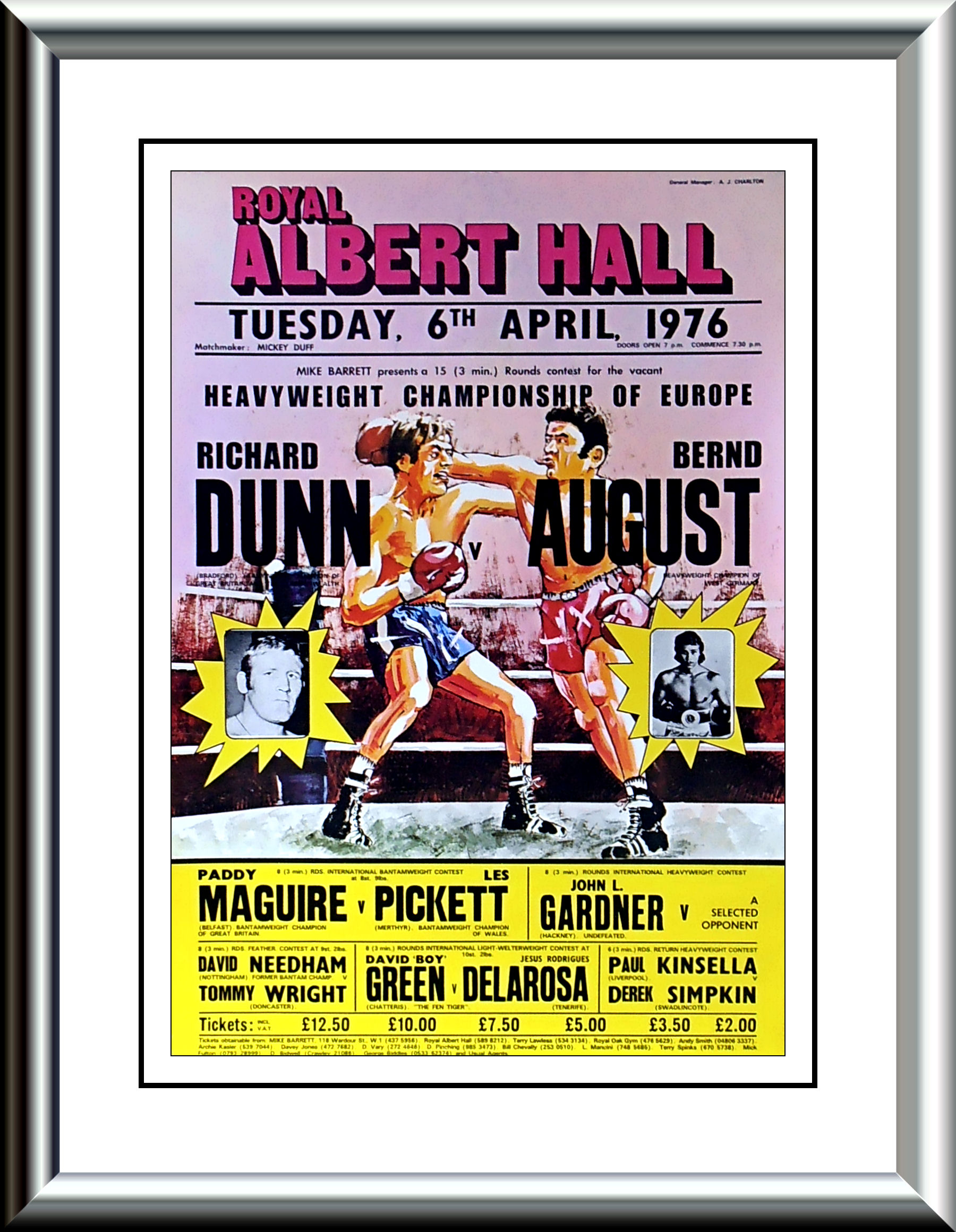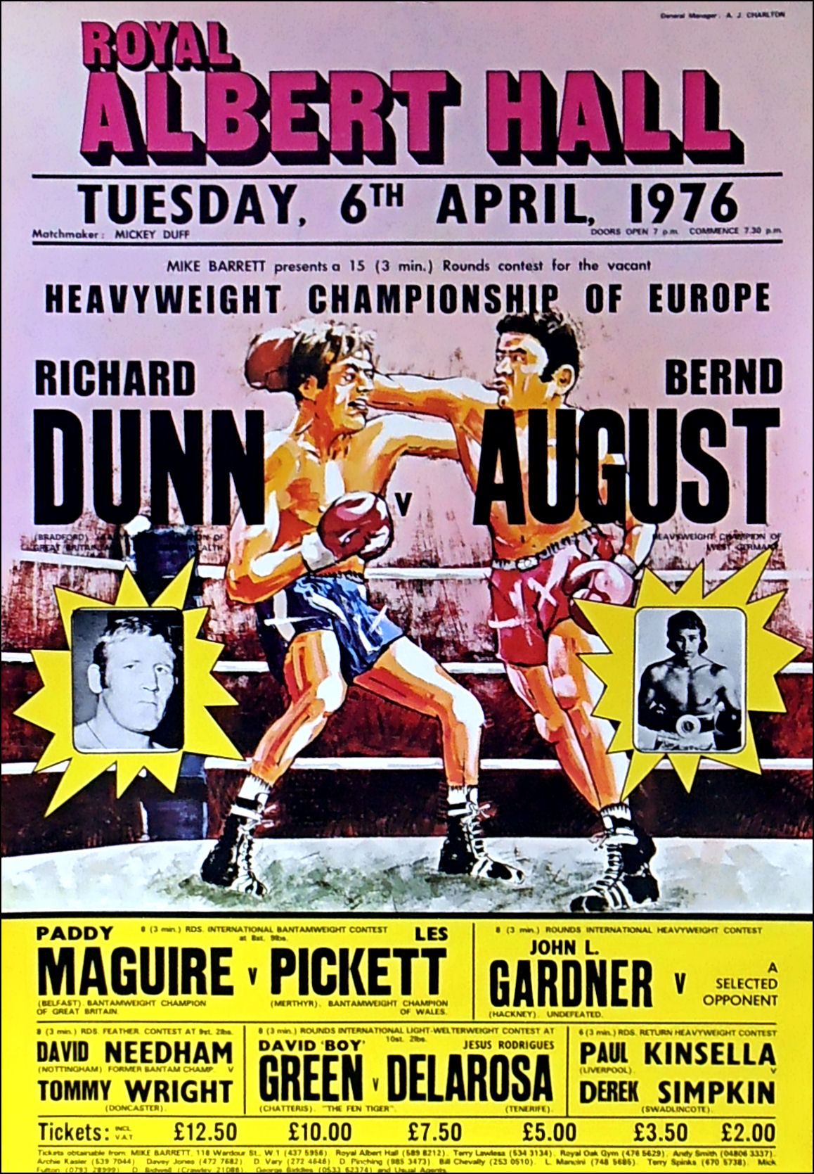 Description : Here we have a vintage 1970's onsite boxing promotional poster from the Albert Hall, London, promoting the battle for the vacant European Heavyweight Championship of Europe between England's Richard Dunn pitted against Germany's Bernd August. Dunn was victorious, winning by 3rd round TKO, this fight would springboard him straight into dreamland when he was selected by Muhammad Ali to be his next challenger for the Undisputed Heavyweight Championship of the World.