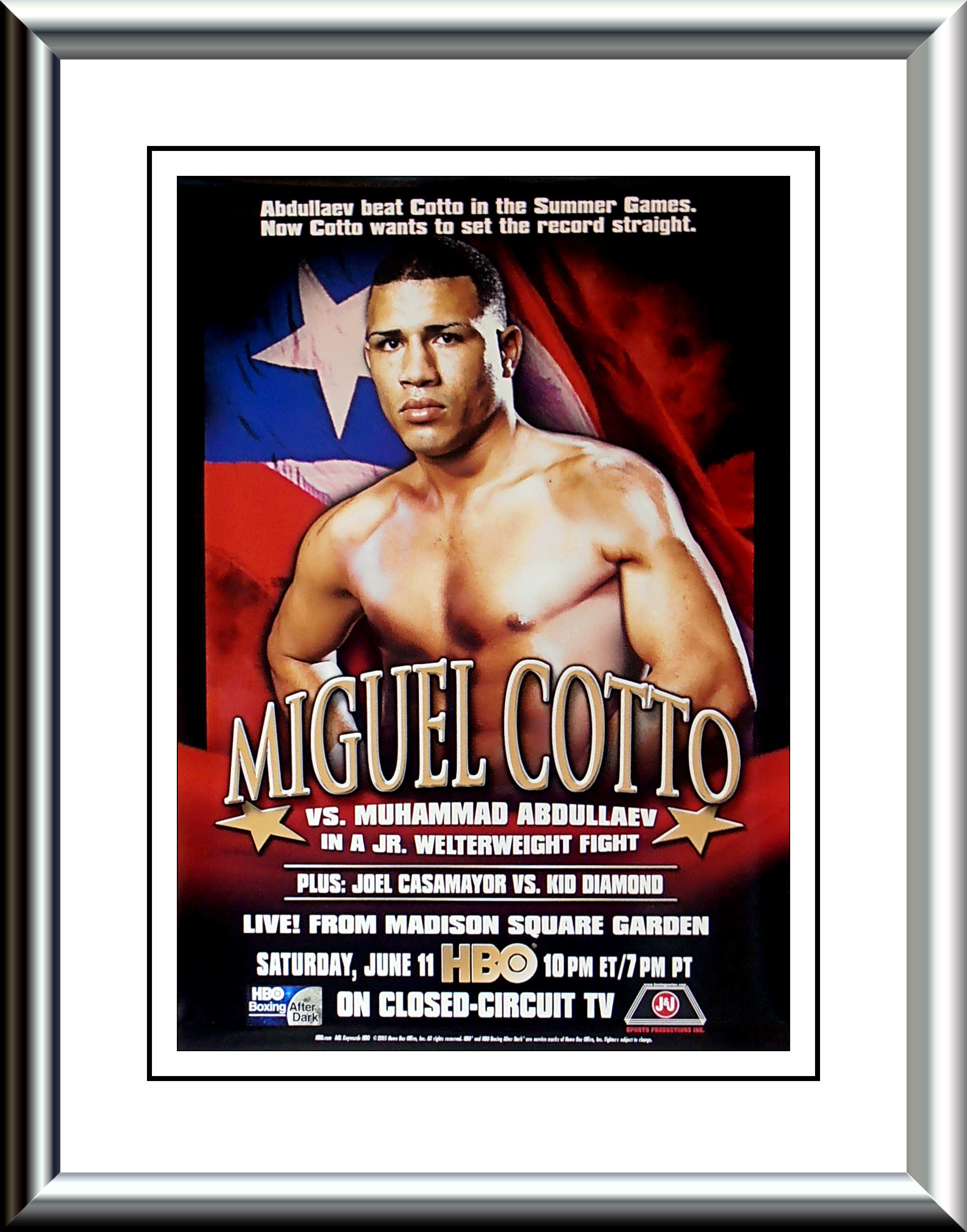 Description : Here we have an official HBO Boxing closed circuit poster for the Miguel Cotto vs. Muhammad Abdullaev WBO Light/Welterweight Championship battle on June 11, 2005 at Madison Square Garden.
