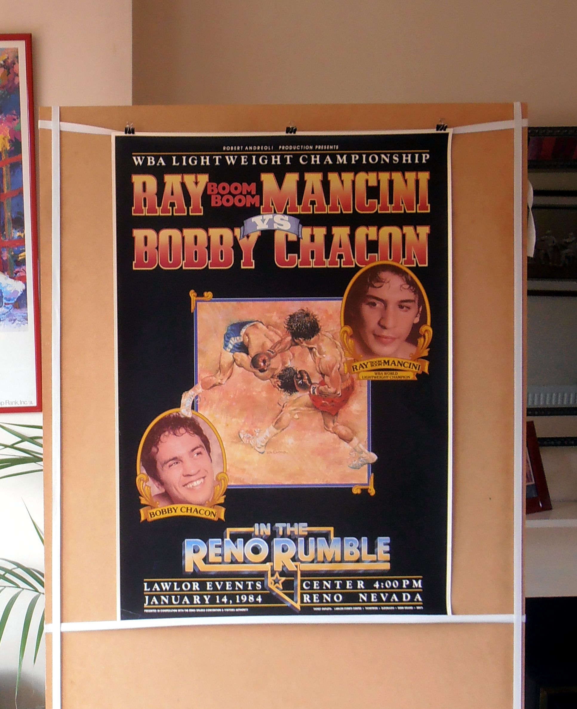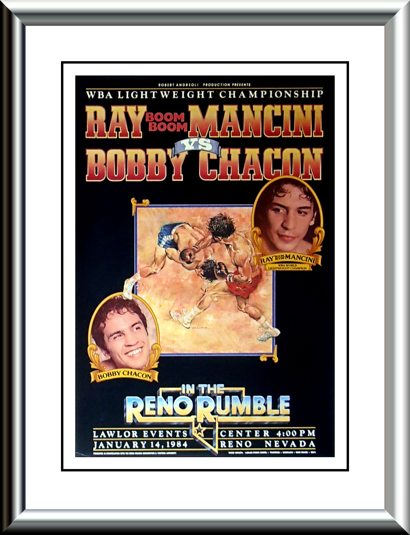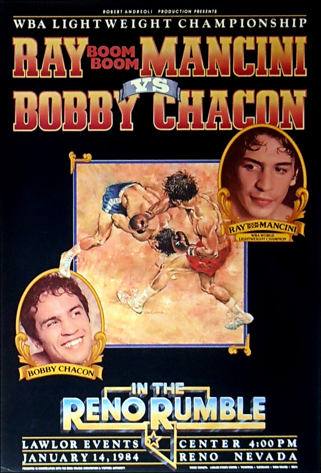 Description : Here we have an original vintage 1980's onsite poster from the Lawlor Events Centre in Reno Nevada for the WBA lightweight championship battle between reigning & defending champion Ray Mancini pitted against the challenger, granite tough Bobby Chacon who was stepping up in weight. Ray Mancini jumped on Chacon from the 1st bell, pinning Chacon to the ropes & hammered away at the smaller man, by the 3rd round the Brave Chacon was a defenceless, battered shell, trapped on the ropes, the referee Richard Steele stopped the massacre in the third round with blood dripping from Chacon's left eye.