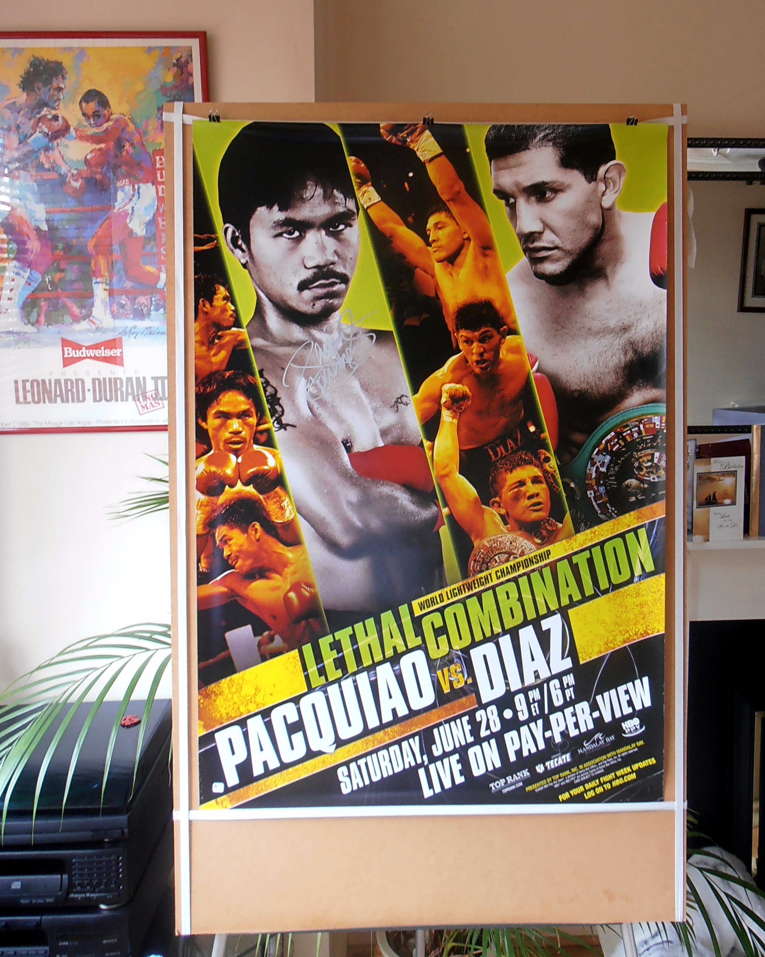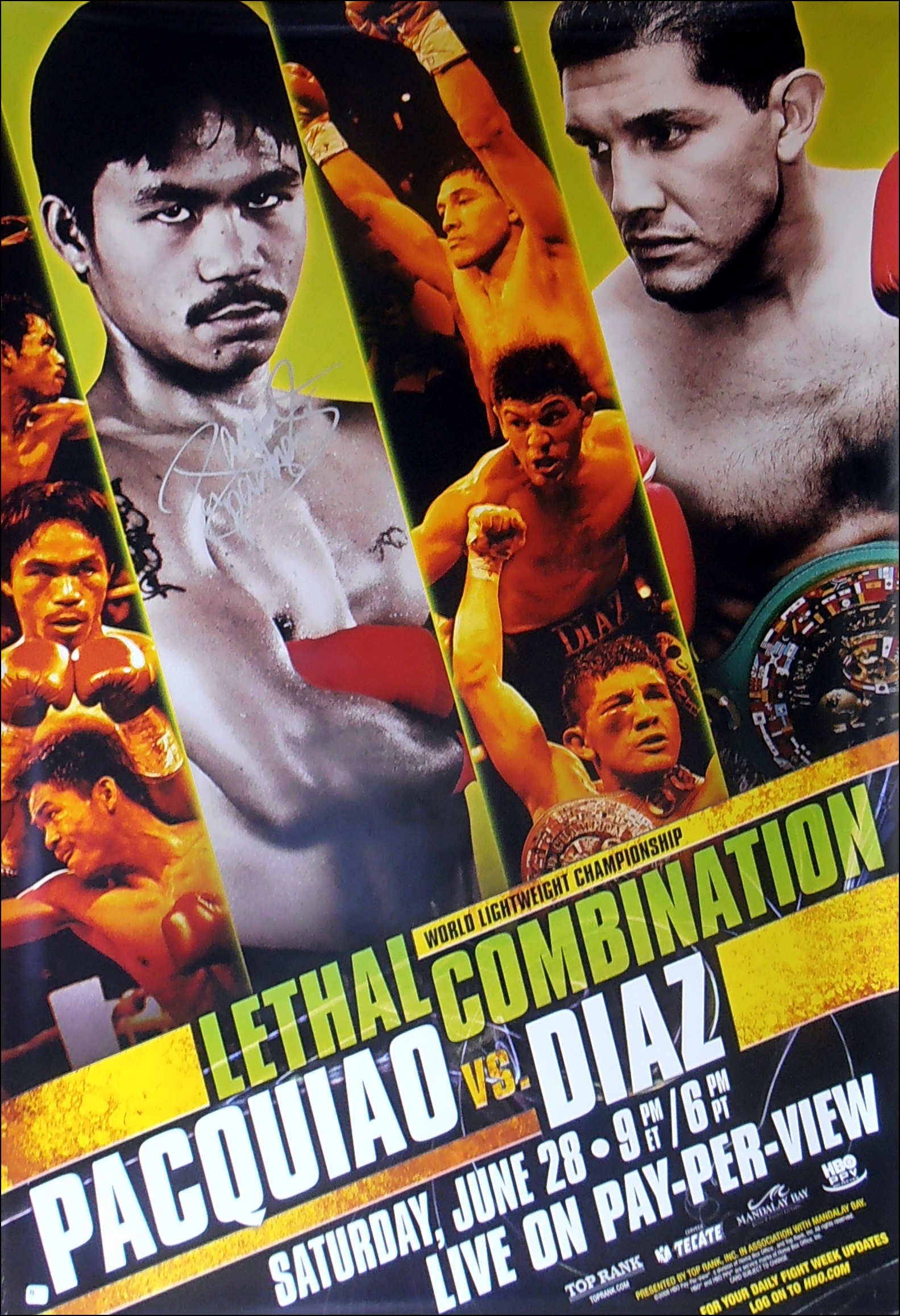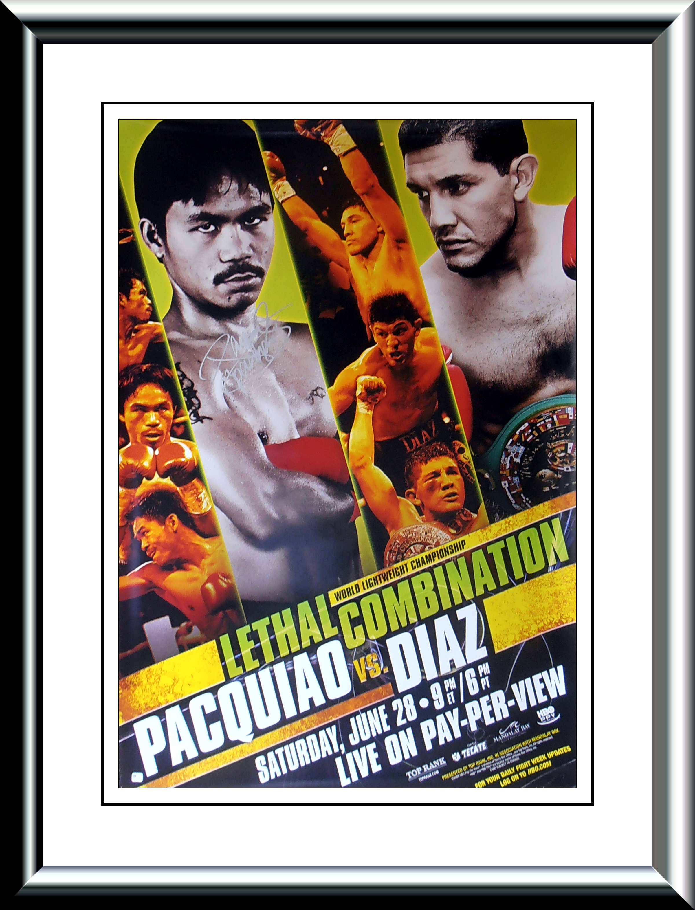 Description : Here we have an authentic Manny Pacquiao autographed super scarce official full size HBO Boxing pay per view poster for the battle between defending WBC Lightweight Champion David Diaz & Manny "Pacman" Pacquiao.