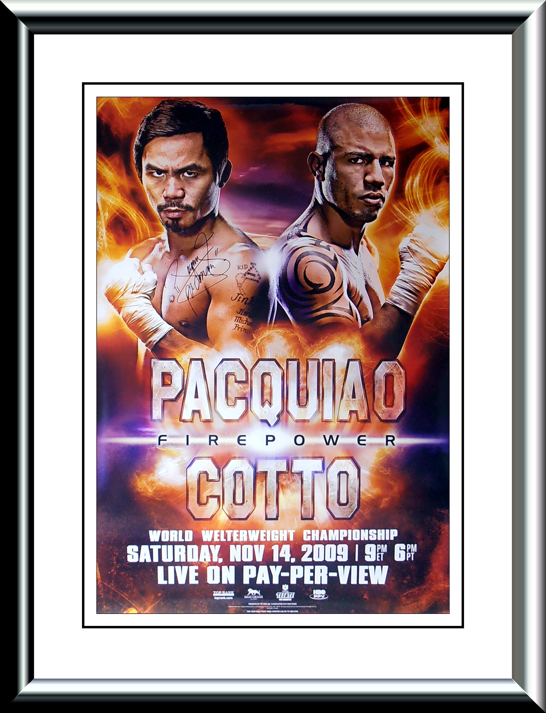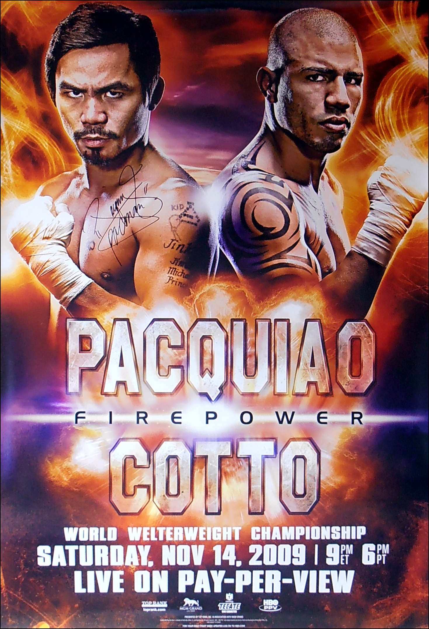 Description : Here we have an official full-size HBO Boxing Pay-Per-View poster for the showdown at the MGM Grand Las Vegas for the WBO Welterweight Title. This poster has been signed by Manny Pacquiao at the final presser for the fight.