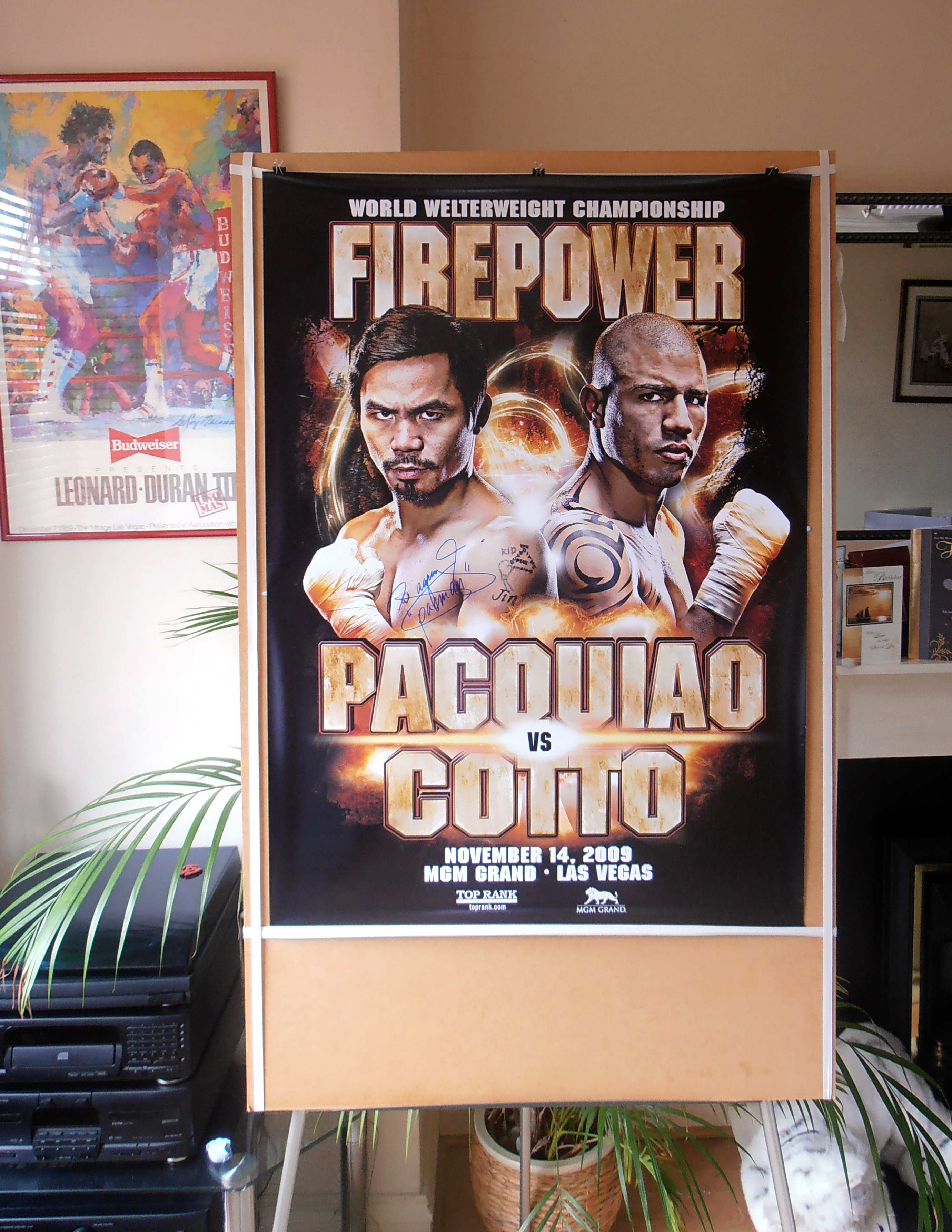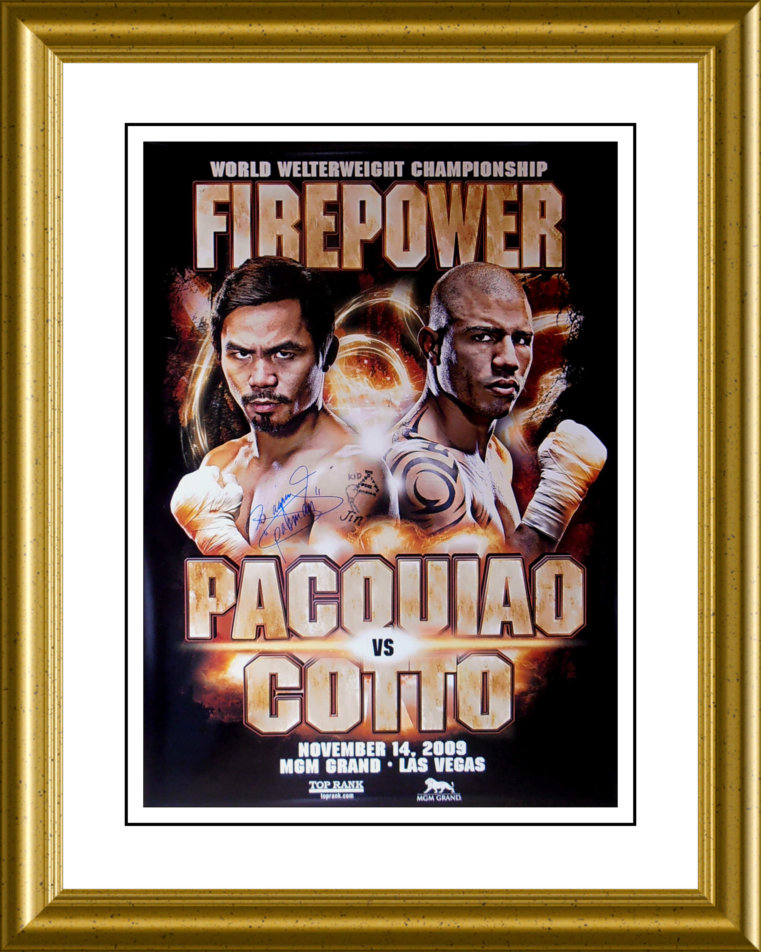 Description : Here we have an official full-size MGM Grand onsite main event fight poster for the showdown held at the MGM Grand garden Arena Las Vegas, for the WBO Welterweight Title. This poster has been signed by Manny Pacquiao at the final presser for the fight.