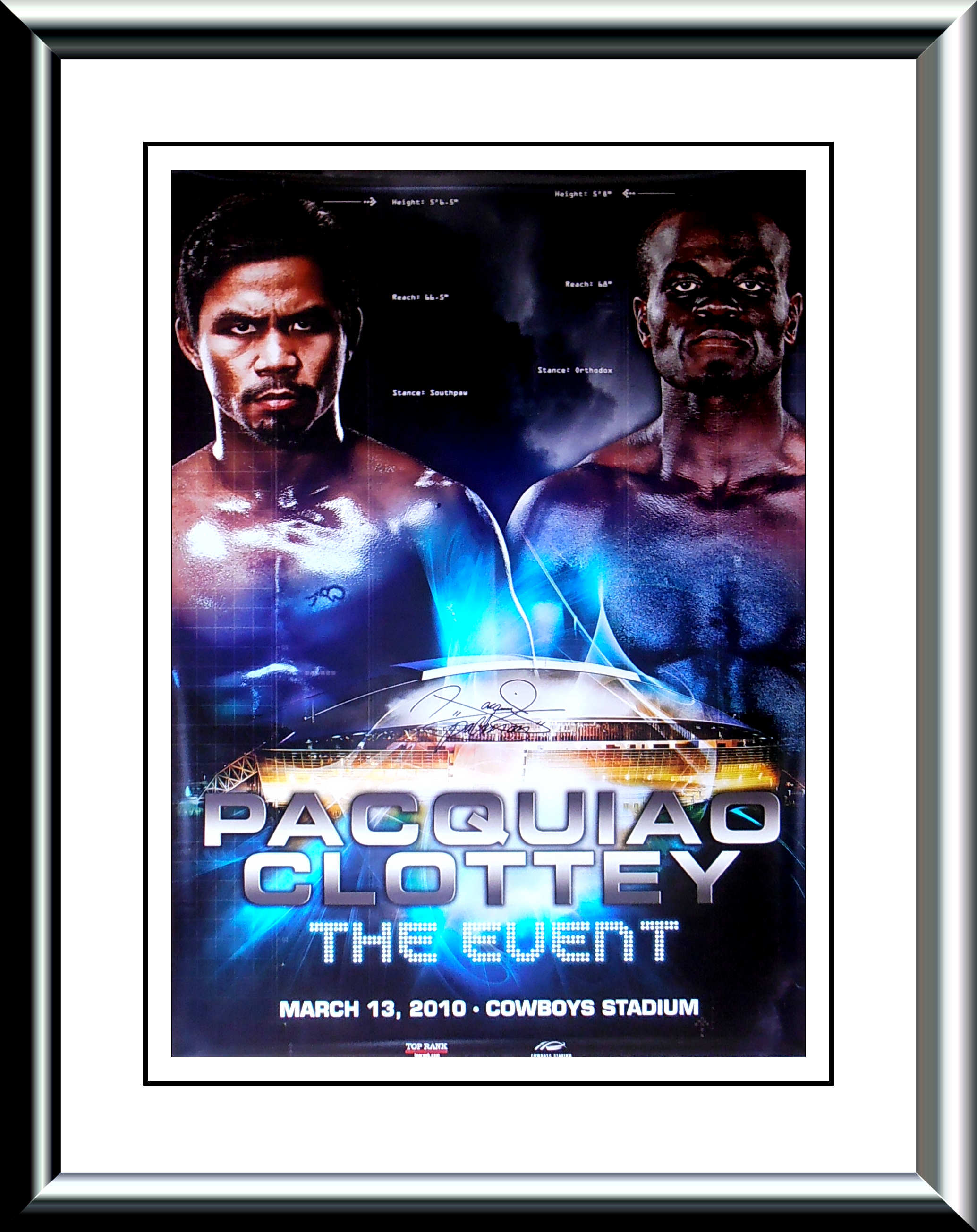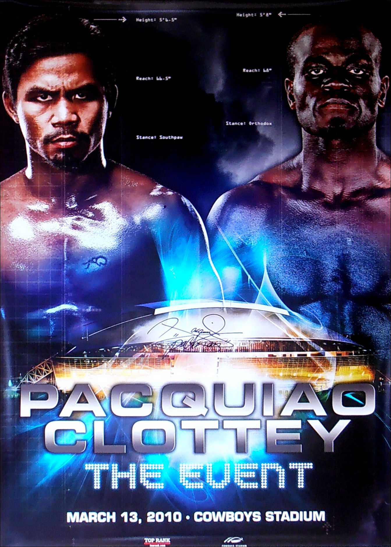 Description : Here we have an original full-sized main event boxing poster billed as "The Event" for the WBO World welterweight championship. The bout was held on March 13, 2010, at Cowboys Stadium, in Arlington, Texas, United States. This match was put together after the long awaited "superfight" between Manny Pacquiao and Floyd Mayweather, Jr. had fallen through.....This poster has been autographed by Manny Pacquiao.