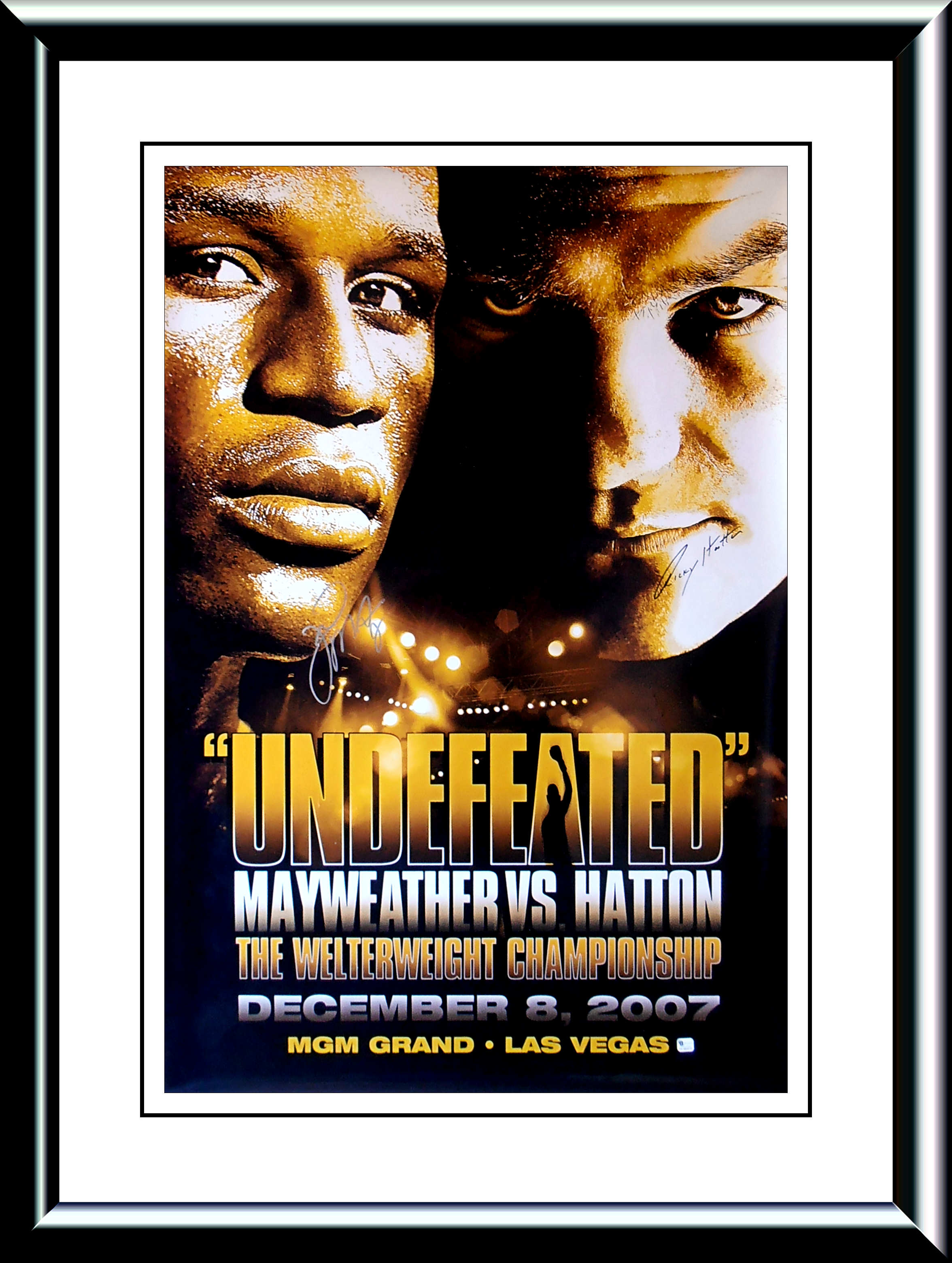 This authentic Floyd Mayweather Jr & Ricky Hatton autographed onsite poster from the MGM Grand Las Vegas is accompanied with a Global Authentics Cert & a LOA lifetime guarantee of authenticity from KOfightposters.