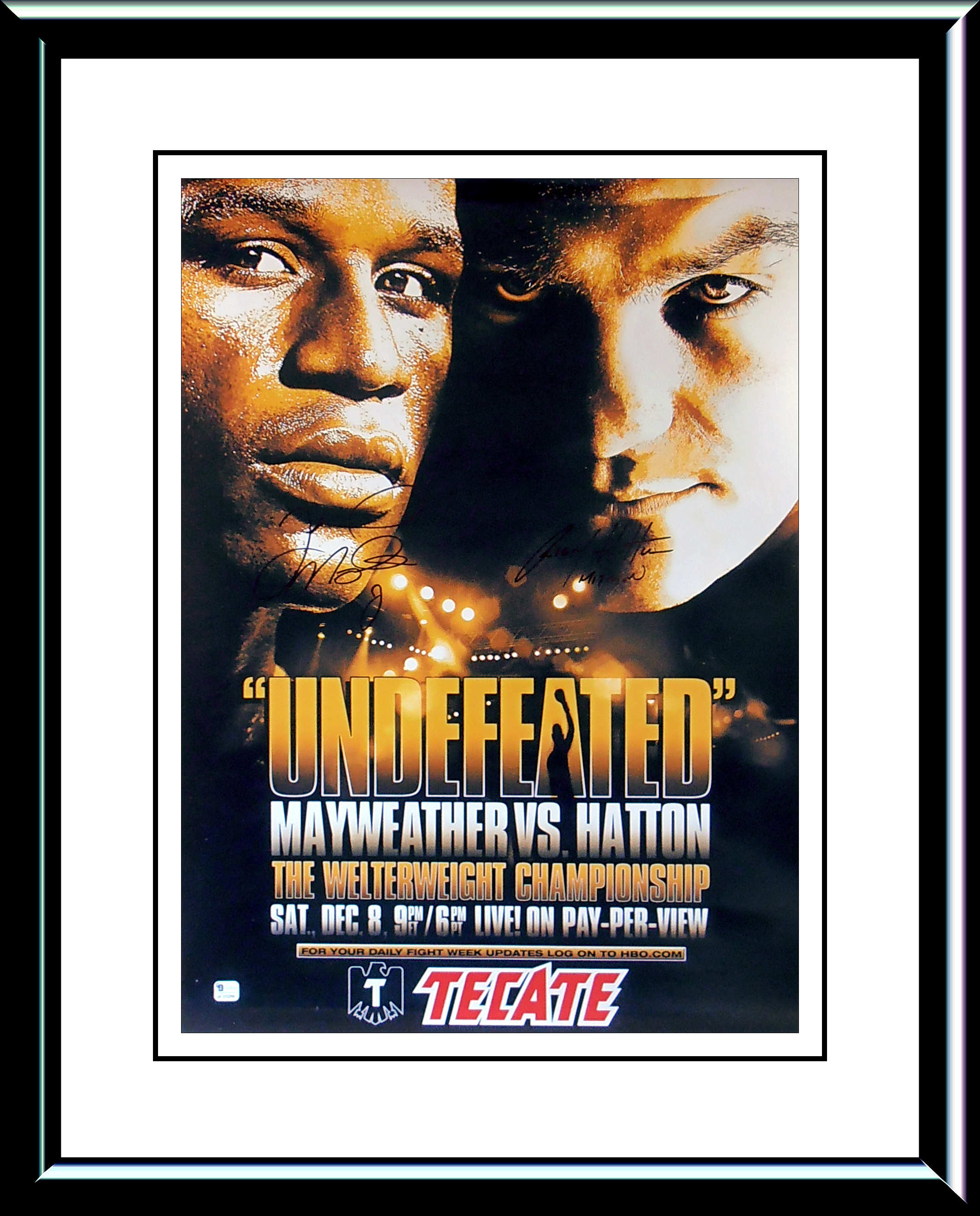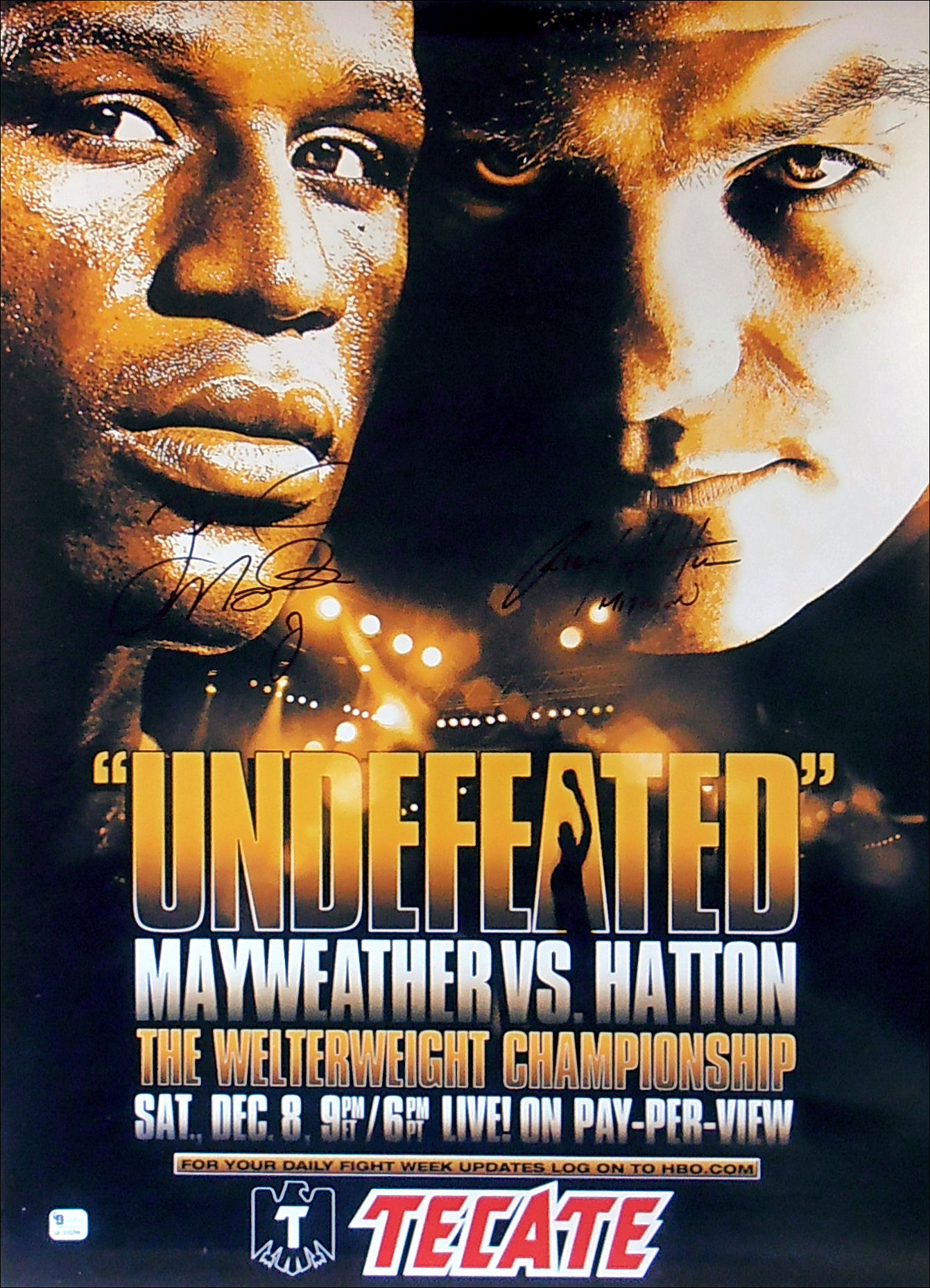 This authentic Floyd Mayweather Jr & Ricky Hatton autographed 'Tecate' official fight sponsors poster from the MGM Grand Las Vegas is accompanied with a lifetime guarantee of authenticity from KOfightposters.
