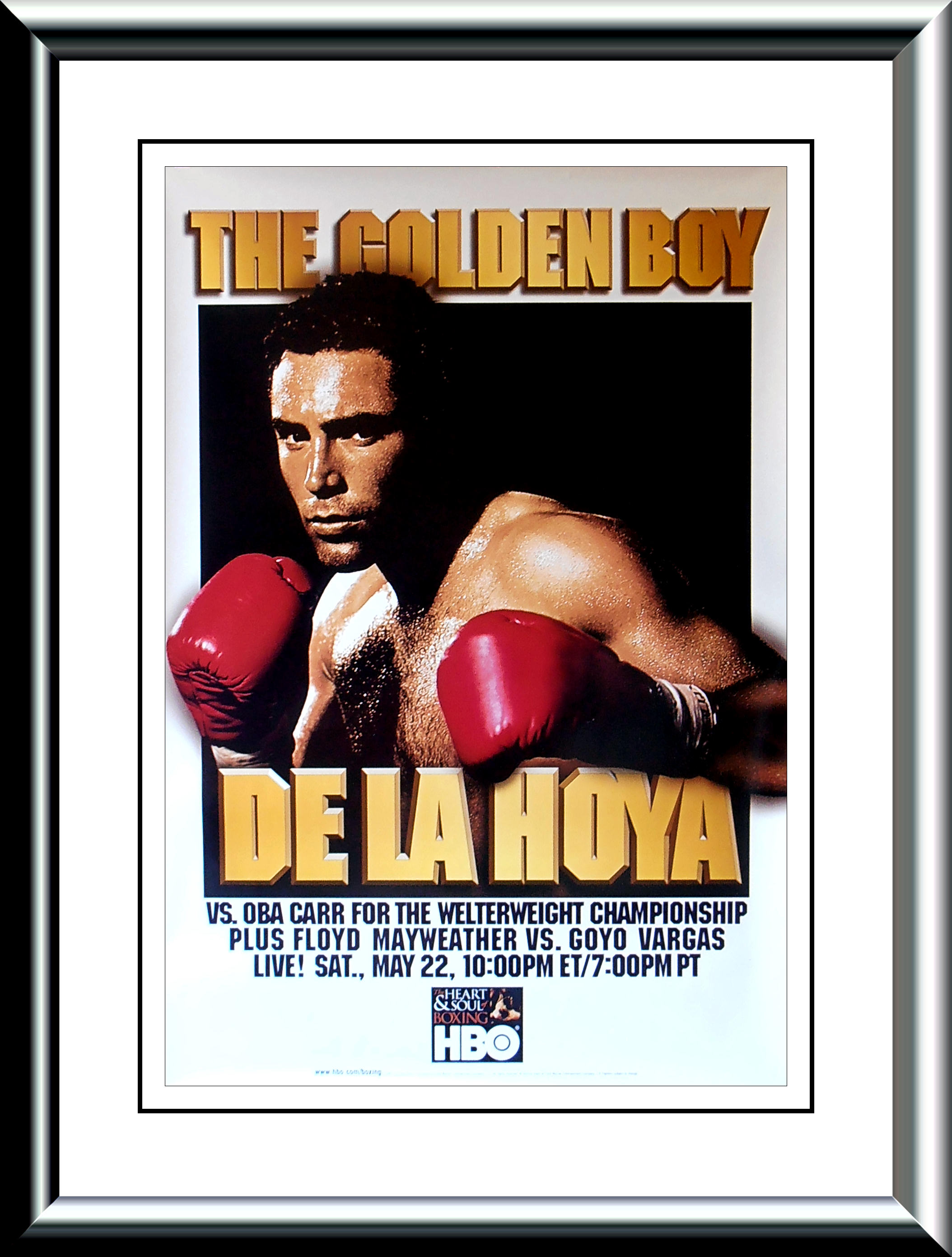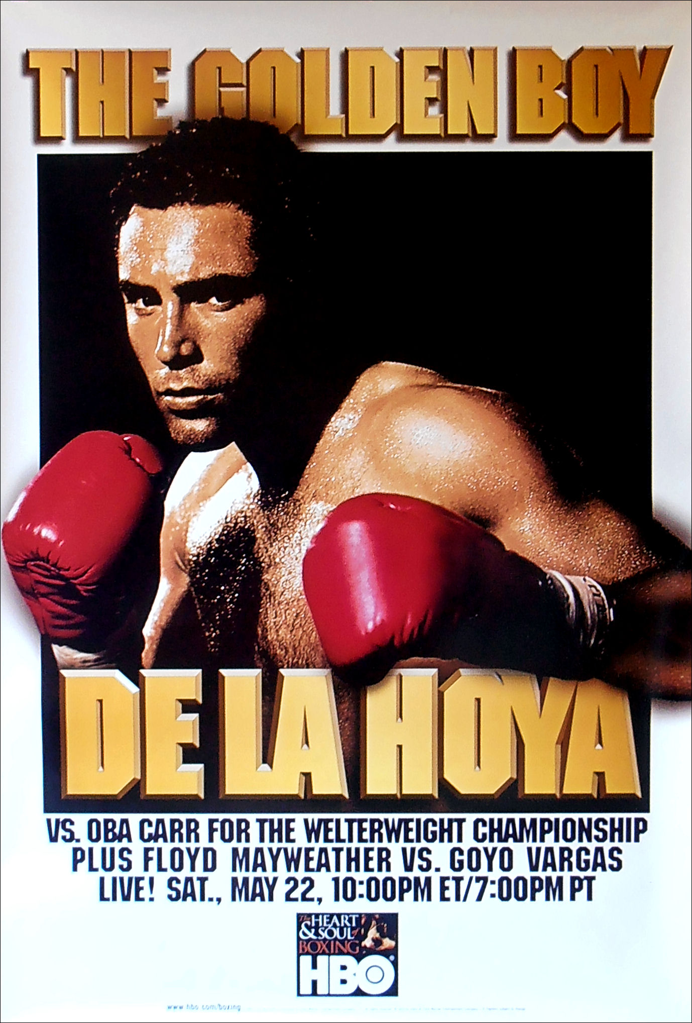 Description : Here we have an original HBO Boxing closed circuit poster for the WBC Welterweight Title bout at the Mandalay Bay Resort & Casino, Las Vegas, Nevada, USA, with the reigning & defending champion Oscar De la Hoya defending his WBC Welterweight Title against Oba Carr who was the Kronk based challenger out of Detroit, Michigan, USA. oscar De la Hoya settled this fight in the 11th round winning by TKO, well up on the judges scorecards at the time, scores as follows: | judge: Carol Castellano 96-91 | judge: Chuck Giampa 95-92 | judge: Jerry Roth 97-90