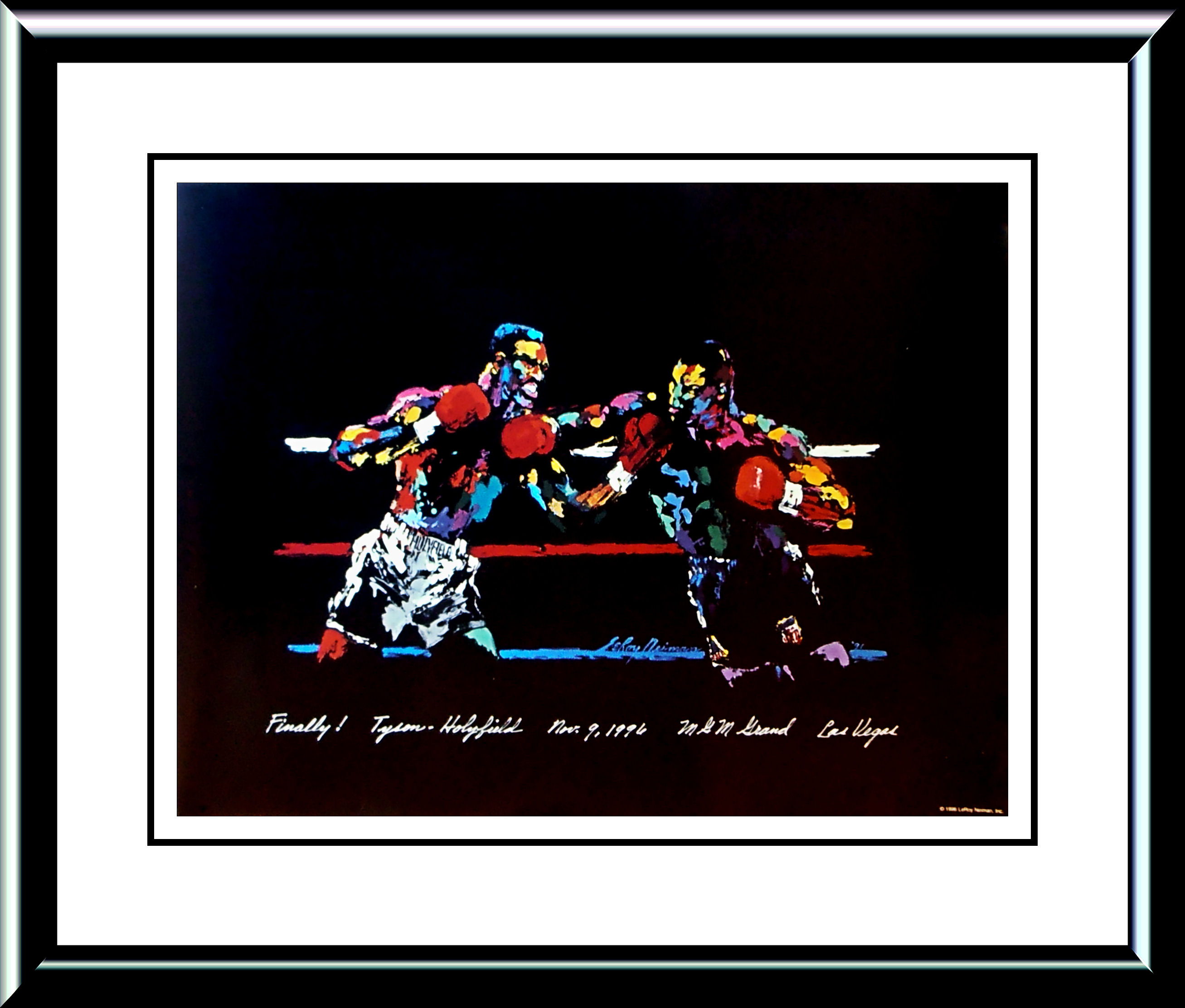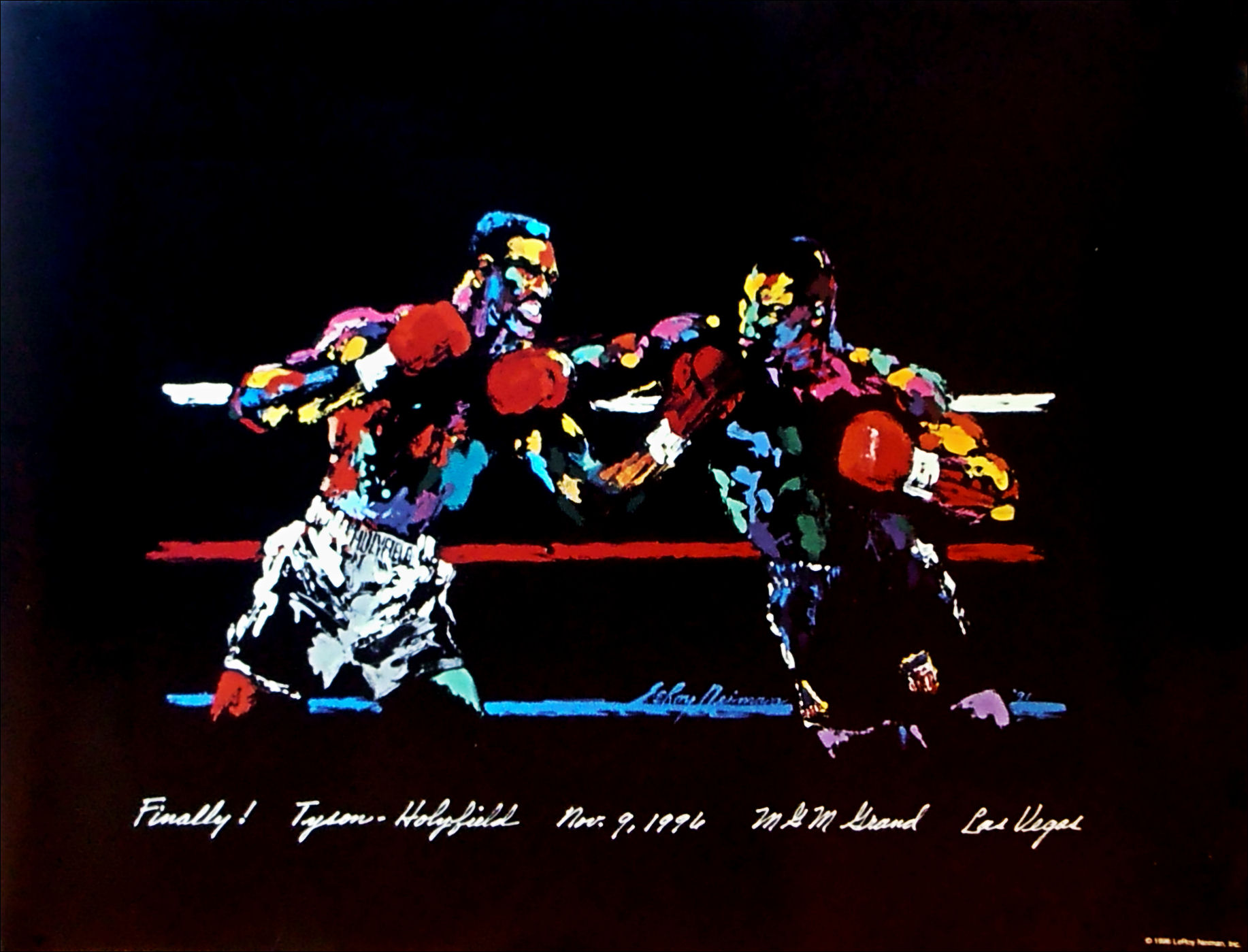 Description : Here we have a fantastic super rare onsite poster from the late great world famous sports artist, Leroy Neiman who had the original commission from Caesars Palace back in 91 to produce an art work for the original fight date that was cancelled due to Tyson injury & then Tyson's subsequent imprisonment. This fantastic piece of art was resurrected for the long awaited battle between Tyson & Holyfield in November 96 for the WBA Heavyweight Title, which Don King gave the handle of 'FINALLY'