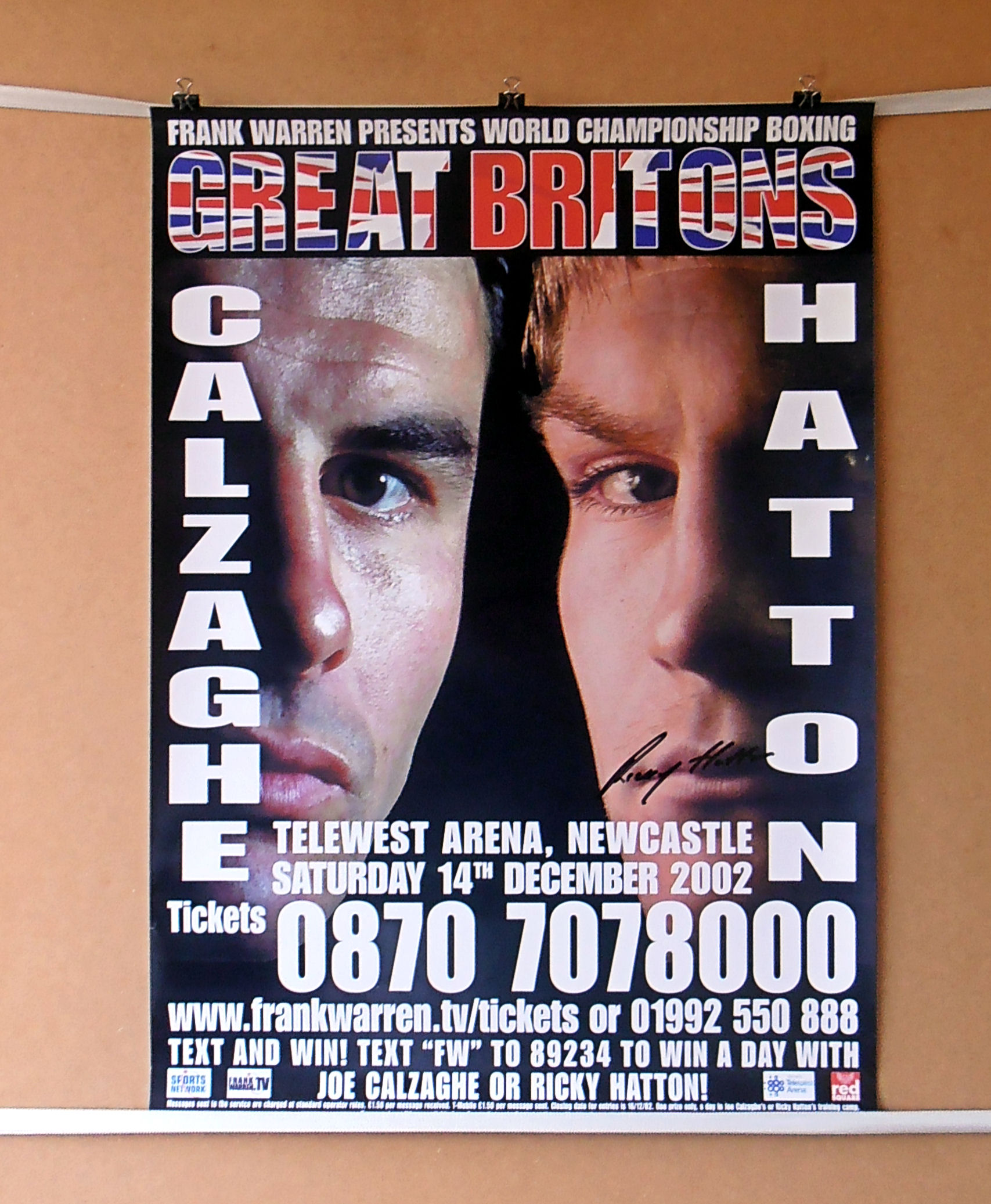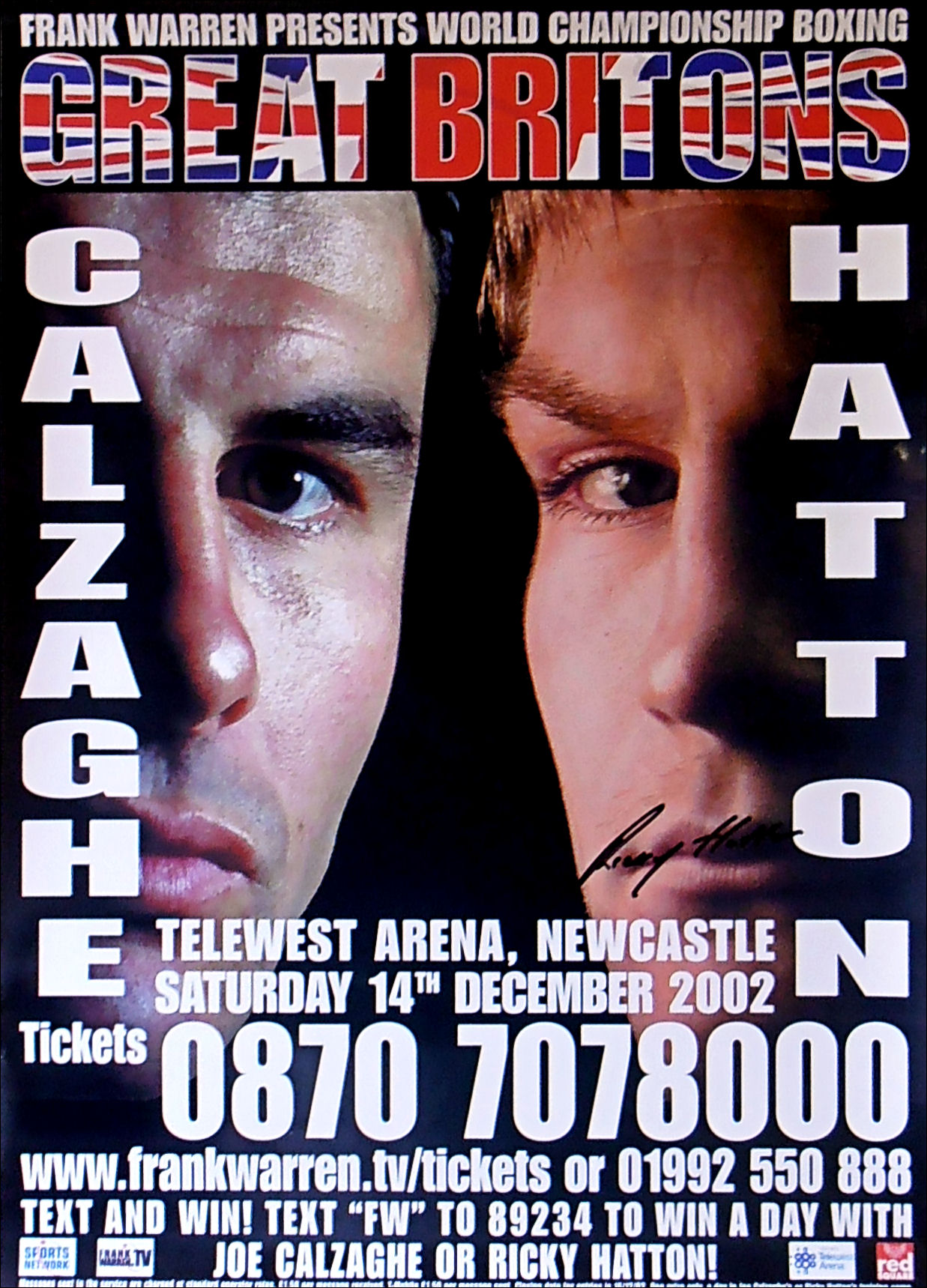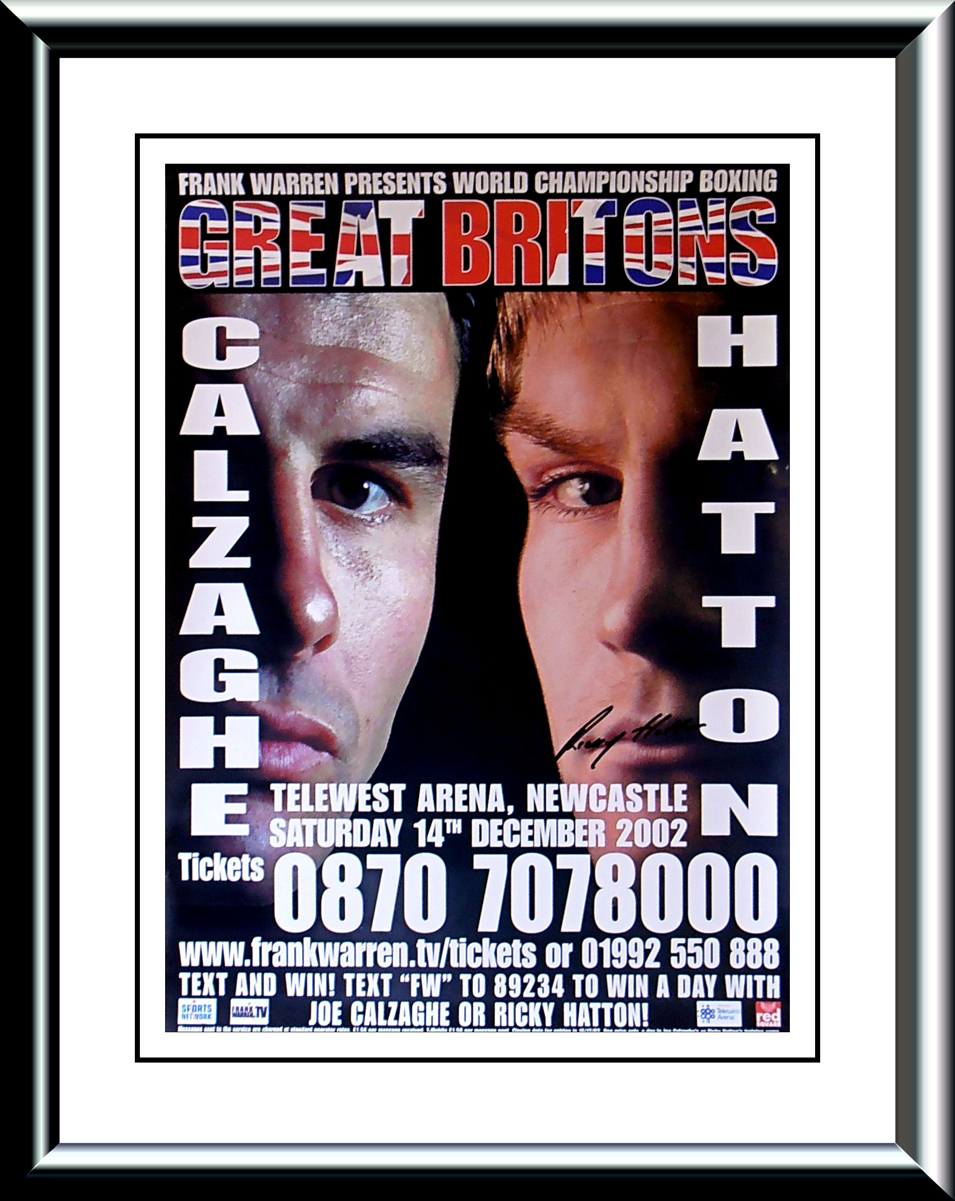 Description : Here we have the Frank Warren promotional poster for the Ricky Hatton WBU Light/Welterweight Title defence & Joe Calzaghe WBO Super/Middleweight Title defence staged at the Telewest Arena Newcastle on December 2002....This poster has been signed by Ricky Hatton!