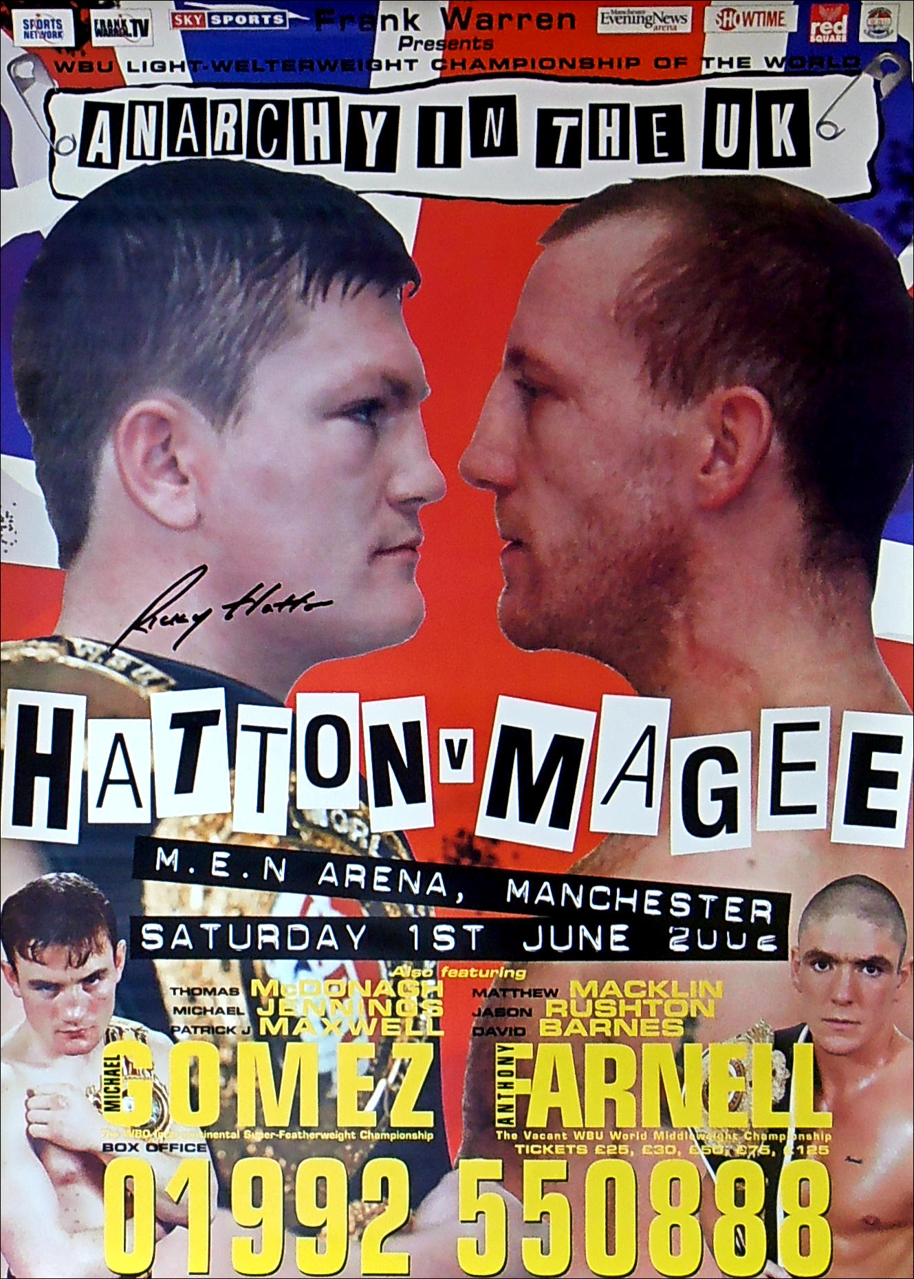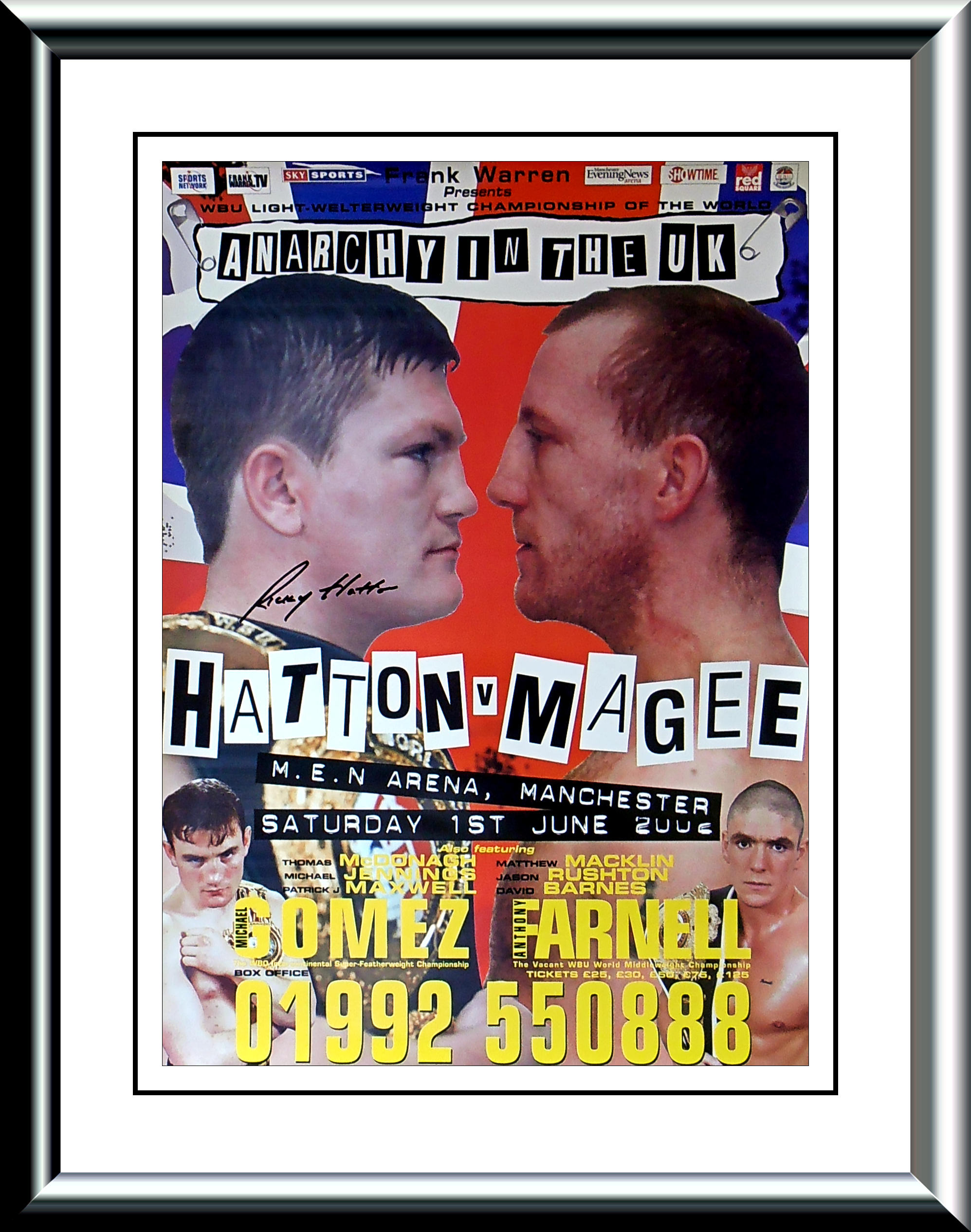Description : Here we have the Frank Warren promotional poster for the eagerly awaited showdown between Ricky Hatton & Eamonn Magee....This was Eamonn Magee's highest profile fight, when he took on Ricky Hatton for the WBU Light Welterweight Title which took place at the Manchester Evening News Arena in 1 June 2002 and was billed as "Anarchy in the UK" and was a 20,000 ticket sell out....This poster has been signed by Ricky Hatton!