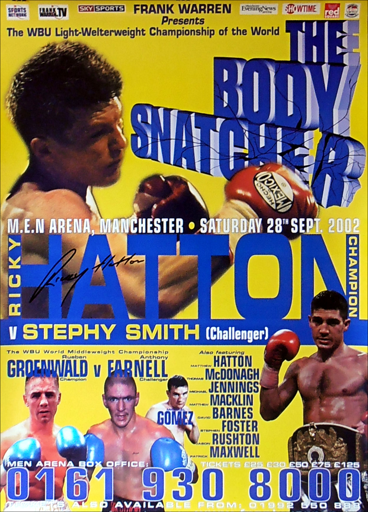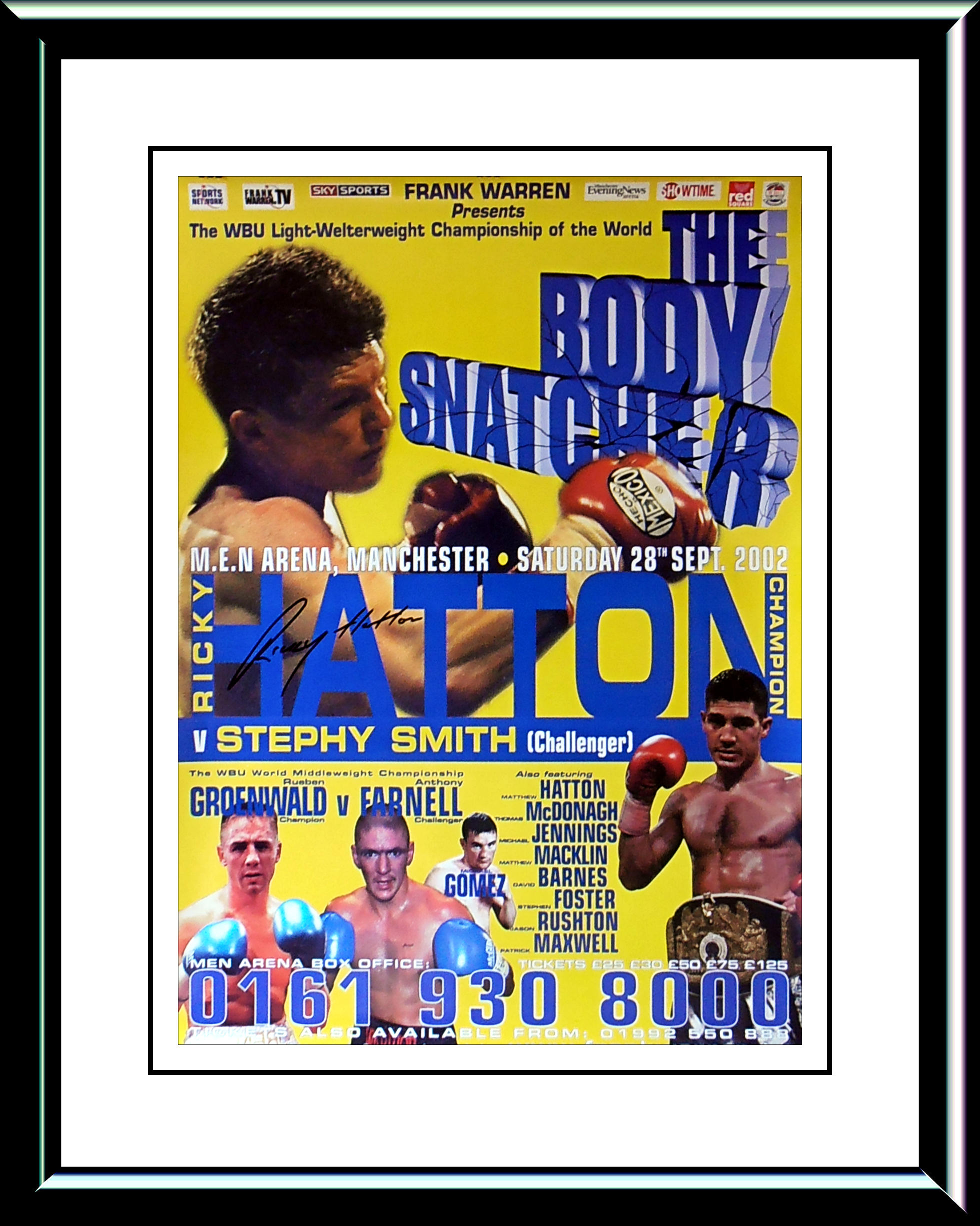 Description : He we have an original Frank Warren promotions poster for the Ricky Hatton WBU Light/Welterweight title defence against Stephen Smith which took place at the M.E.N Arena in Manchester. This fight lasted just 2 rounds due to an incident in the 2nd round after his father/trainer Darkie Smith ran into the ring to protest about a cut caused by an apparent elbow from Hatton. It turned ugly & the referee Mickey Vann had no option but to disqualify the challenger Stephen Smith.....This poster has been signed by Ricky Hatton!