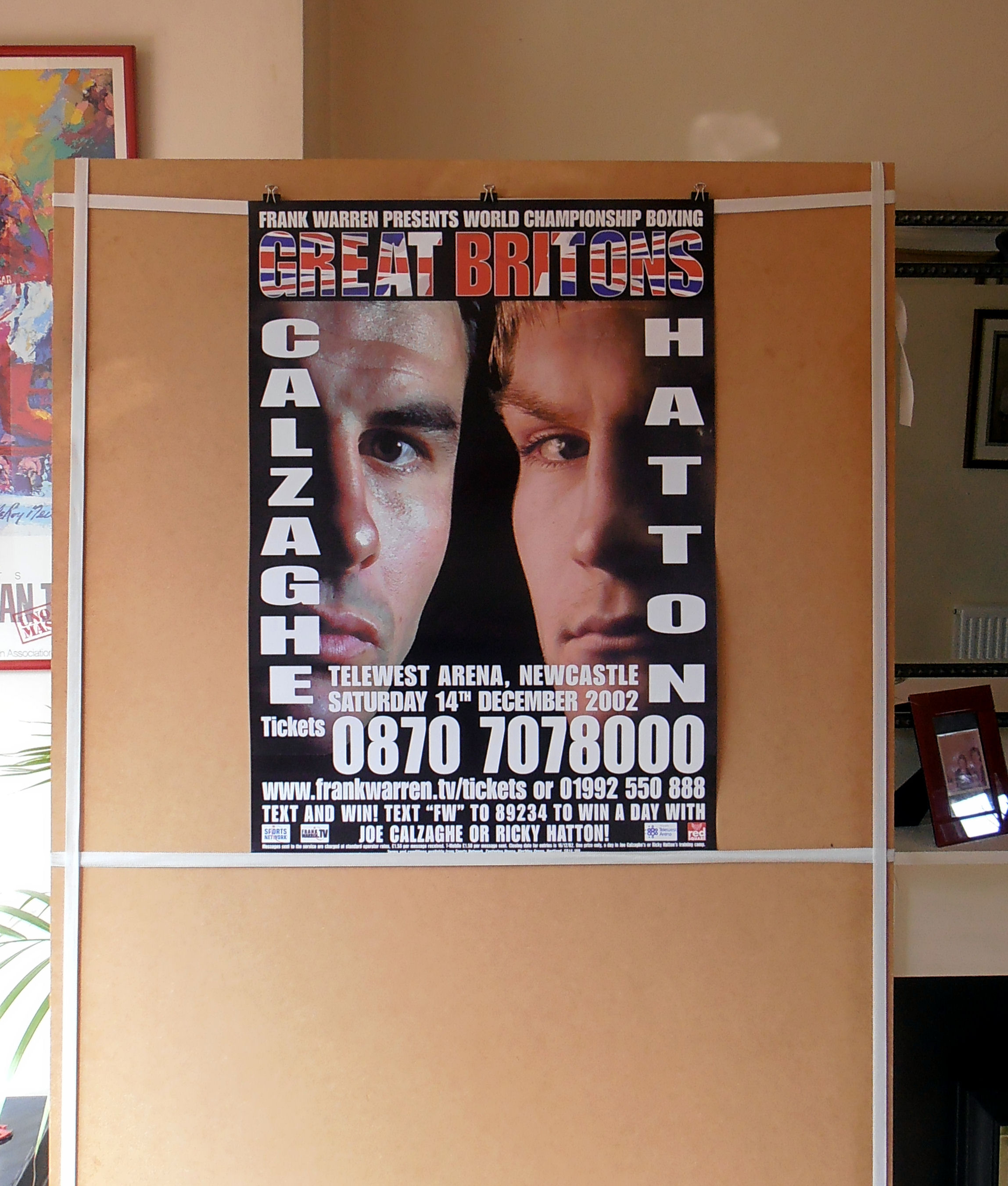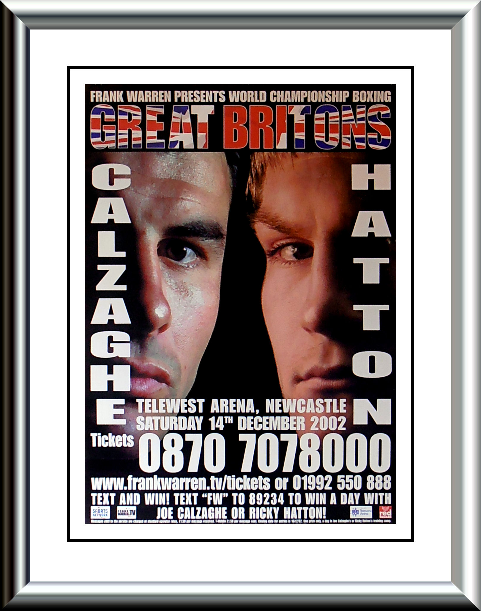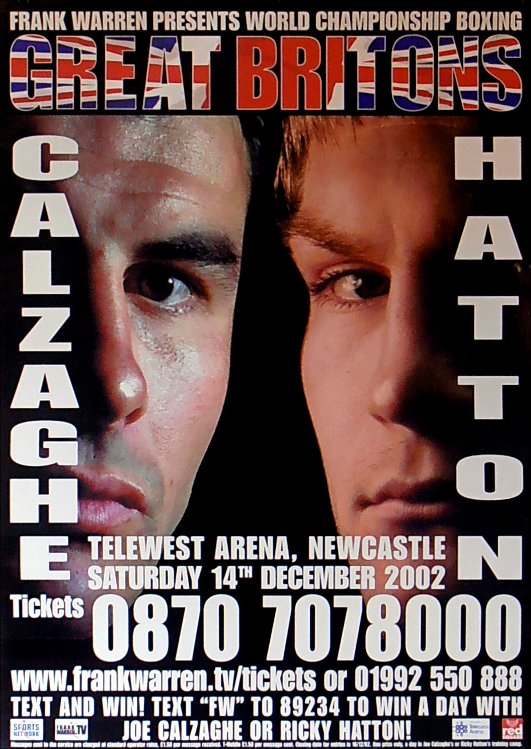 Description : Here we have the Frank Warren promotional poster for the Joe Calzaghe WBO Super/Middleweight Title defence against the American Tocker Pudwill & Ricky Hatton WBU Light/Welterweight Title defence against American Joe Hutchinson staged at the Telewest Arena Newcastle on December 2002.