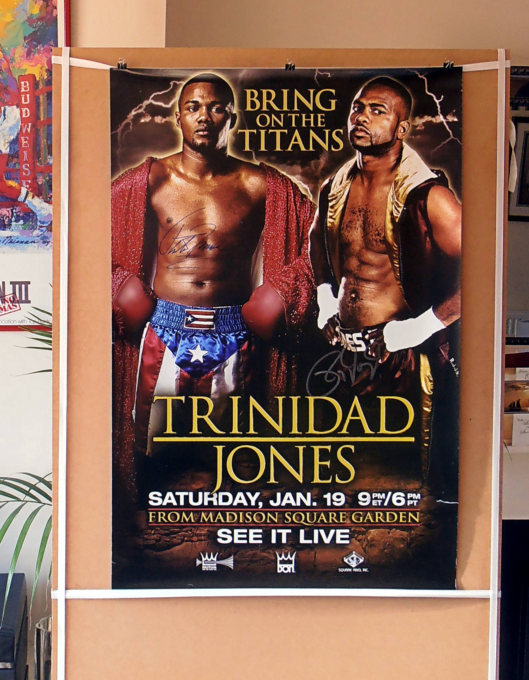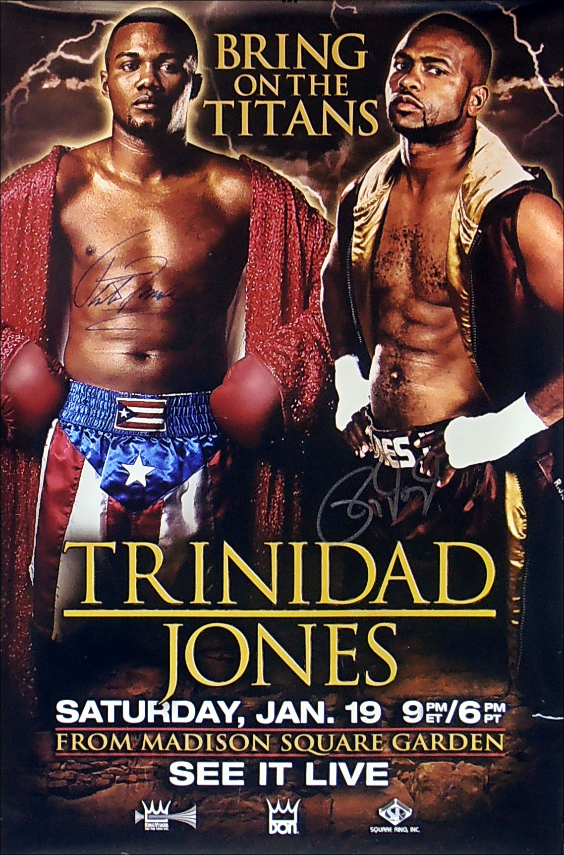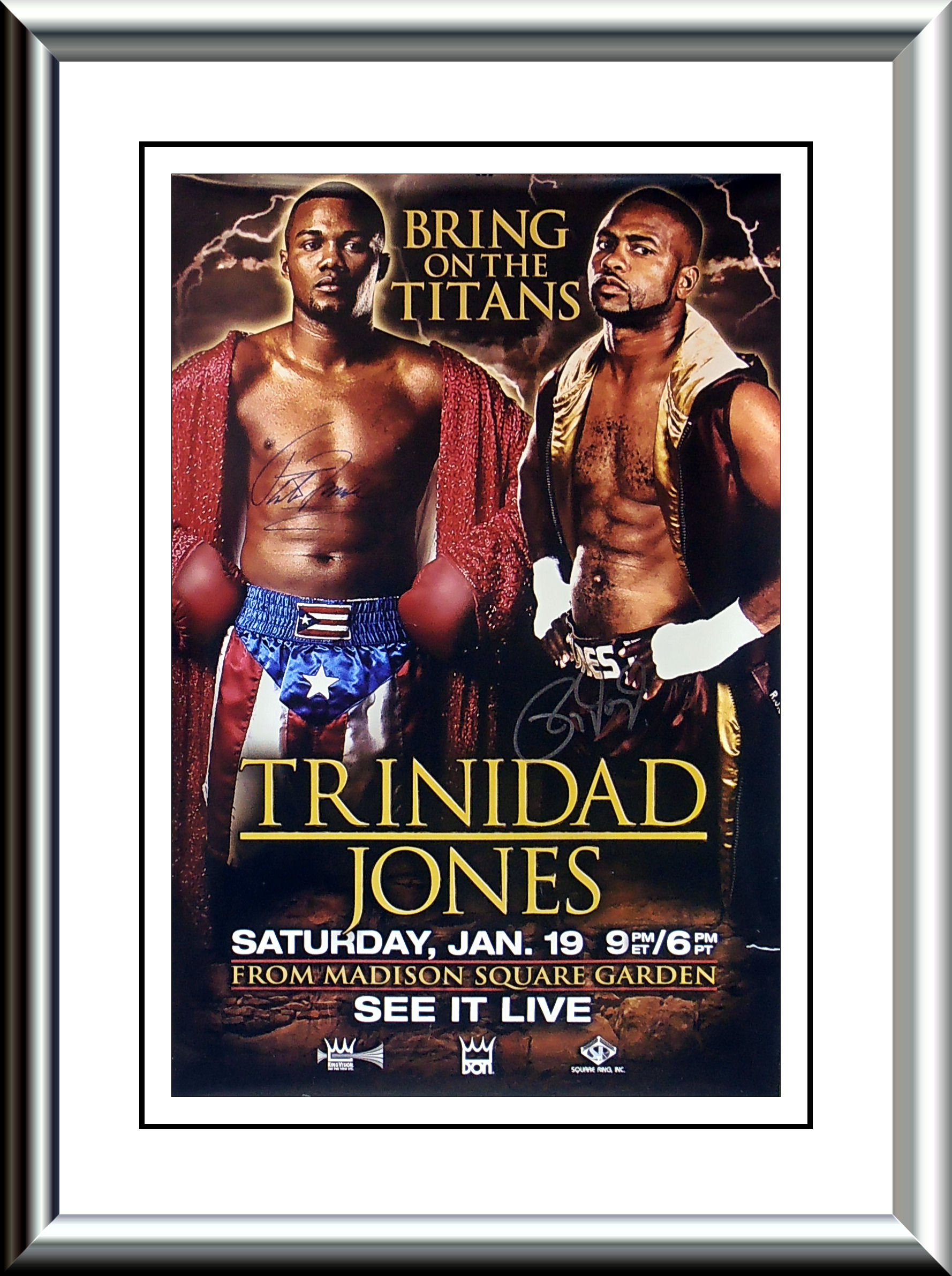 Description : Here we have an original Don King closed circuit poster for the non-title fight held at the Madison Square Garden Arena New York. This poster has been signed by Puerto Rican legend Felix 'Tito' Trinidad & the great Roy Jones Jr.