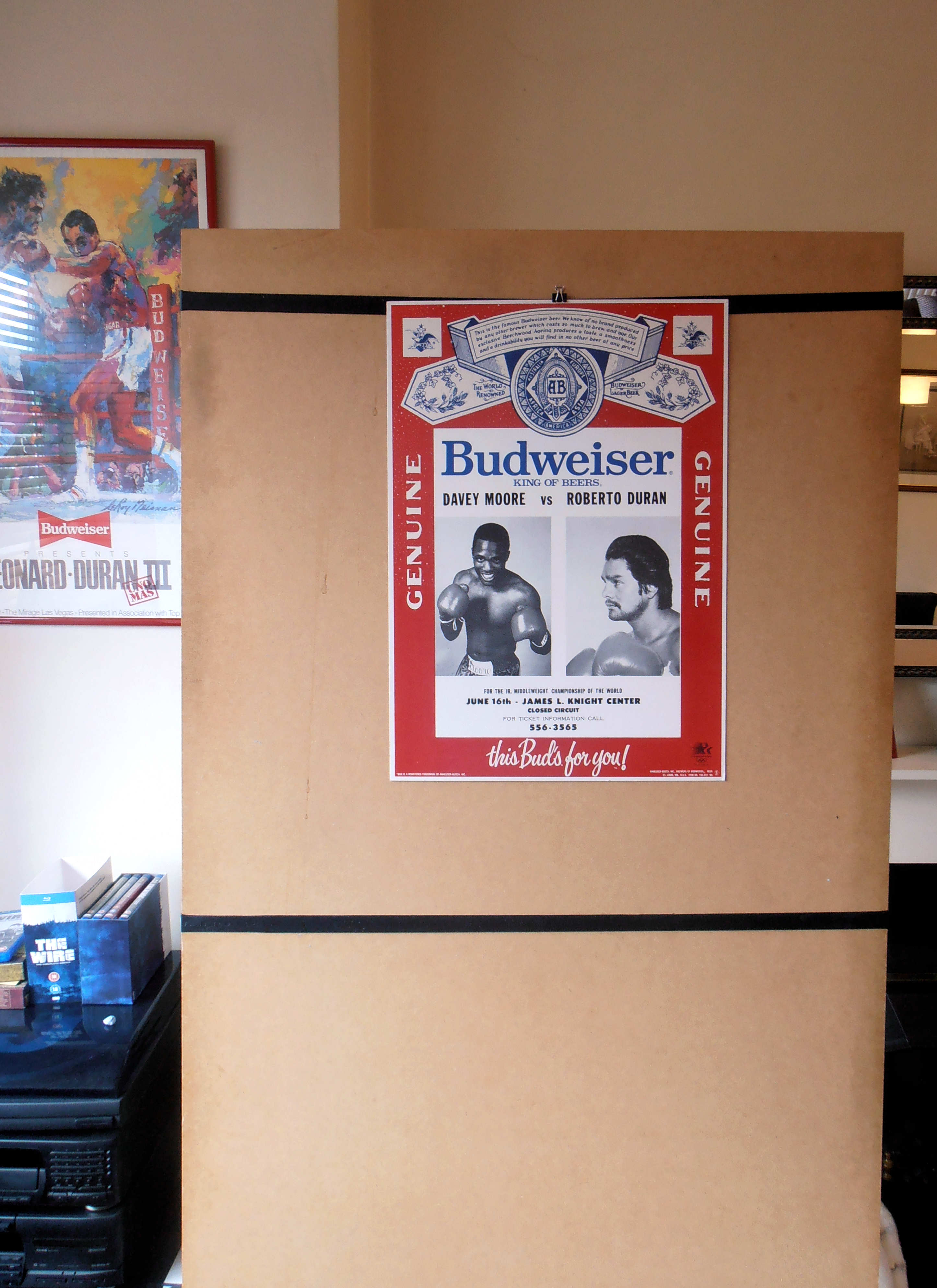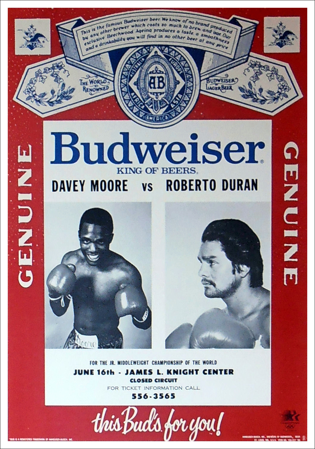 Description : Here we have one of the holy grails of boxing posters. A super rare vintage Budweiser official fight sponsors closed circuit poster from one of the most momentous nights in boxing history. The night the great Roberto Duran turned back the clock when he smashed the crap out of defending WBA Light/Middleweight champion Davey Moore.