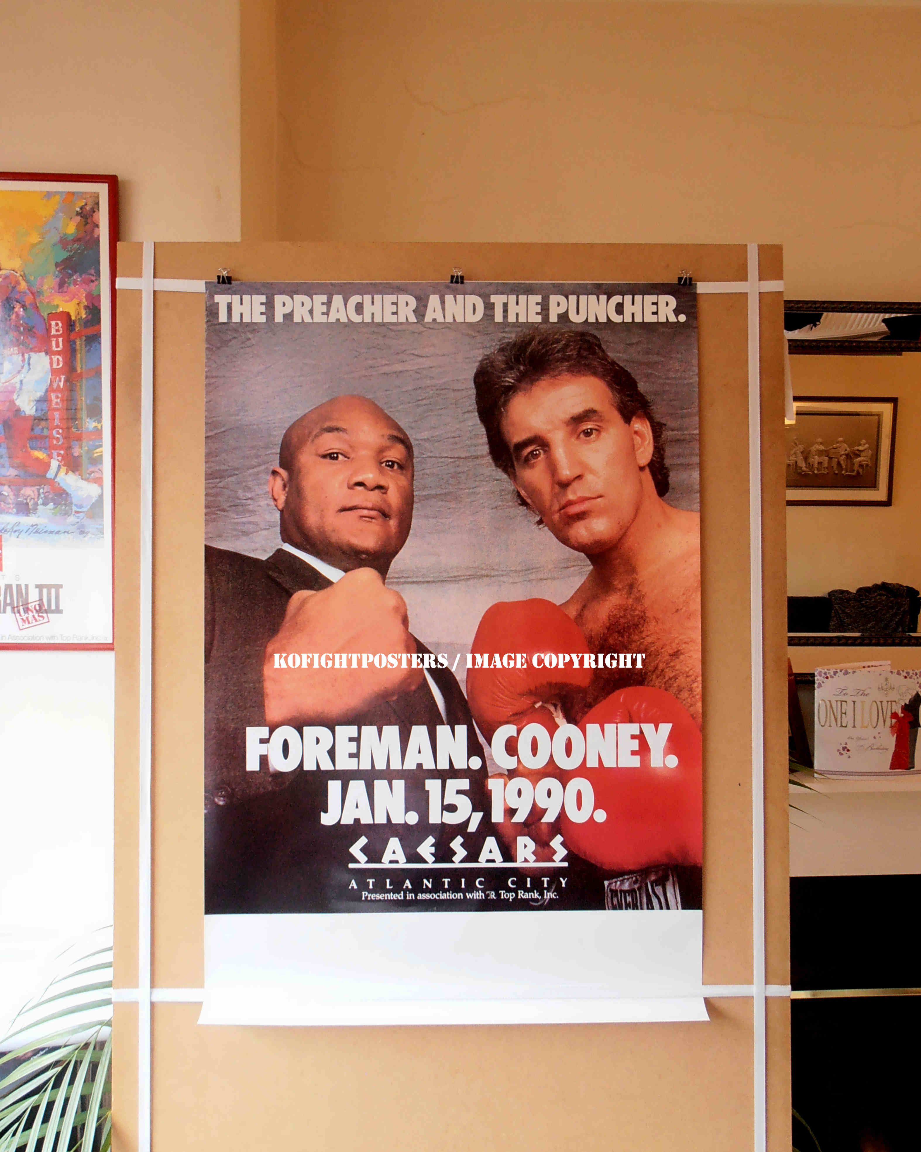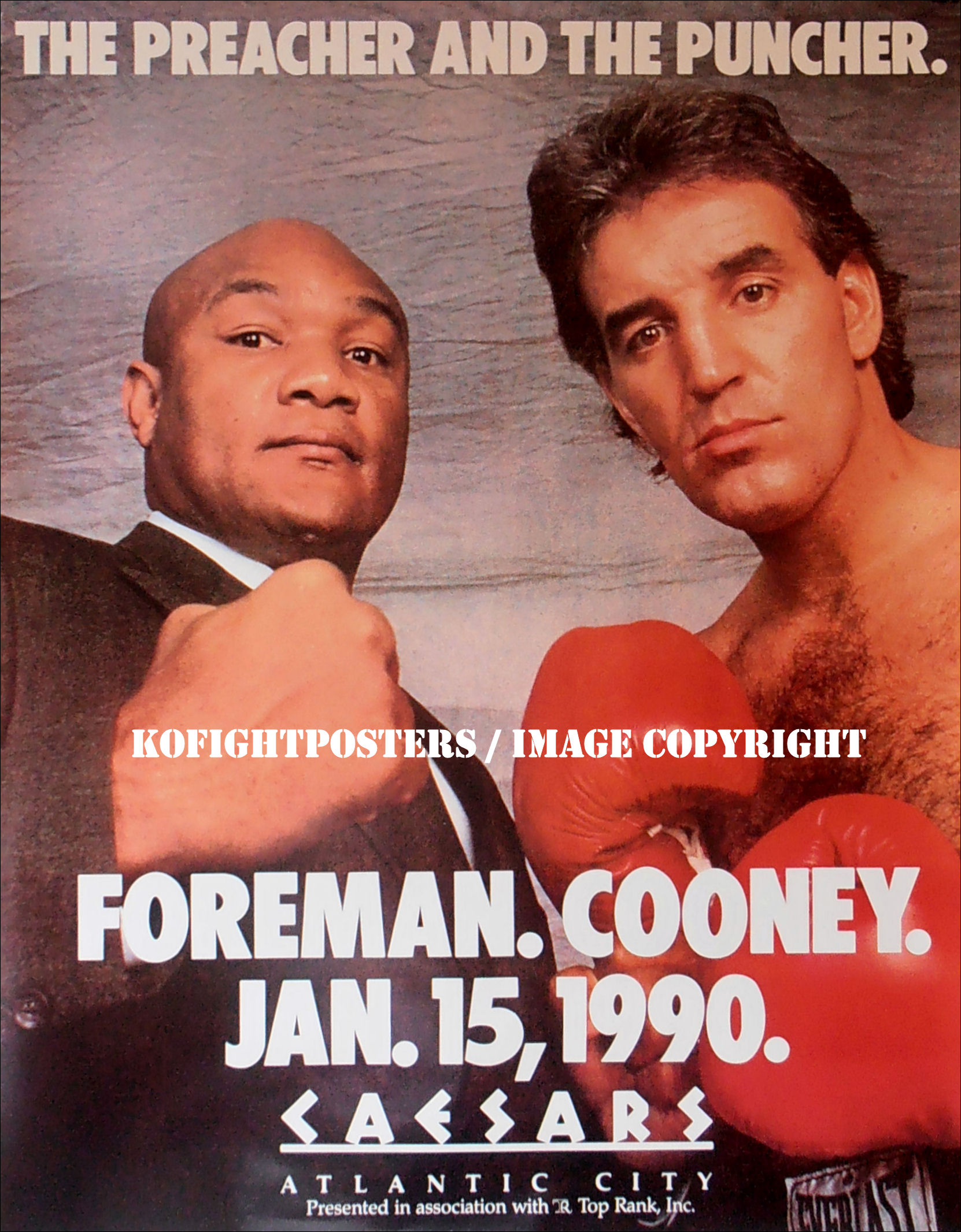 Description : Here we have an original Caesars/Top Rank closed circuit poster from the Atlantic City blockbuster showdown between George Foreman & Gerry Cooney. The fight was billed as 'The preacher & The Puncher' no one was convinced that this fight would go past 4 rounds. George Foreman's record was terrifying, George's record stood at 64 wins, two losses and an absolutely amazing 60 KOs. George had made it known he felt confident he'd take out Mike Tyson,