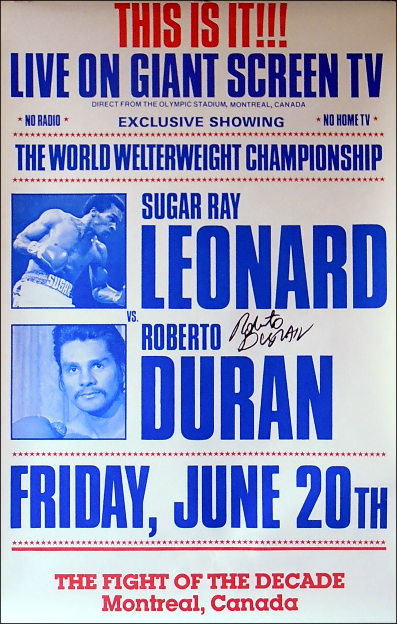 Description : Here we have the an authentic Roberto Duran signed closed circuit poster used to advertise the fight around the New York area from that most momentous & historic night in Montreal.