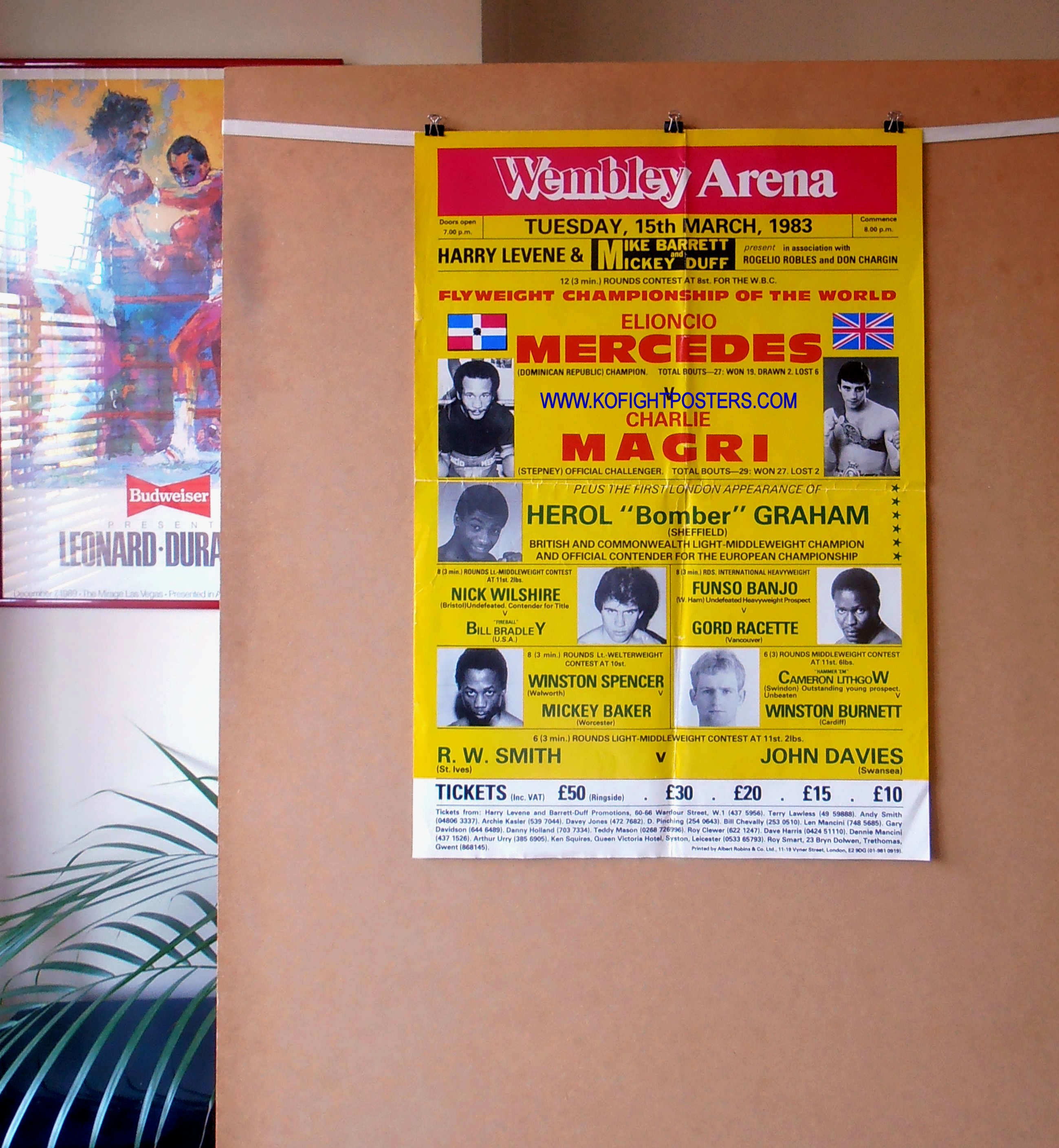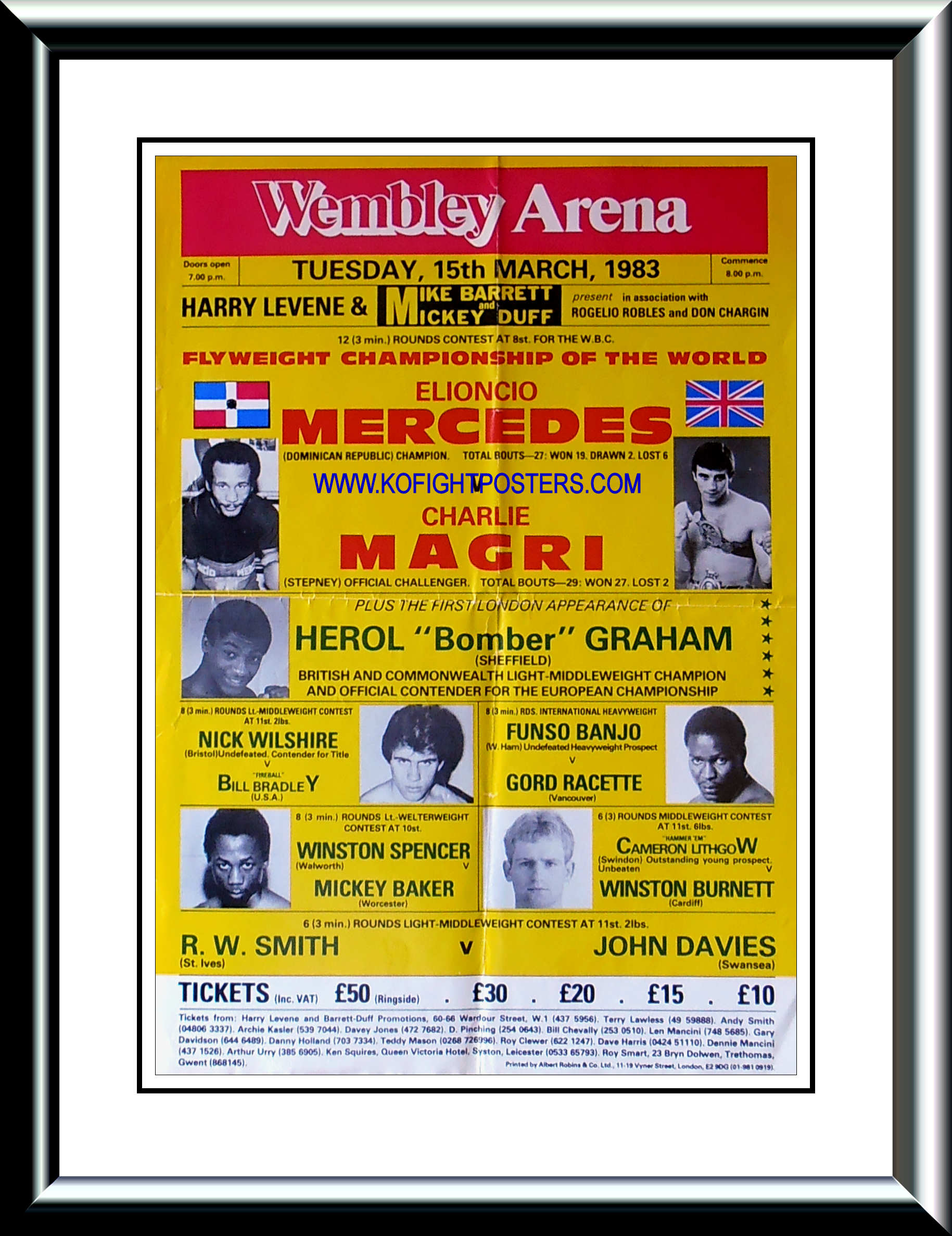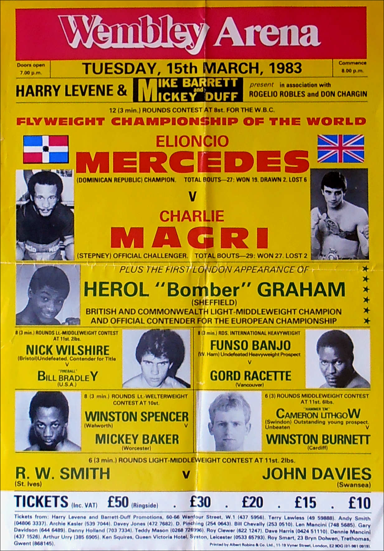 Description : Here we have an original vintage onsite poster from the Wembley Arena 15th March 1983 for the WBC Flyweight Championship of the World. Headlining the card was the ever popular British flyweight kingpin Charlie Magri getting his long awaited crack at the world title held by the Domincan champion Elioncio Mercedes. The fight was decided in the 7th round when the champion was halted on cuts. Two of the judges had Magri ahead | judge: Jean Deswert 59-56 | judge: James Jen-Kin 57-58 | judge: Marty Denkin 58-57
