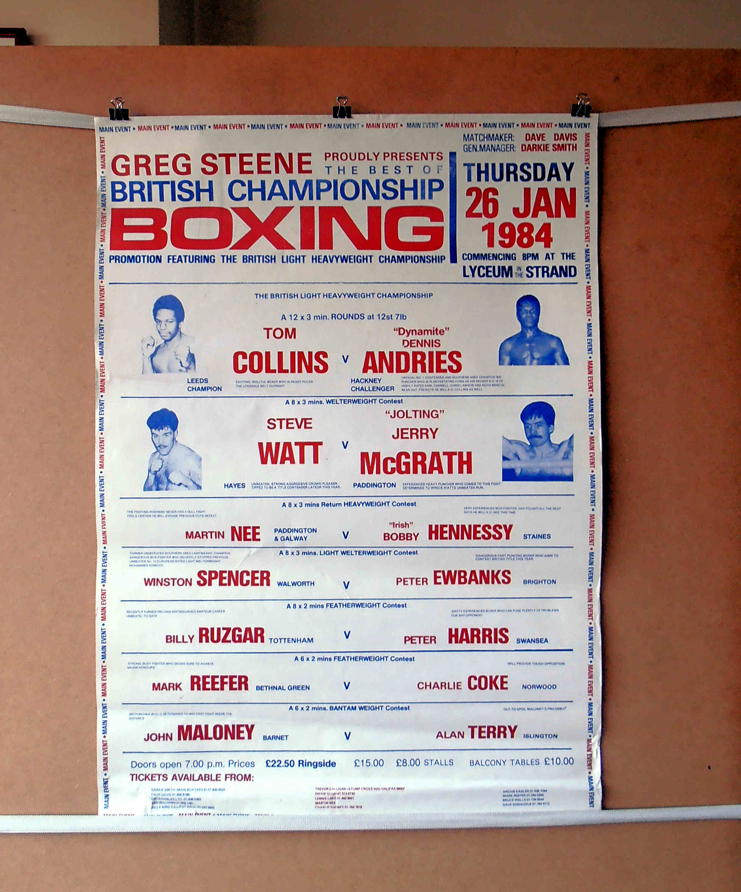Description : Here we have an original onsite poster from January 1984 from the Lyceum London for the Light/heavyweight Title clash between reigning & defending champion, the rock hard Tom Collins from Leeds England pitted against Dennis Andries (The Hackney Rock)This was the 2nd meeting between these two, with Collins holding a points decision over Andries in March 15th 1982 for the vacant British Light/Heavyweight Title over the then 15 round coarse. This was to be Andries night winning the title on points over 12 rounds to become the new British Light/Heavyweight King.