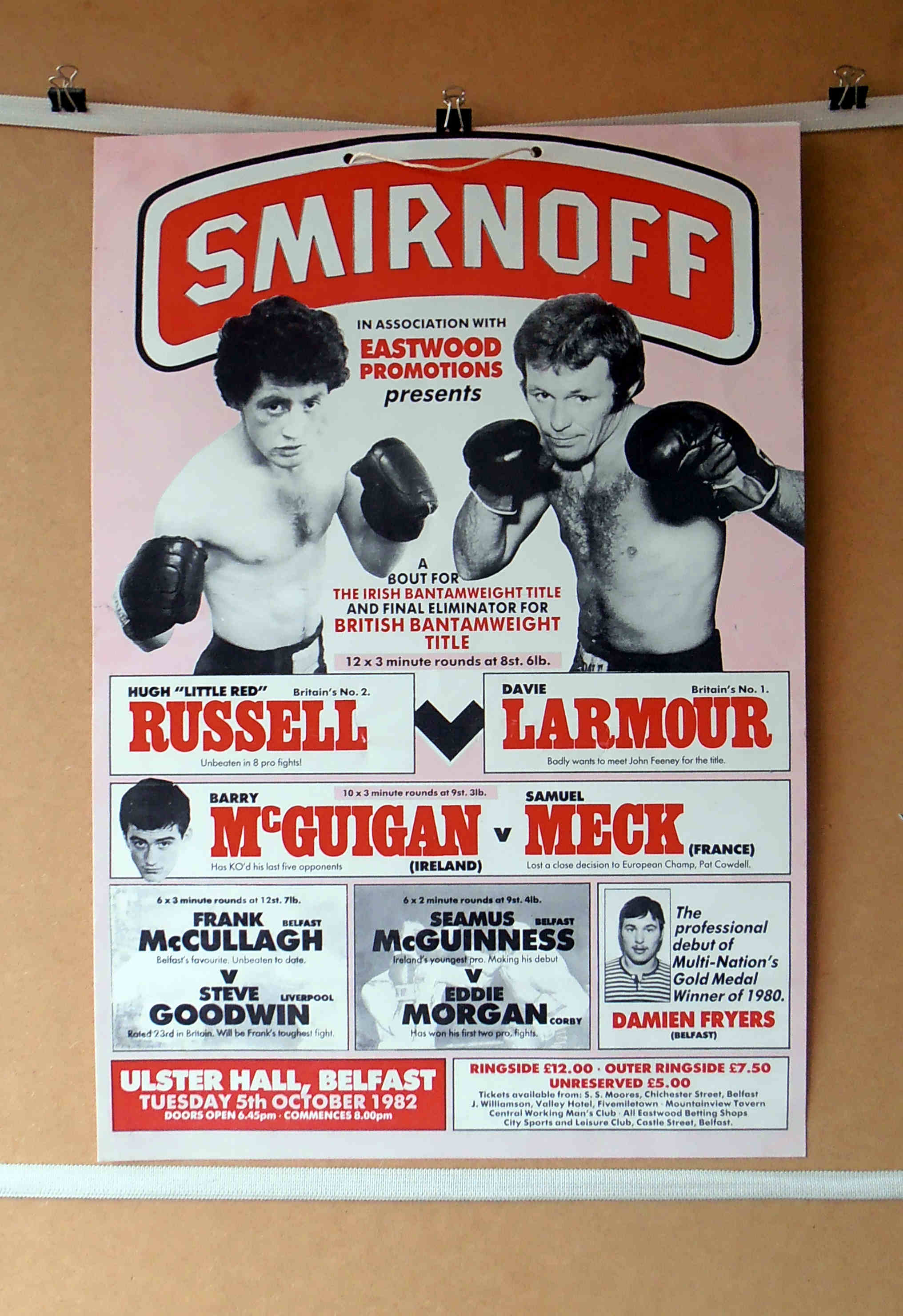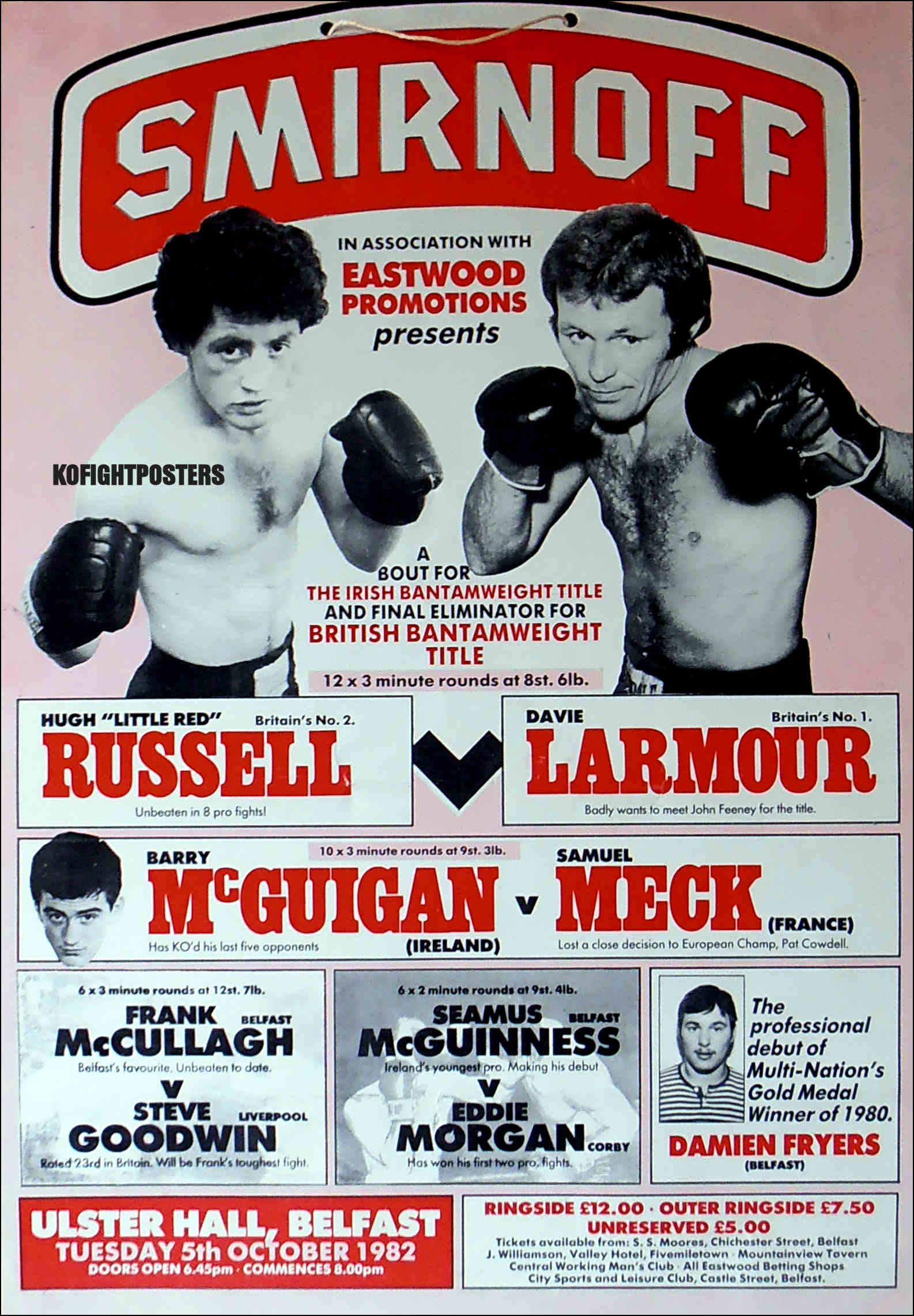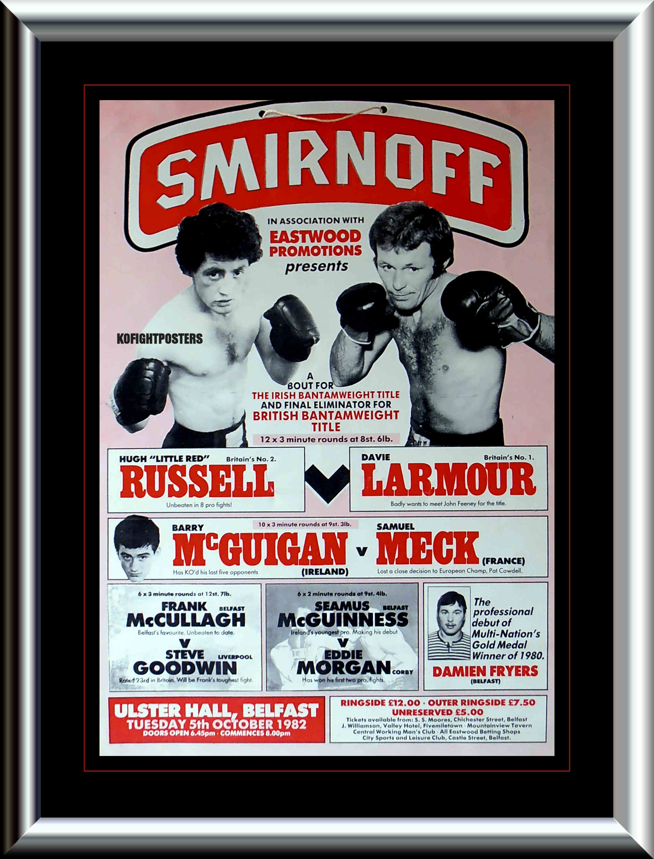 Description : Here we have a super rare vintage fight poster from Barney Eastwood promotions from Tuesday, October 5th 1982 at the Ulster Hall, Belfast, Northern Ireland, for the Irish bantamweight title & vacant BBBofC Northern Ireland Area bantamweight title. Featuring Britain's number 1 ranked bantamweight contender Davie Larmour pitted against Britain's number 2 ranked bantamweight contender Hugh 'Little Red' Russell for the right to challenge for John Feeney's British bantamweight crown. This contest was settled by decision over 12x3's by the referee: Mike Jacobs 117-116 in favor of Hugh Russell. This is the only poster I've ever seen from this fight, not many produced & even less still in one piece.