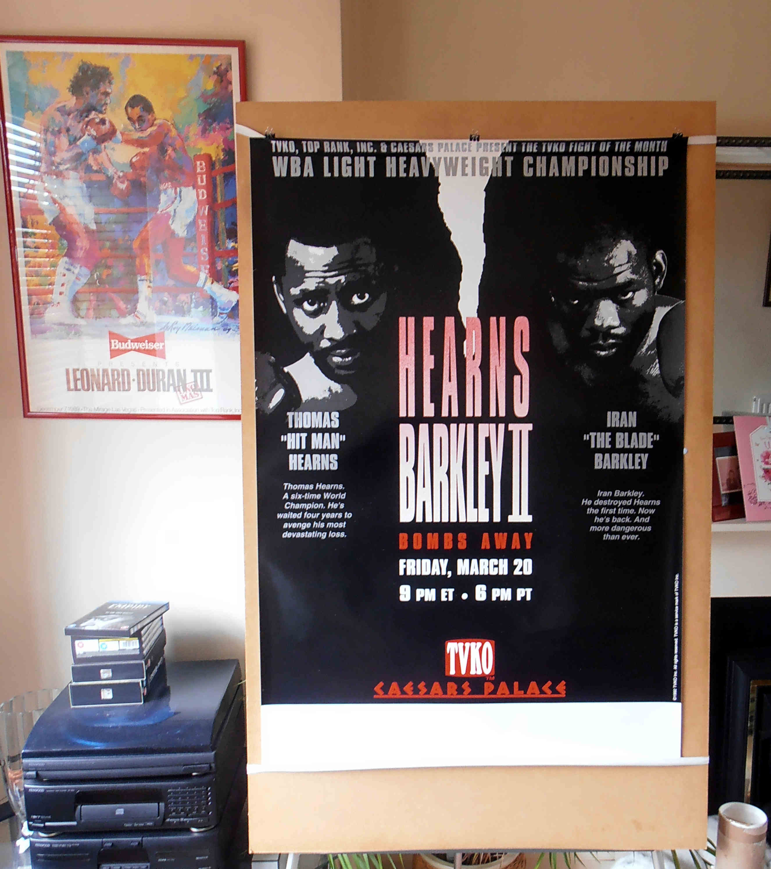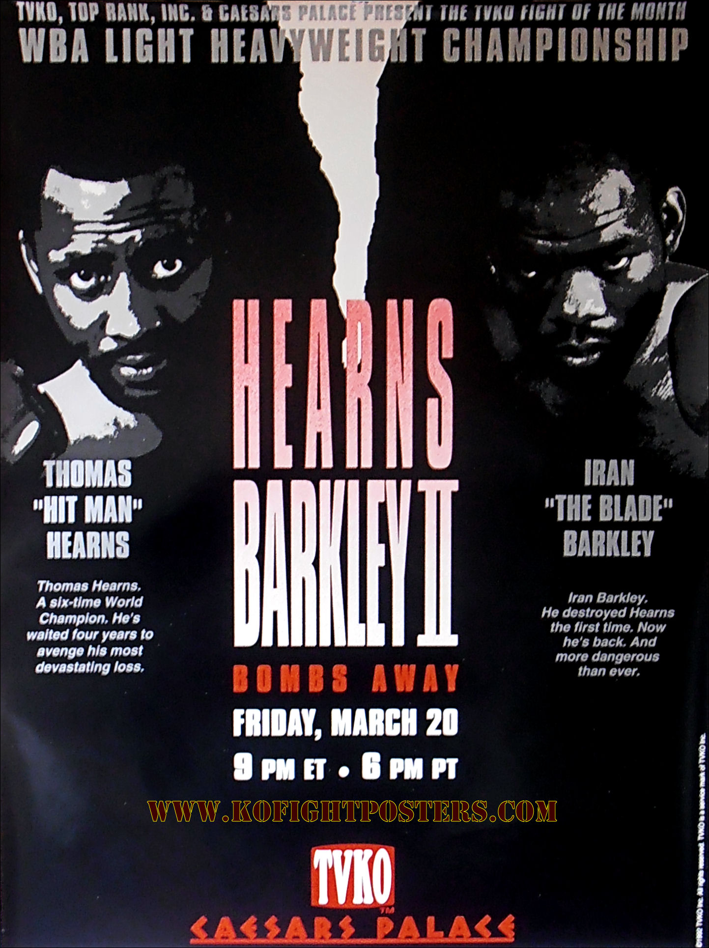 Description : Here we have an original full size TVKO pay-per-view poster for the rematch held on Friday March 20th 1992 at Caesars Palace Las Vegas between old foes Thomas 'Hitman Hearns vs. Iran 'The Blade' Barkley. This time the belt on the line was for Tommy Hearns WBA Light/Heavyweight World Title.