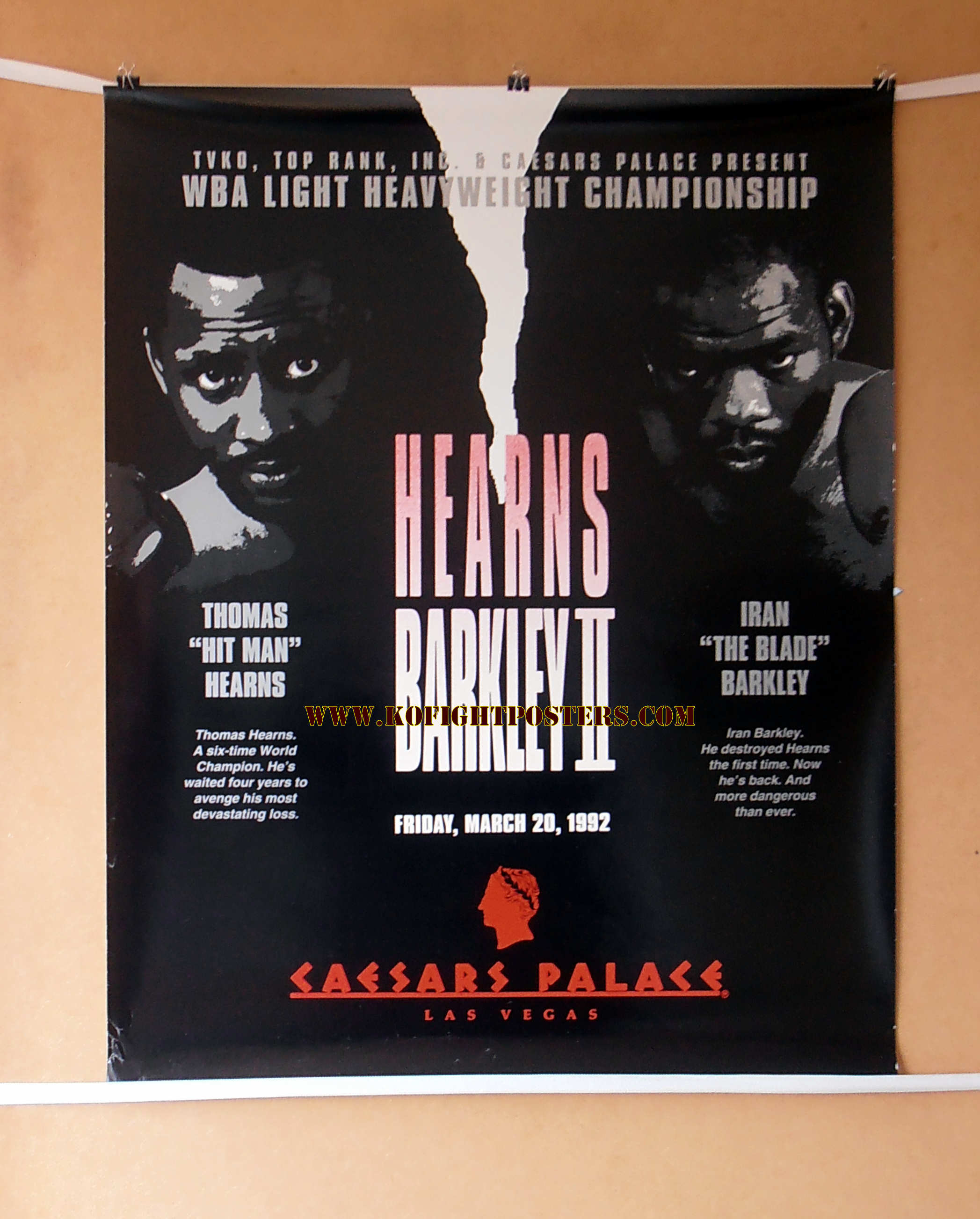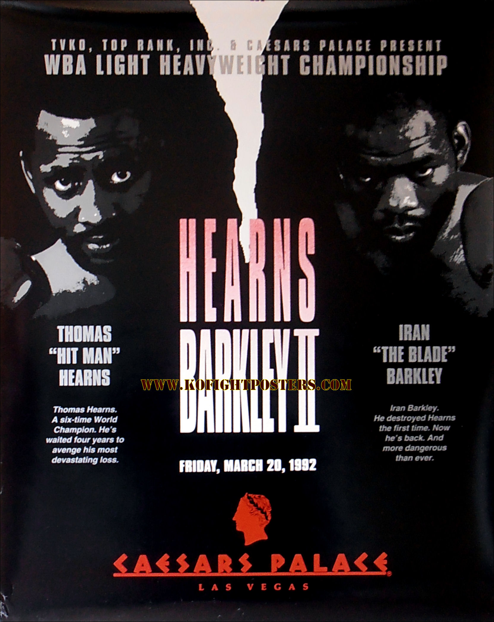 Description : Here we have an original onsite boxing fight poster for the rematch held on Friday March 20th 1992 at Caesars Palace Las Vegas between old foes Thomas 'Hitman Hearns vs. Iran 'The Blade' Barkley. This time the belt on the line was for Tommy Hearns WBA Light/Heavyweight World Title.