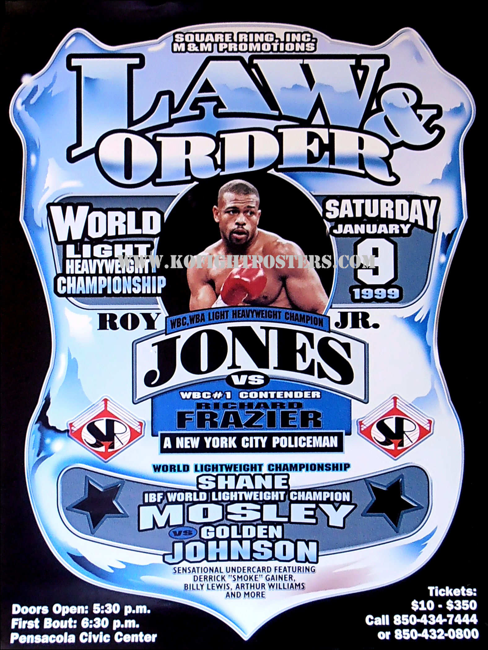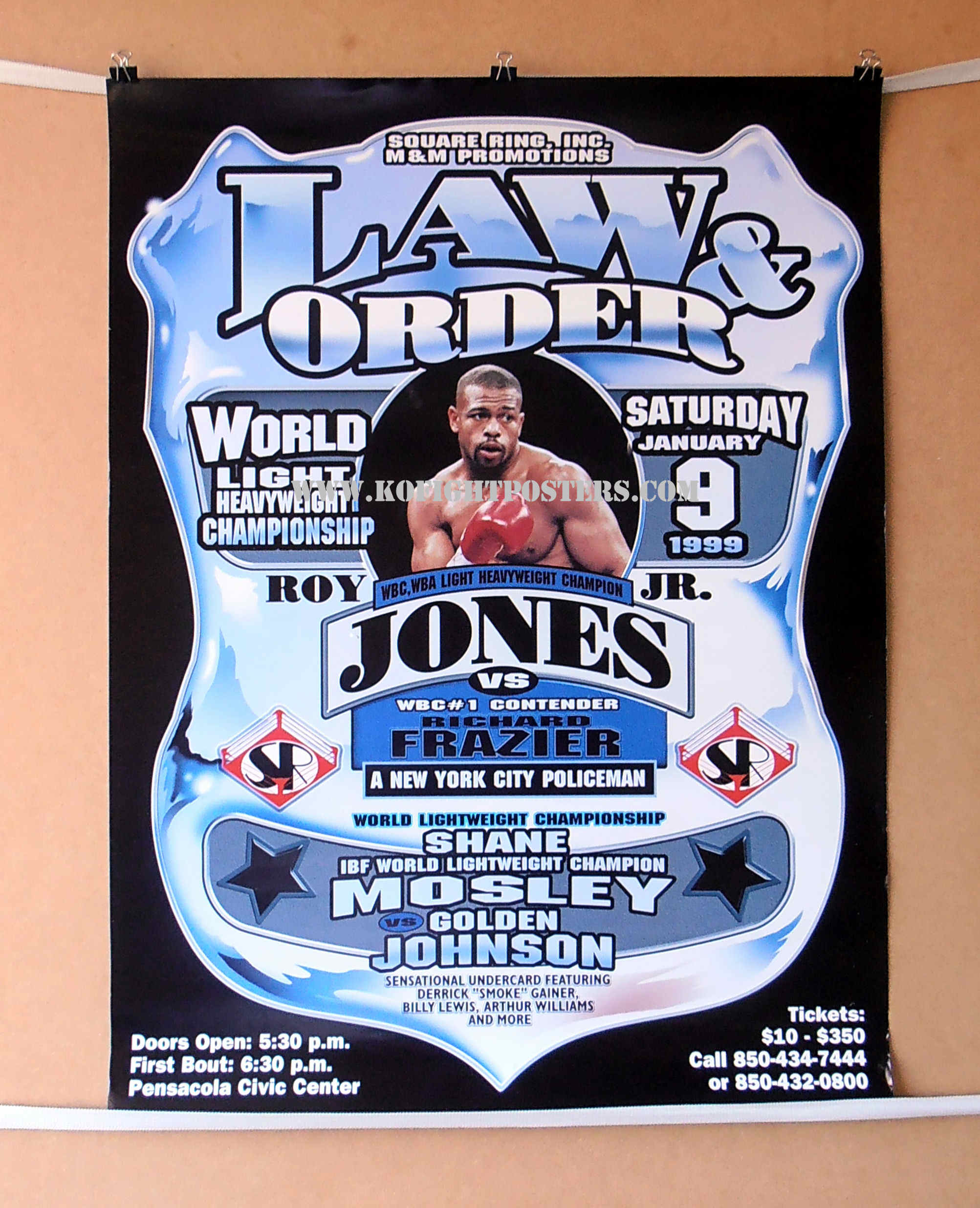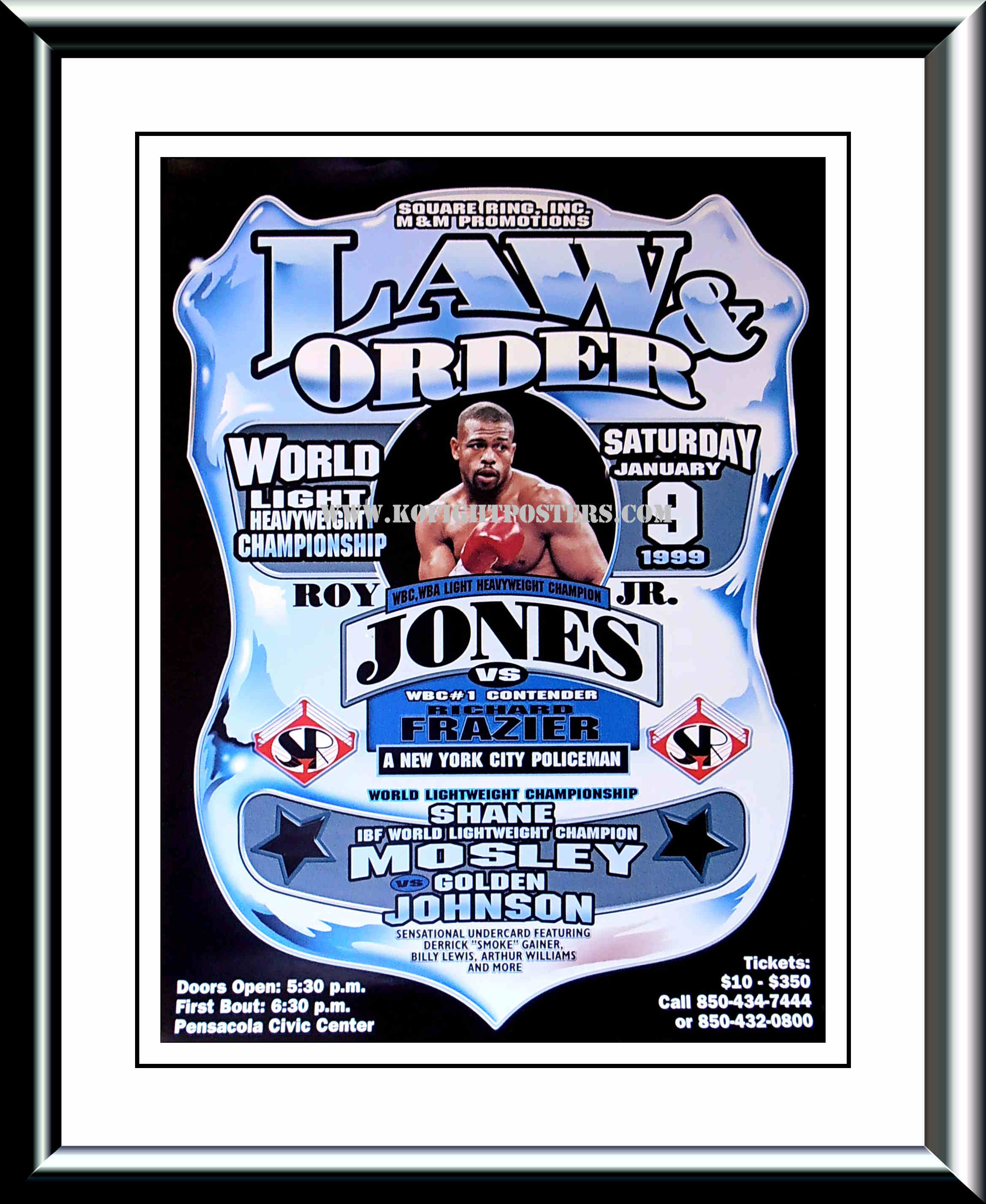 Description : Here we have an original onsite fight poster from the Pensacola Civic Center, Saturday 9th January 1999 for the WBC/WBA Light/Heavyweight Title between defending champion Roy Jones Jr & the WBC's mandatory number 1 ranked challenger Richard Frazier.