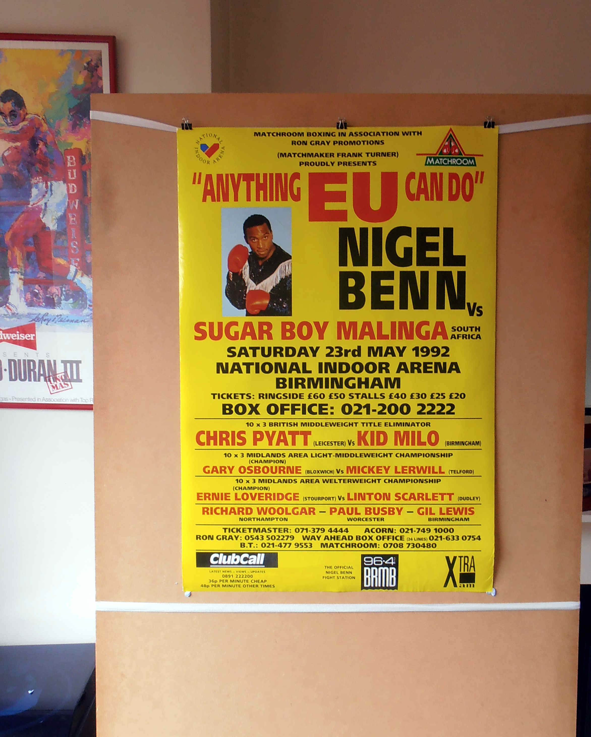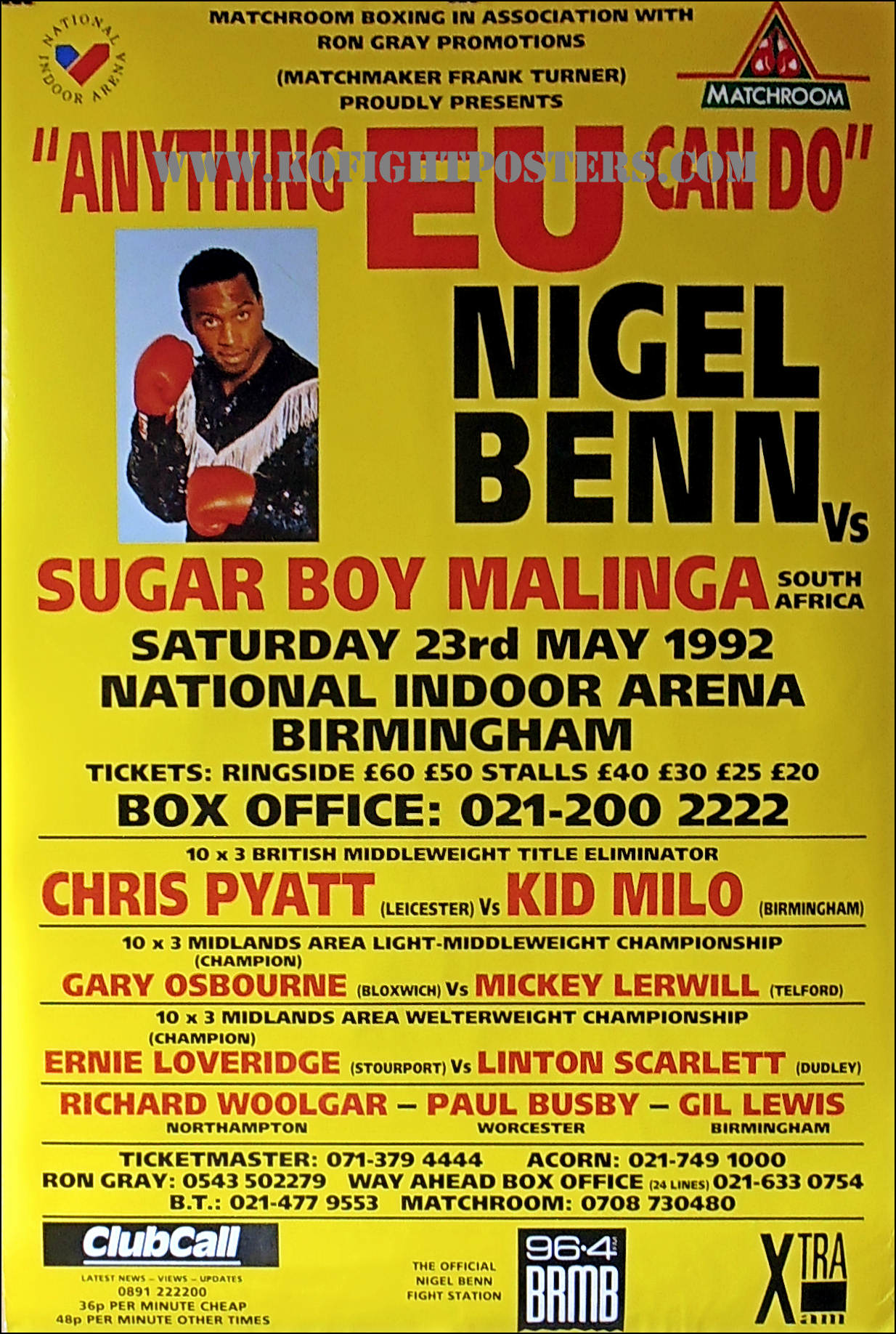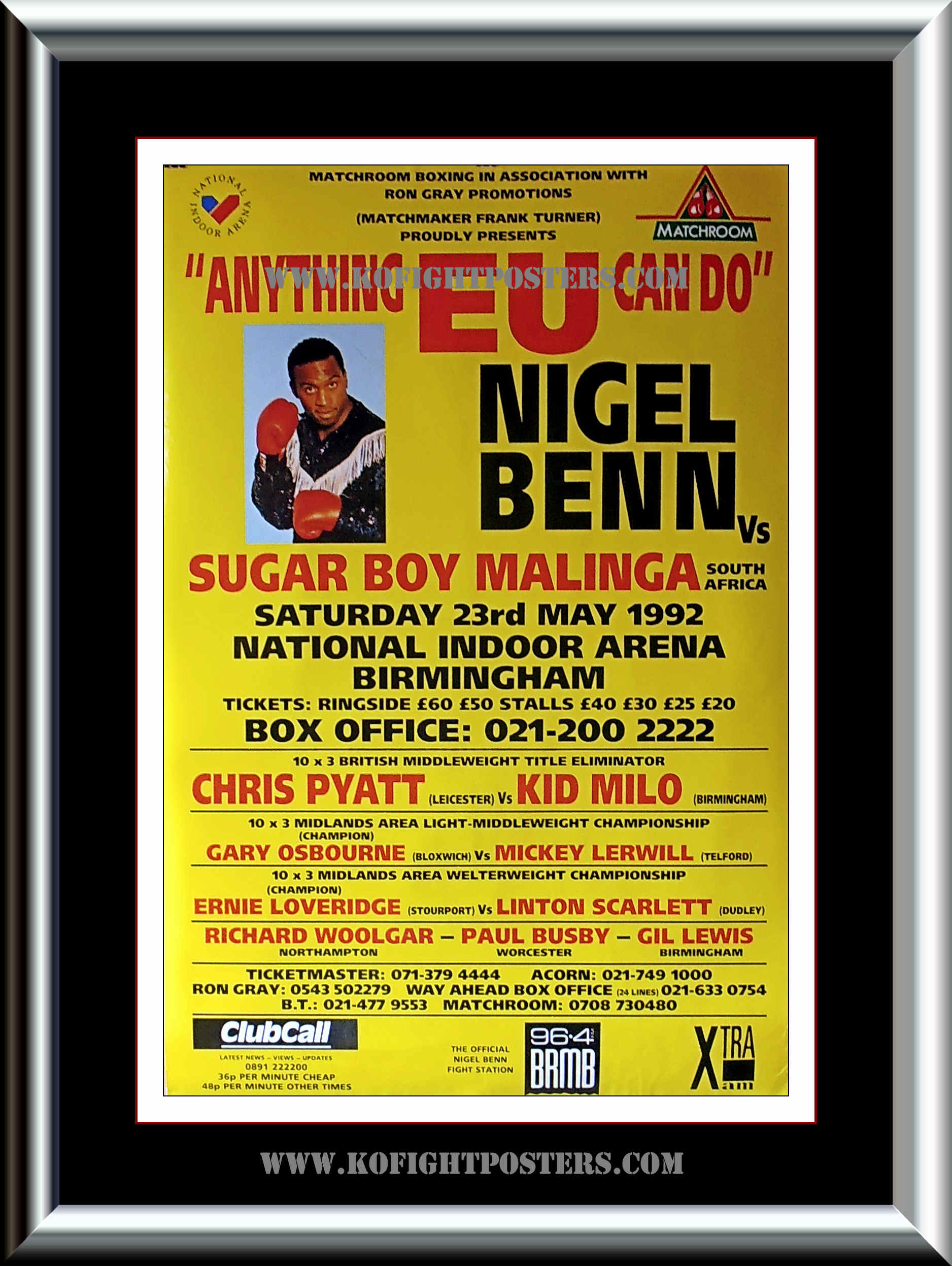 Description : Here we have an original rare Matchroom Boxing promotional poster from the National Indoor Arena, Birmingham England. After losing his WBO Middleweight Crown to arch foe Chris Eubank, Benn would move up a division to seek another title shot at Super/Middleweight. This being his 6th fight at the weight, pitting Benn against the South African Thulani 'Sugar Boy Malinger' over 10 x 3 minute rounds. Benn was awarded a hotly contested decision by referee Paul Thomas who scored the bout 98-97 in favour of Benn.