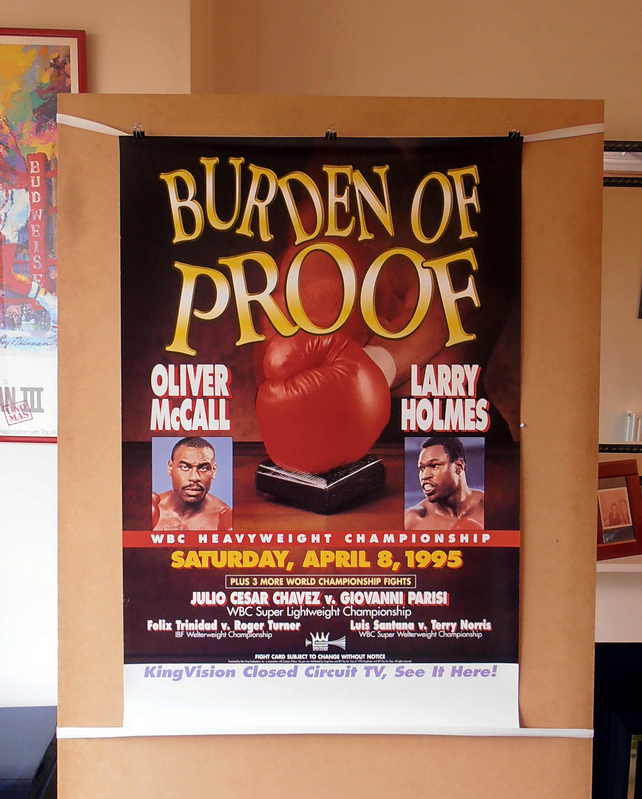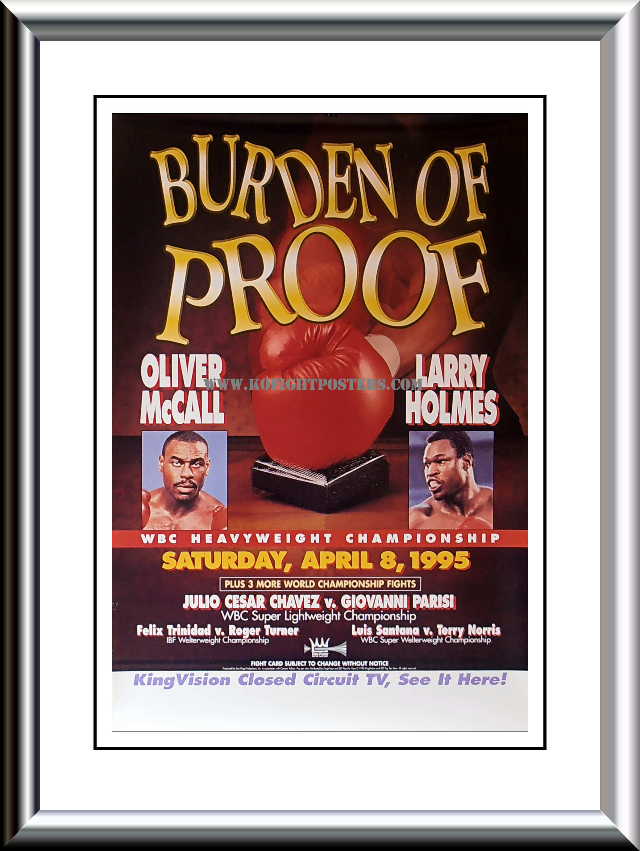 Description : Here we have an original (Kingvision) closed circuit poster from Caesars Palace, Las Vegas, Nevada, USA, 8th April 1995, for the WBC Heavyweight Title fight between reigning & defending champion Oliver 'Atomic Bull' McCall & challenger, former WBC heavyweight king, Larry Holmes.