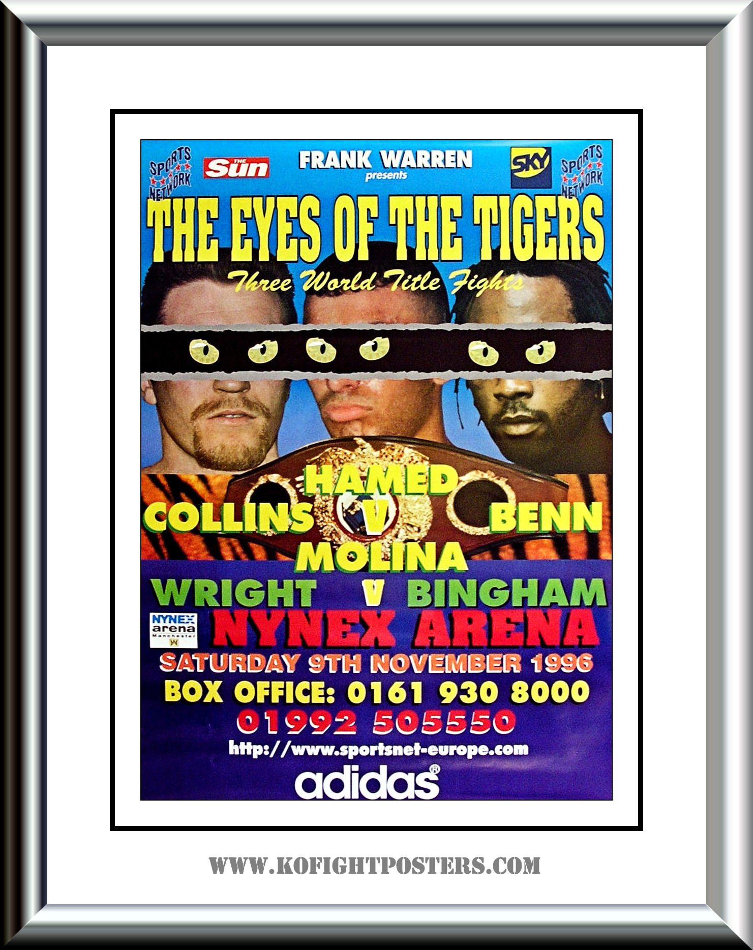 Description : Here we have an original frank warren promotional poster for the WBO world featherweight title bout held at Nynex Arena, Manchester, England on 9th November 1996.
