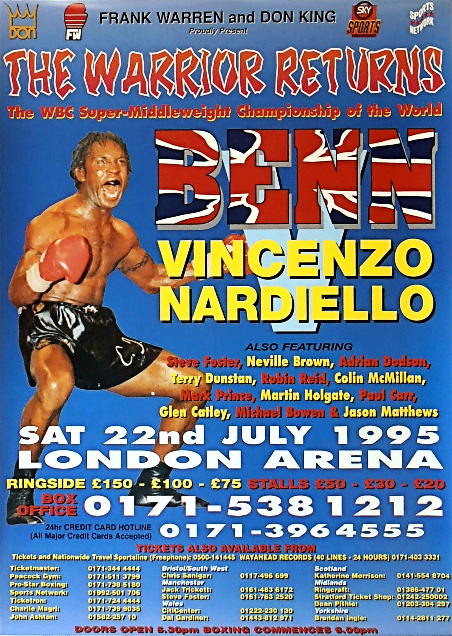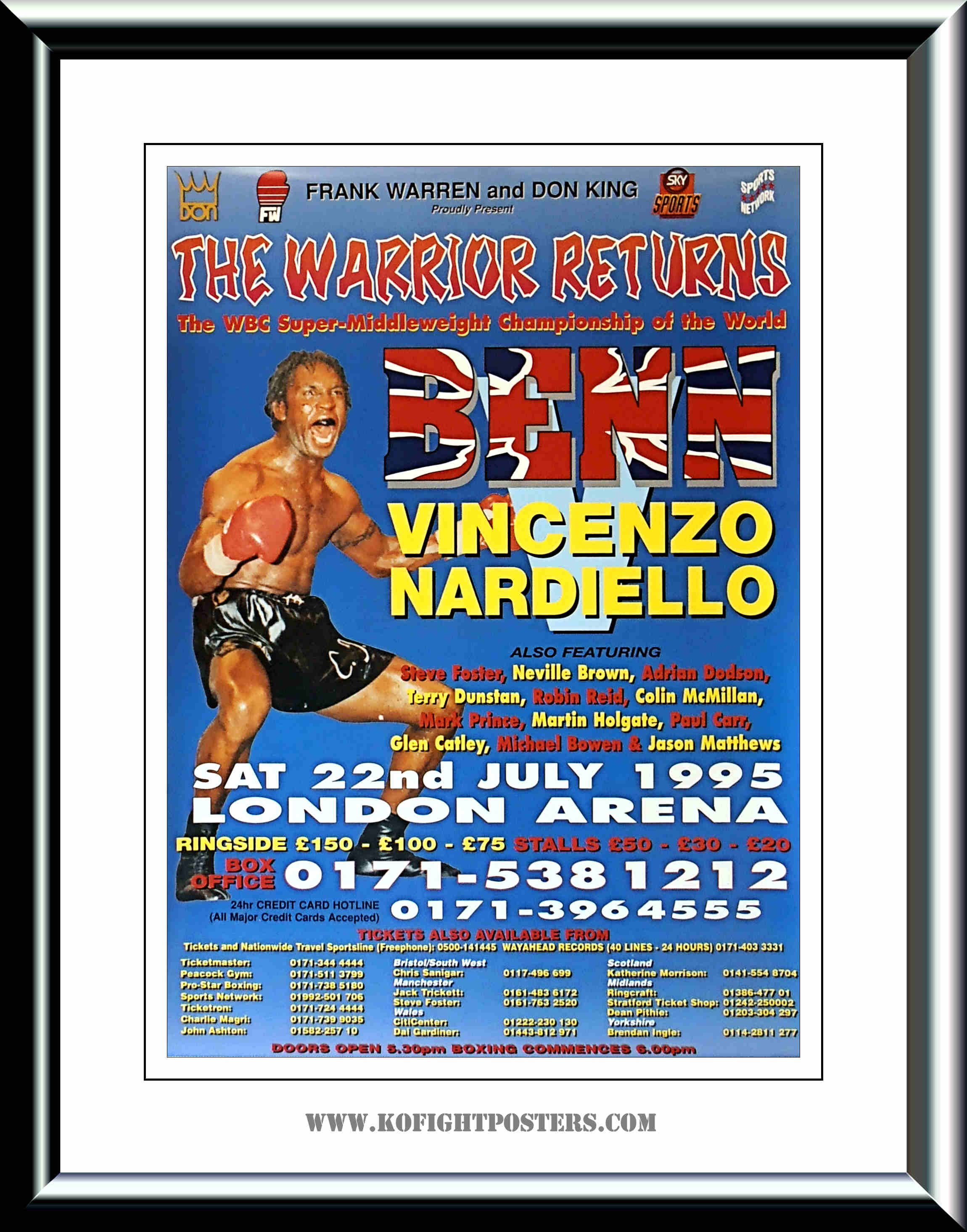 Description : Here we have an original Frank Warren & Don King promotions poster for the WBO Super/middleweight title bout held at London Arena, London, England This was Benn's 1st fight back in the ring after his incredible victory over Gerald McClellan 5 months earlier, billed "The Warrior Returns," 22nd July 1995. Nigel benn retained his WBC Super/middleweight title by 8th round TKO over the Italian challenger, Benn was well ahead on two of the scorecards at the time of the stoppage | judge: Alfred Asaro 68-64 | judge: Carol Castellano 68-63 | judge: Rolando Barrovecchio 67-66