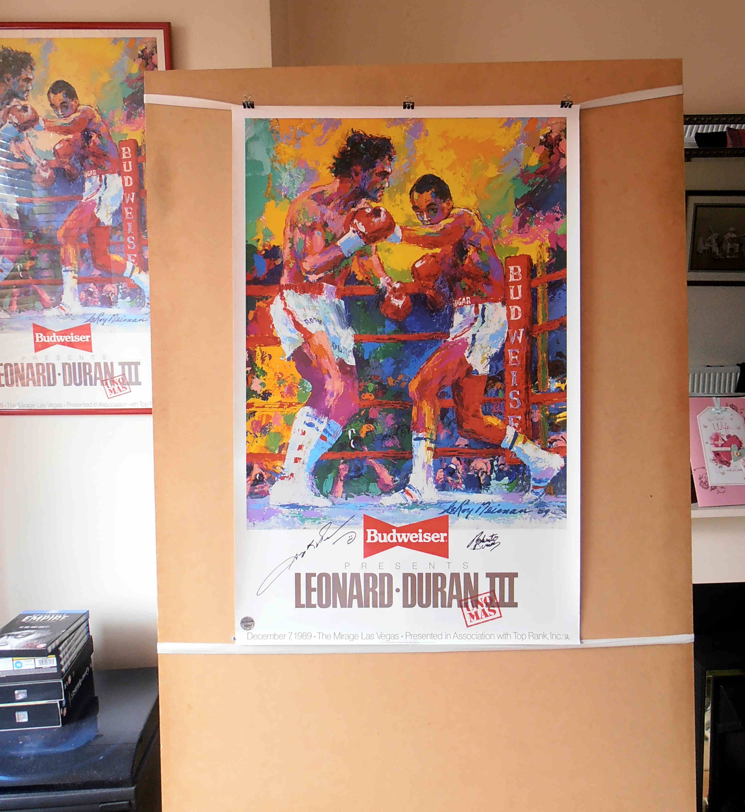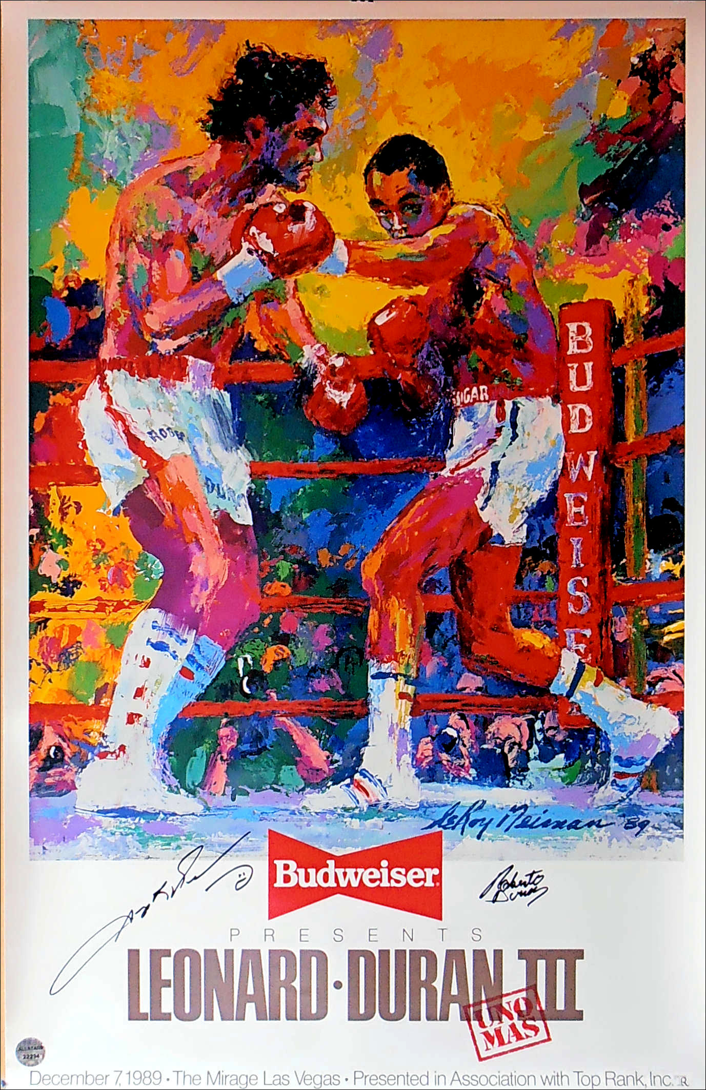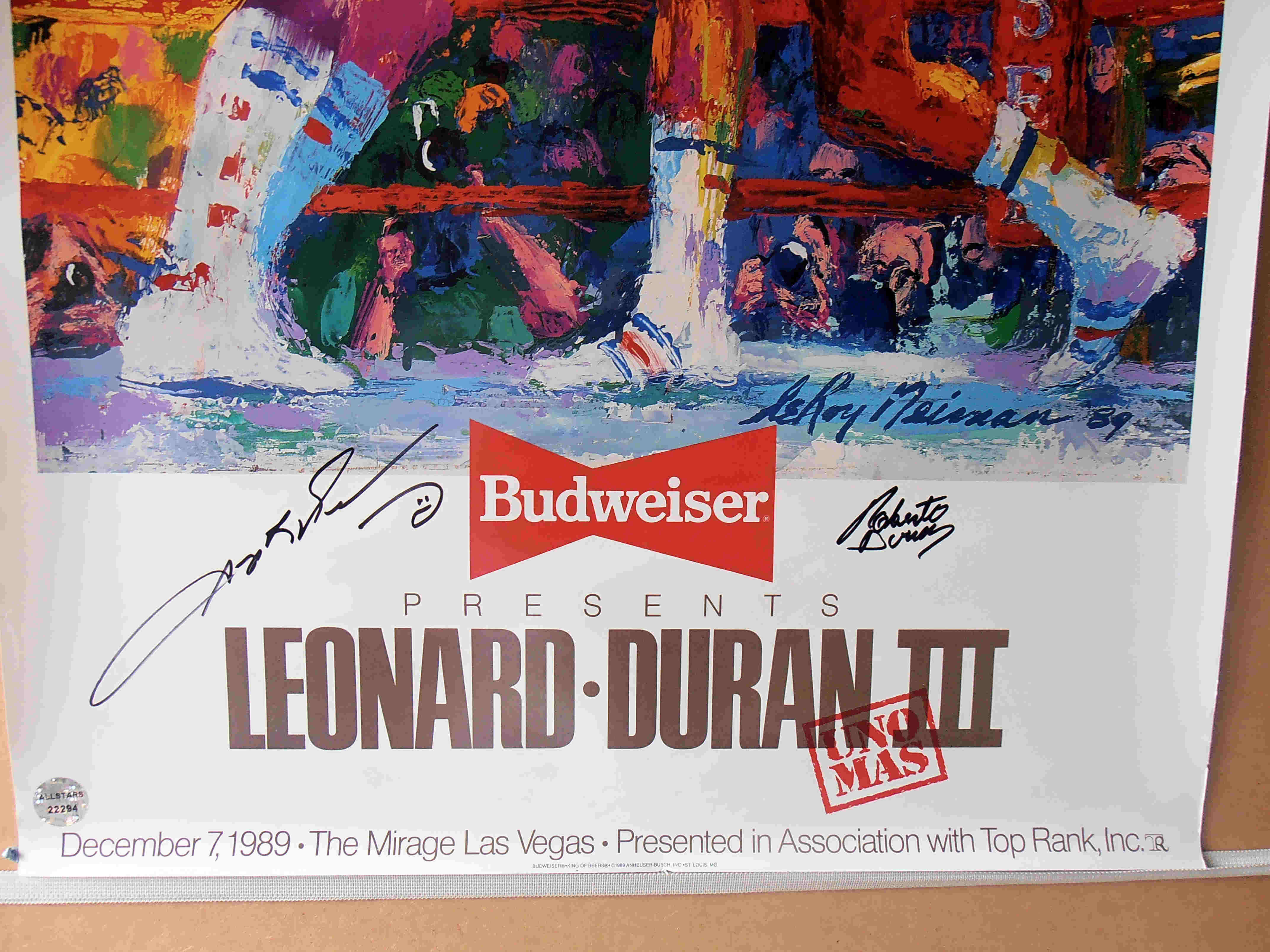 Description : Here we have an original Budweiser official fight sponsors poster from the 3rd fight that has been signed by Roberto Duran & Sugar Ray Leonard. This fabulous poster was designed/painted by the late, great world famous sports artist Leroy Neiman, he captured the tempo of battle from that historic night in Montreal.