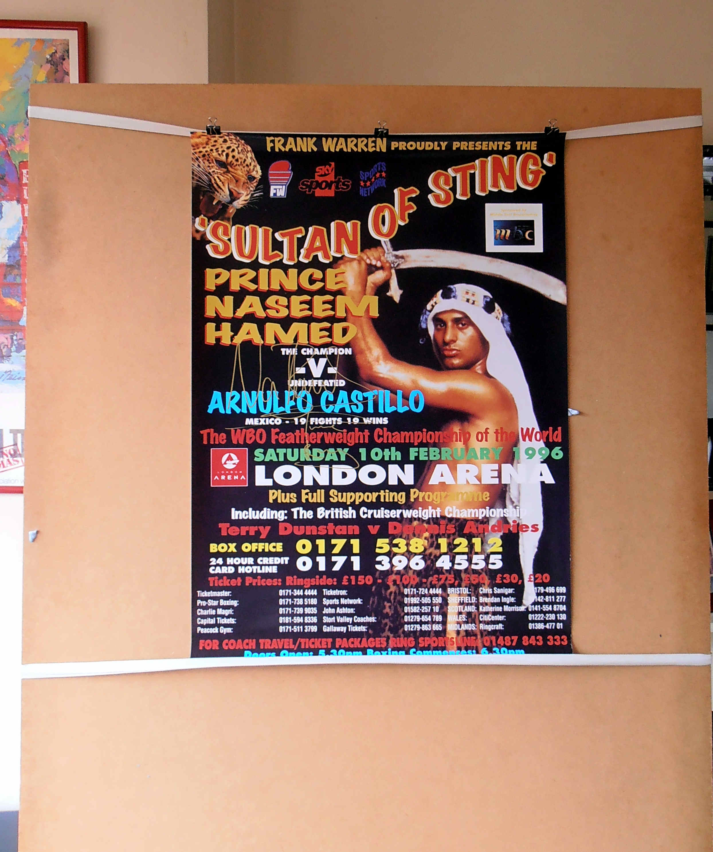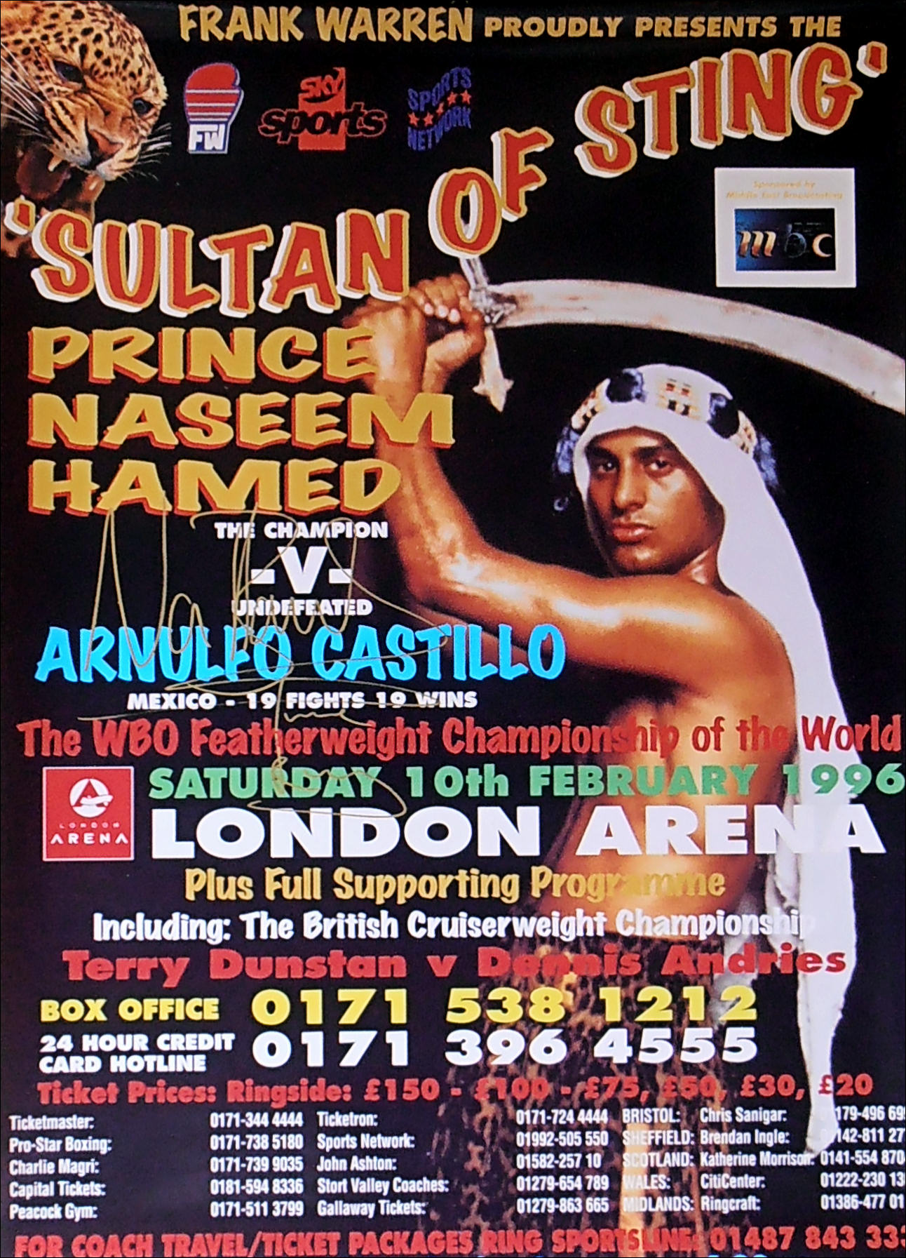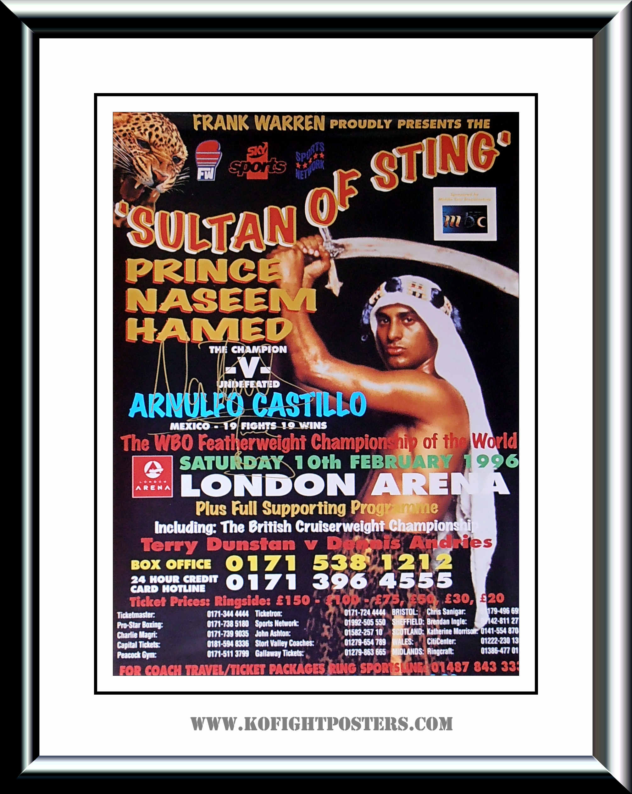 Description : RARE Naseem Hamed vs Arnulfo Castillo CANCELLED original fight poster for the WBO featherweight World title against undefeated Castillo (19-0) SIGNED (gold sharpie) and INSCRIBED "The Prince" by former World featherweight champion Naseem Hamed, billed "Sultan Of Sting", the fight was due to take place on 10th February 1996, London Arena, London, but was cancelled due to an injury to Hamed's right hand.