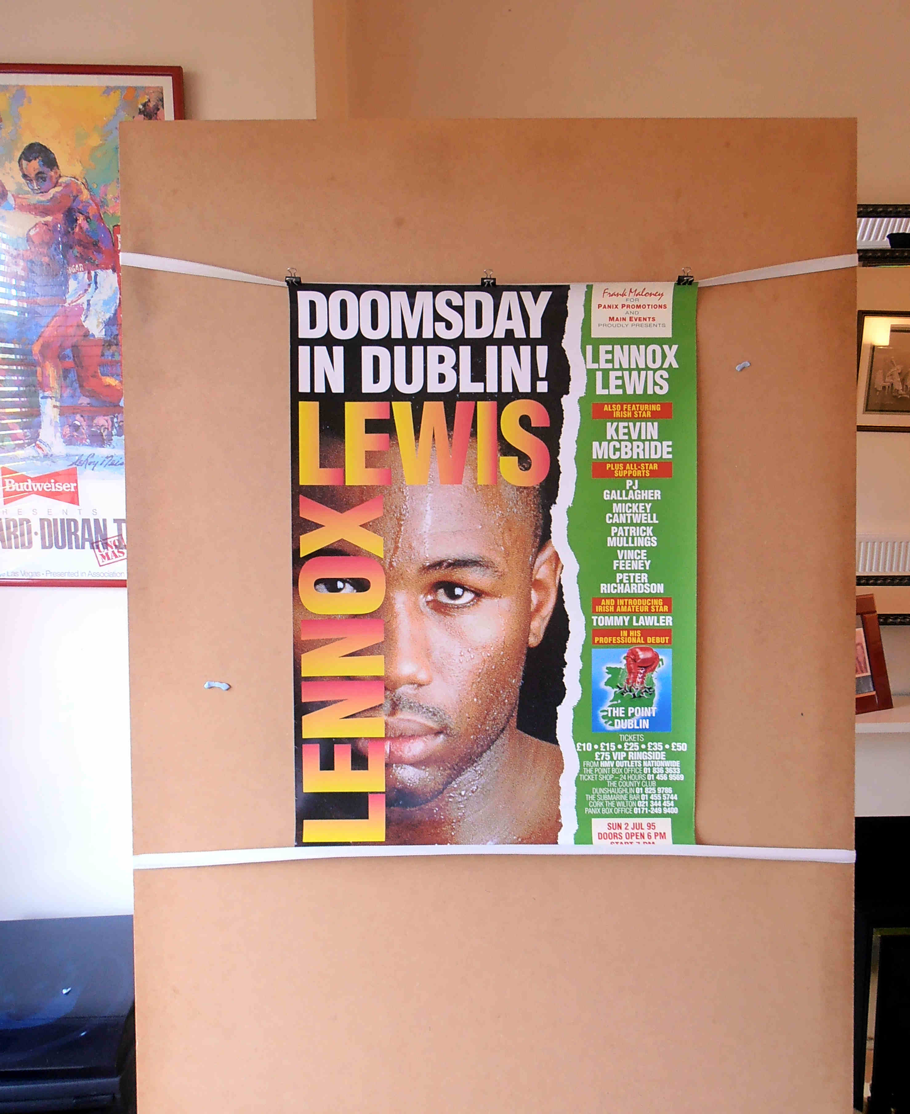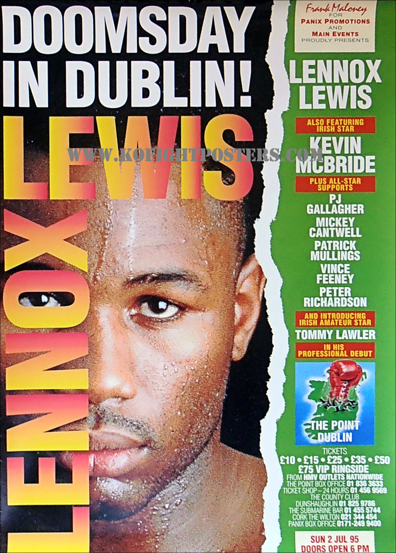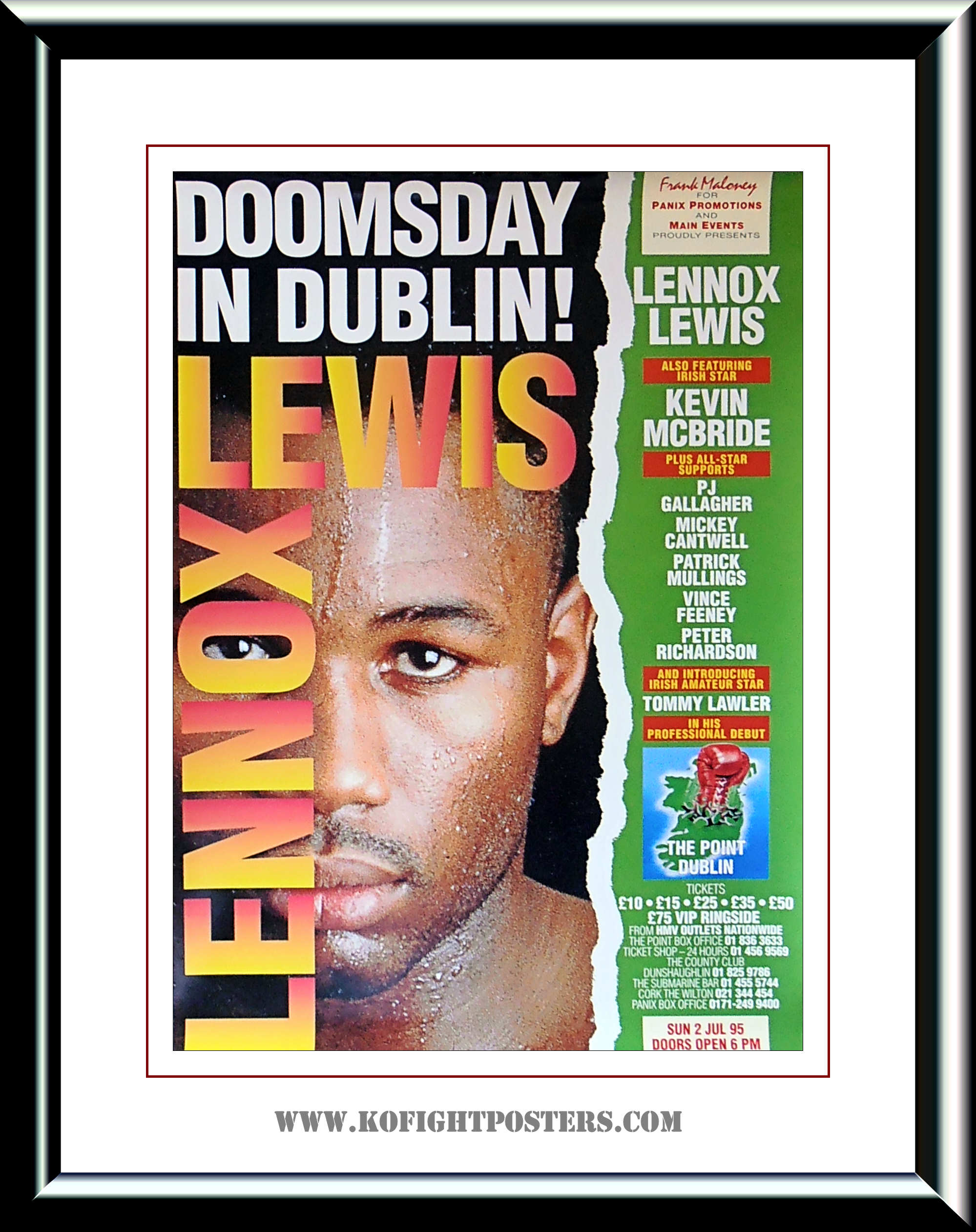 Description : Here we have an original main event promotional poster for the heavyweight bout between WBC number 1 contender, Lennox Lewis vs. Justin Fortune, on July 2nd,1995 at the The Point, Dublin, Ireland.